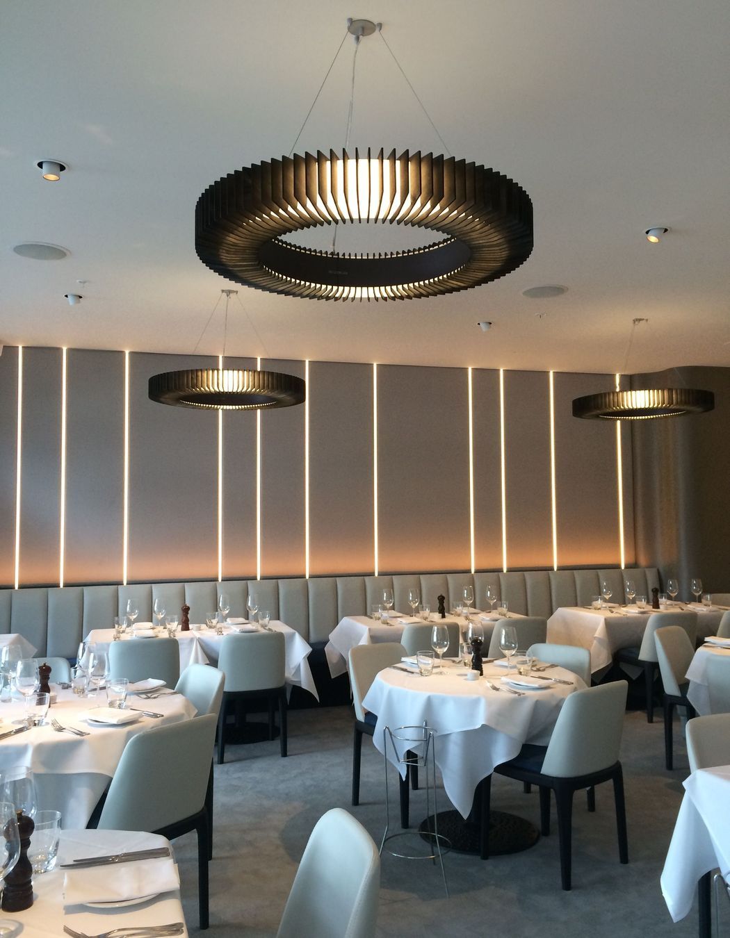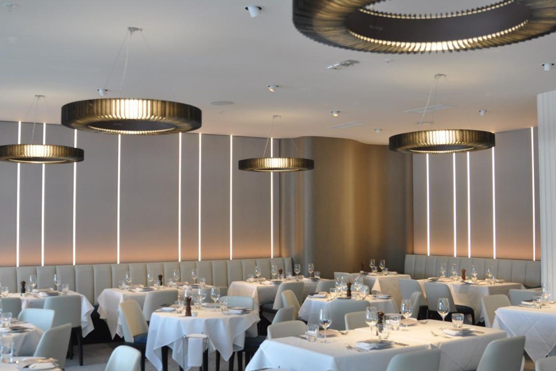 ArchiPro Project Summary - Soul Bar features sophisticated Fin lights and a captivating LED wall installation, designed by James Russ, creating an elegant and inviting atmosphere for diners.