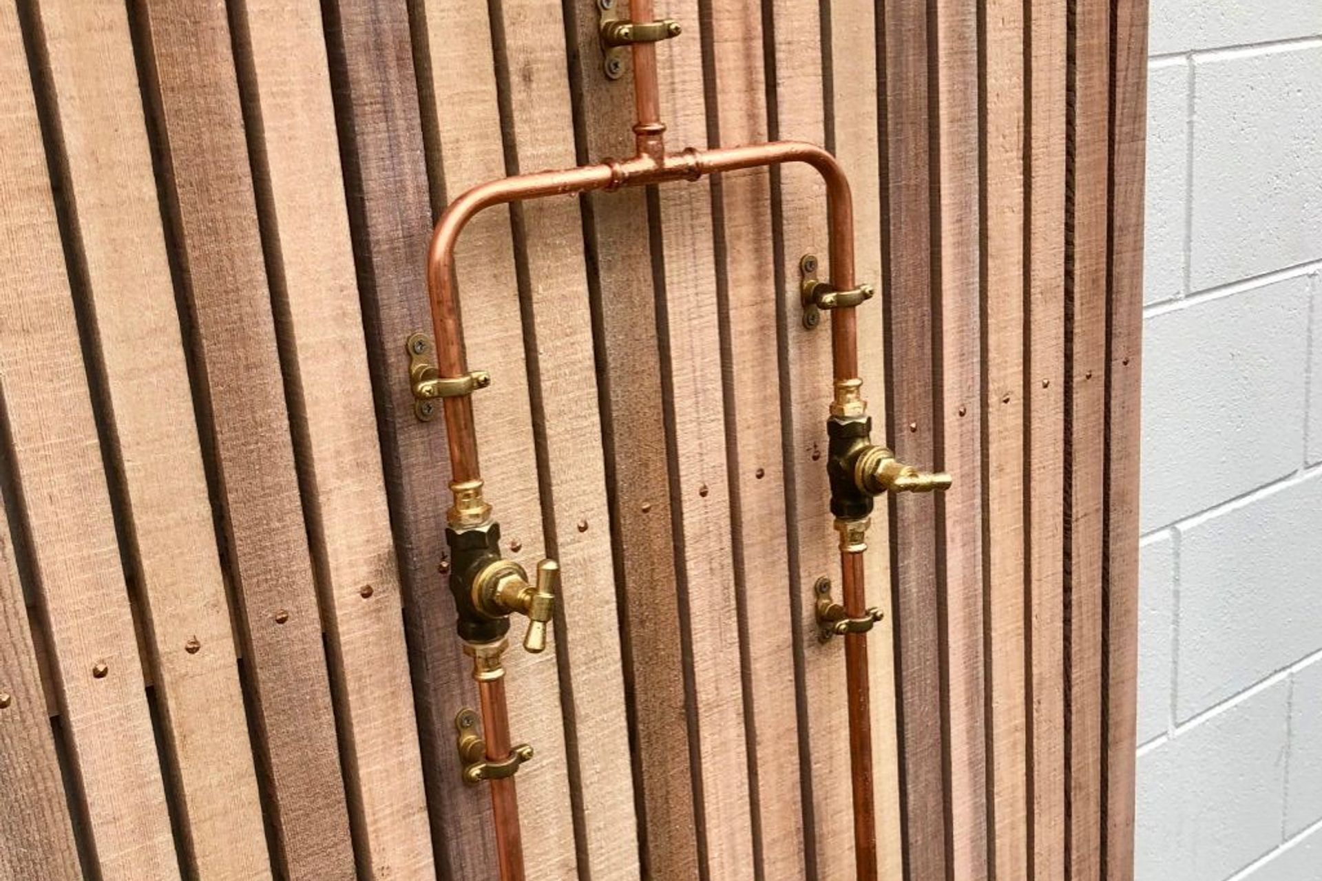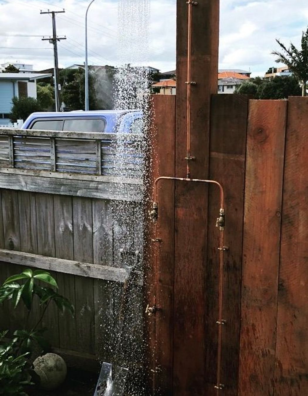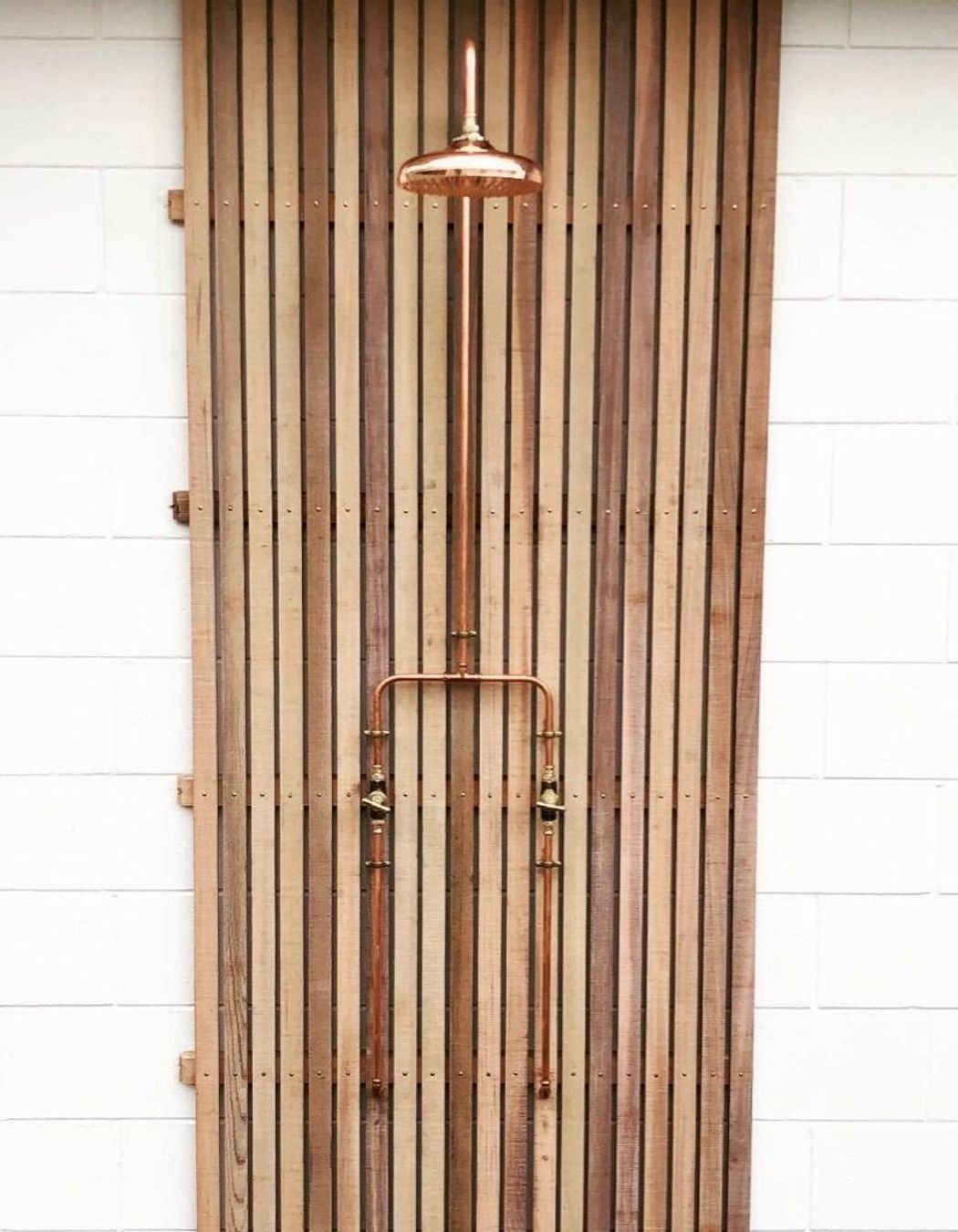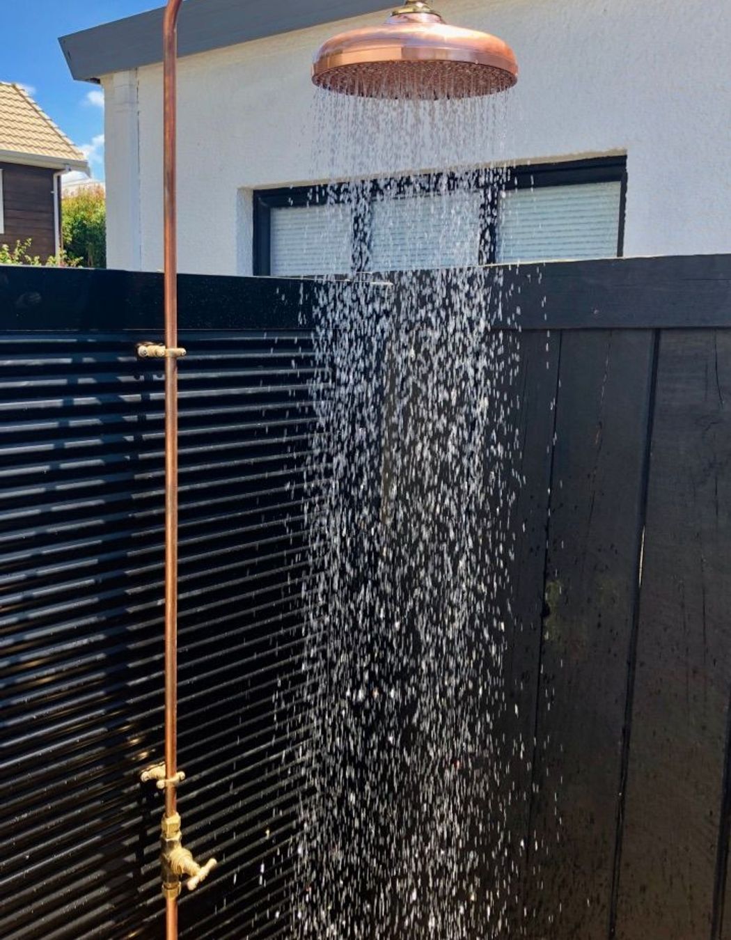 ArchiPro Project Summary - Luxurious outdoor shower installation in Mount Maunganui featuring a 250mm heritage bathware copper shower, Methven exposed shower taps, and sleek rustic copper pipework for an elevated post-swim experience.