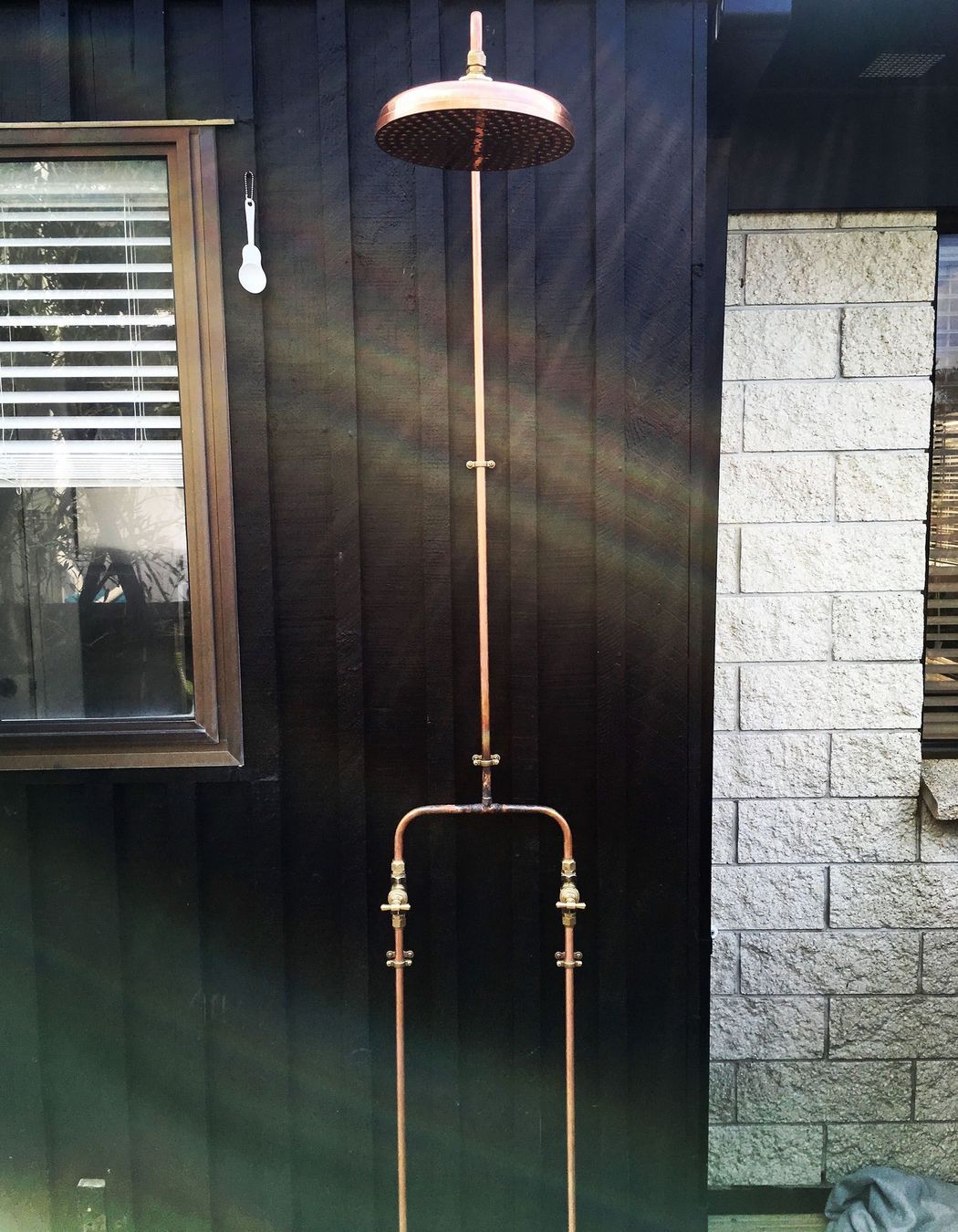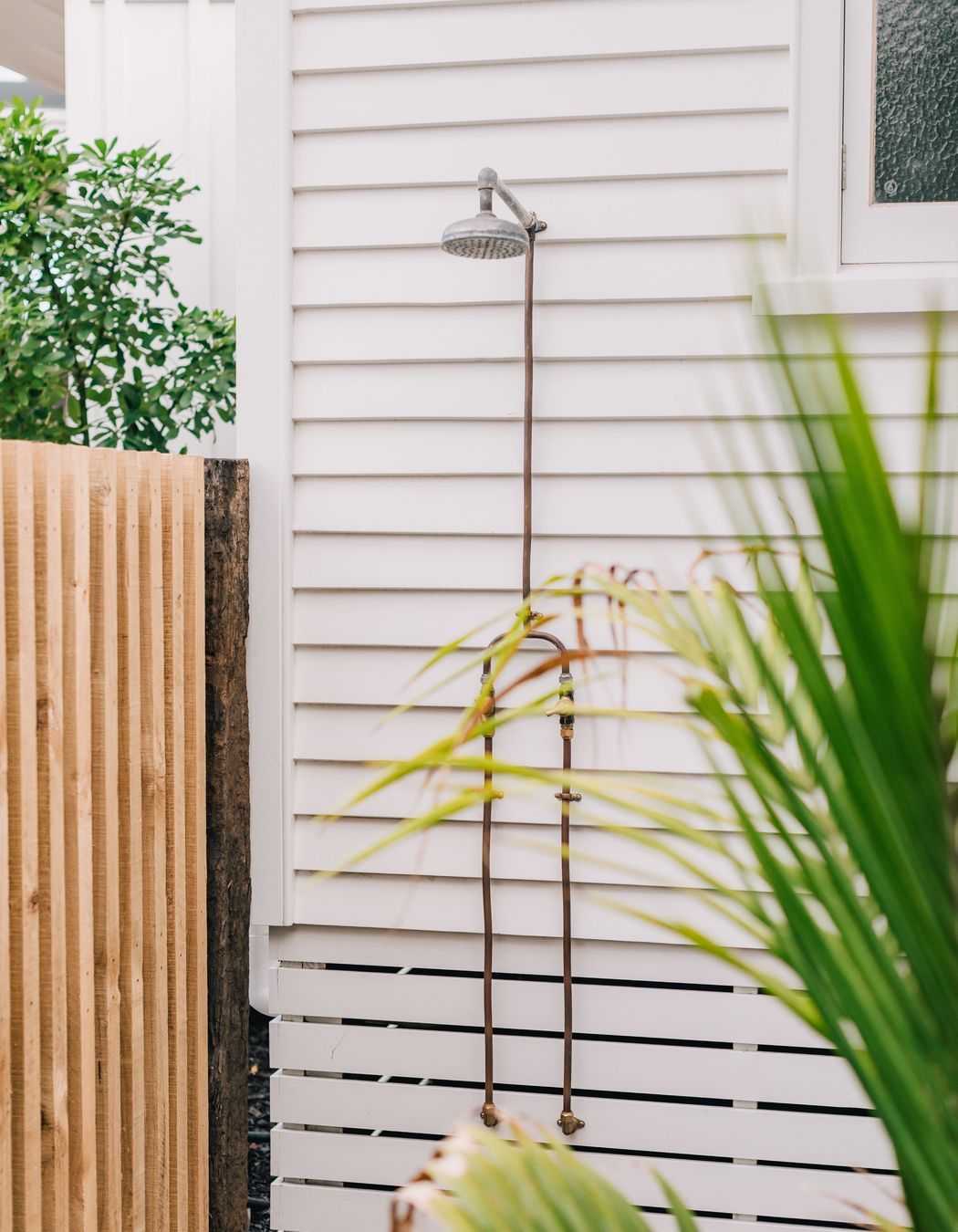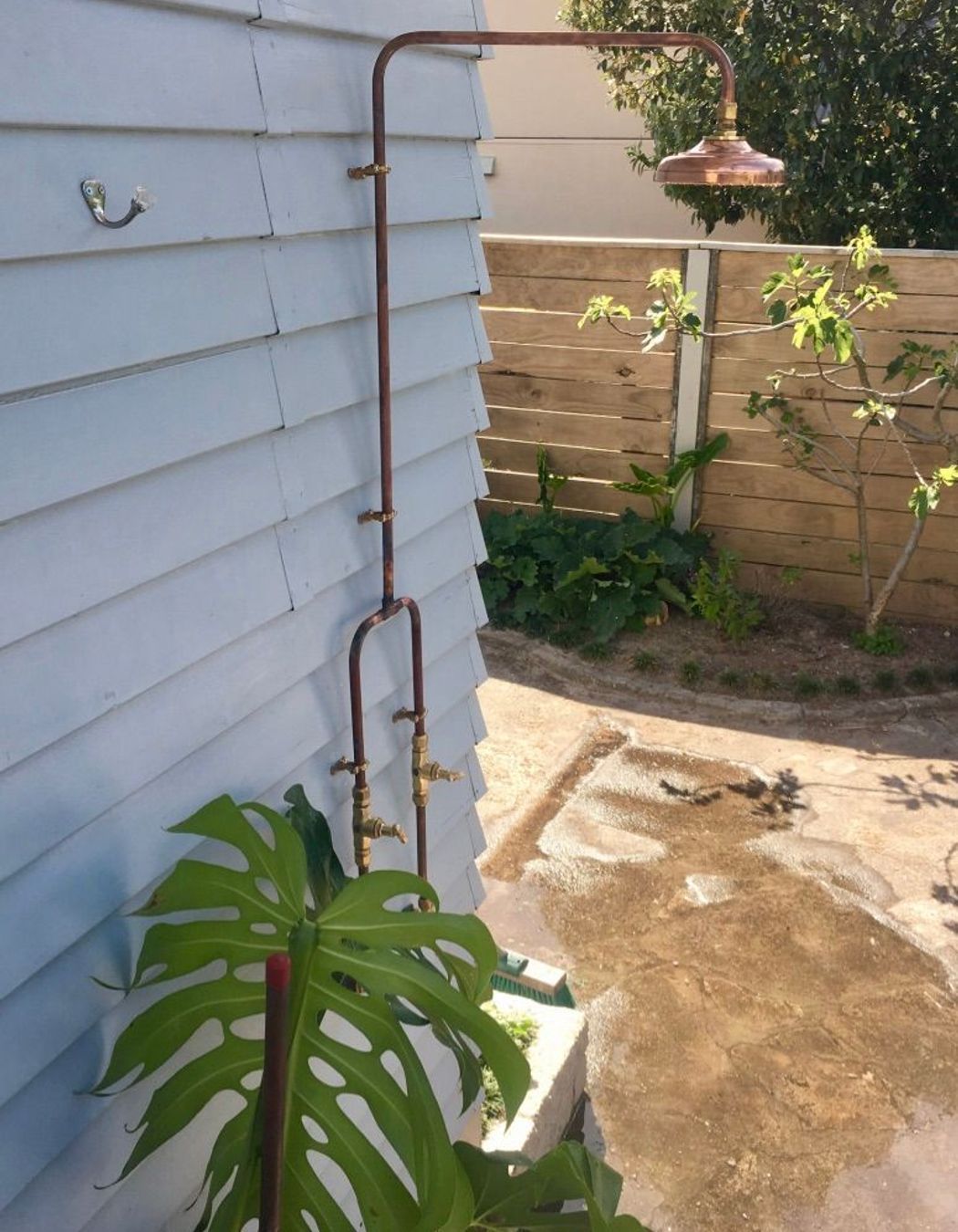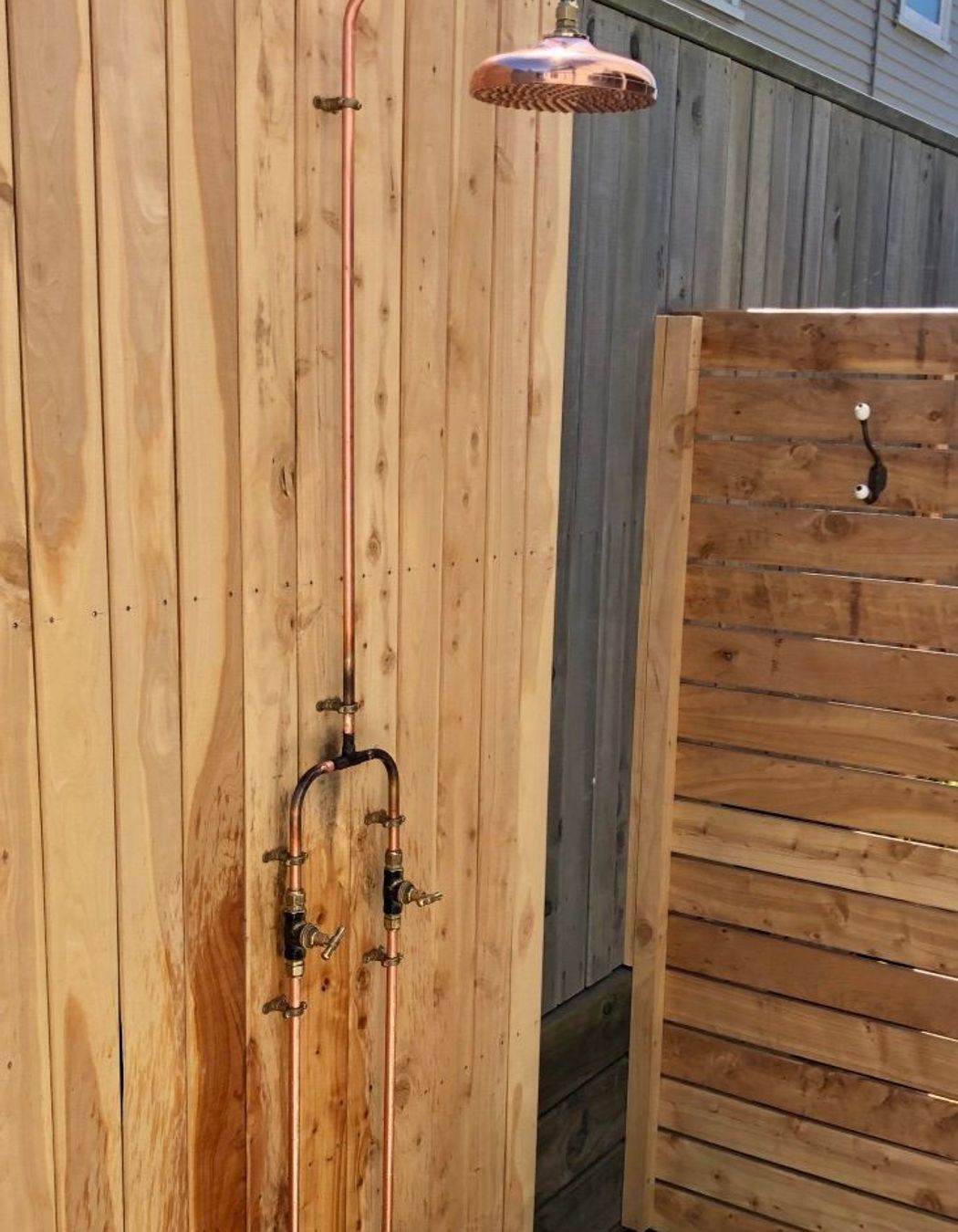 ArchiPro Project Summary - Luxurious outdoor shower installation in Mount Maunganui featuring a 250mm heritage bathware copper shower, Methven exposed shower taps, and sleek rustic copper pipework for an elevated post-swim experience.