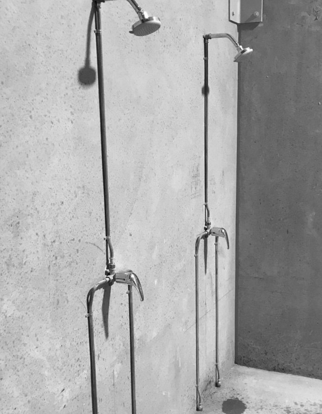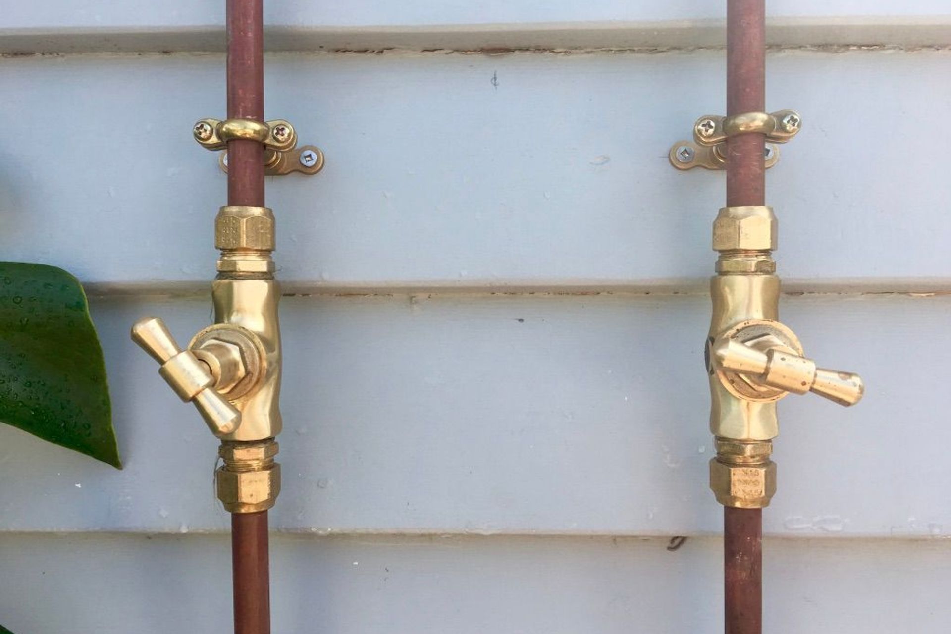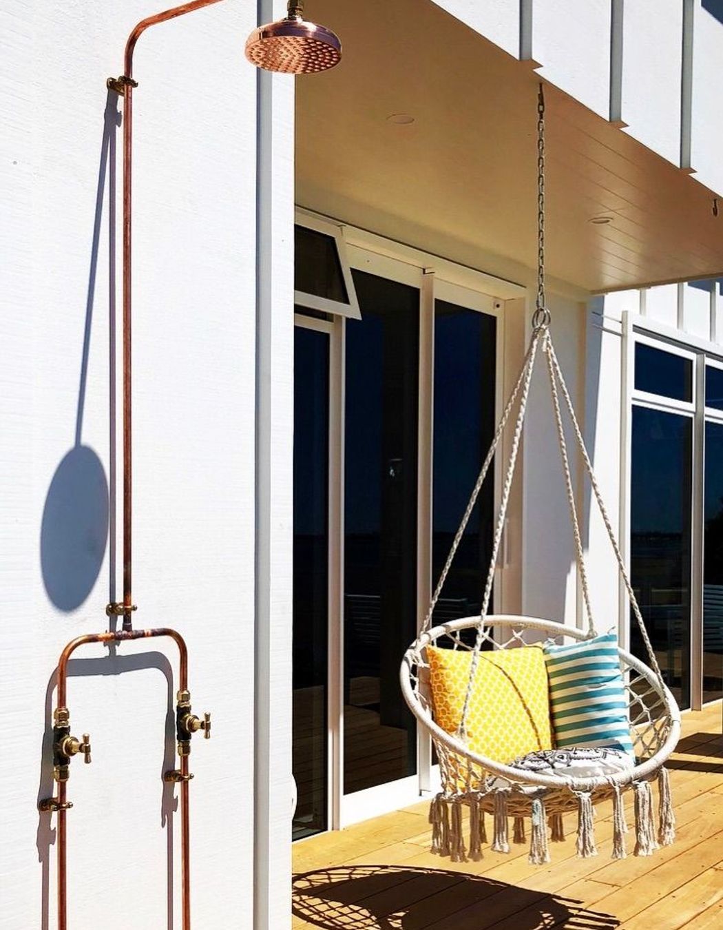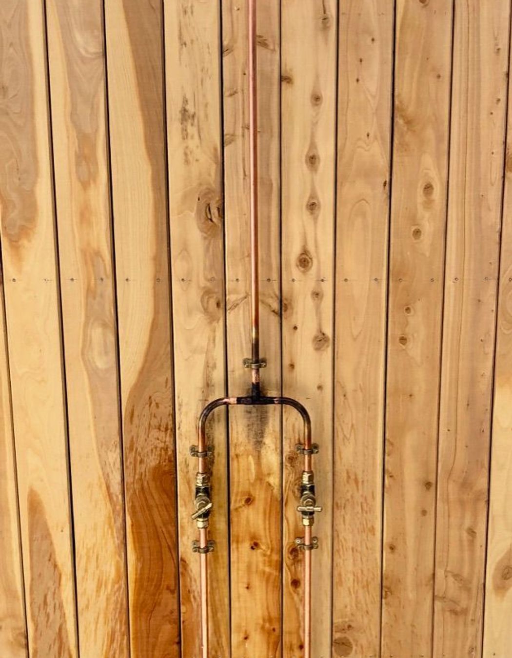 ArchiPro Project Summary - Luxurious outdoor shower installation in Mount Maunganui featuring a 250mm heritage bathware copper shower, Methven exposed shower taps, and sleek rustic copper pipework for an elevated post-swim experience.
