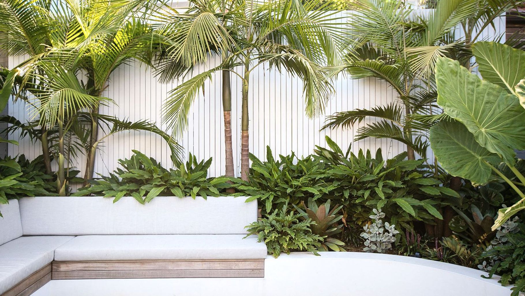 ArchiPro Project Summary - A coastal Hamptons retreat featuring a light color palette, natural materials, and lush tropical plants, complemented by custom bench seating and a stunning backdrop of Bangalow palms.