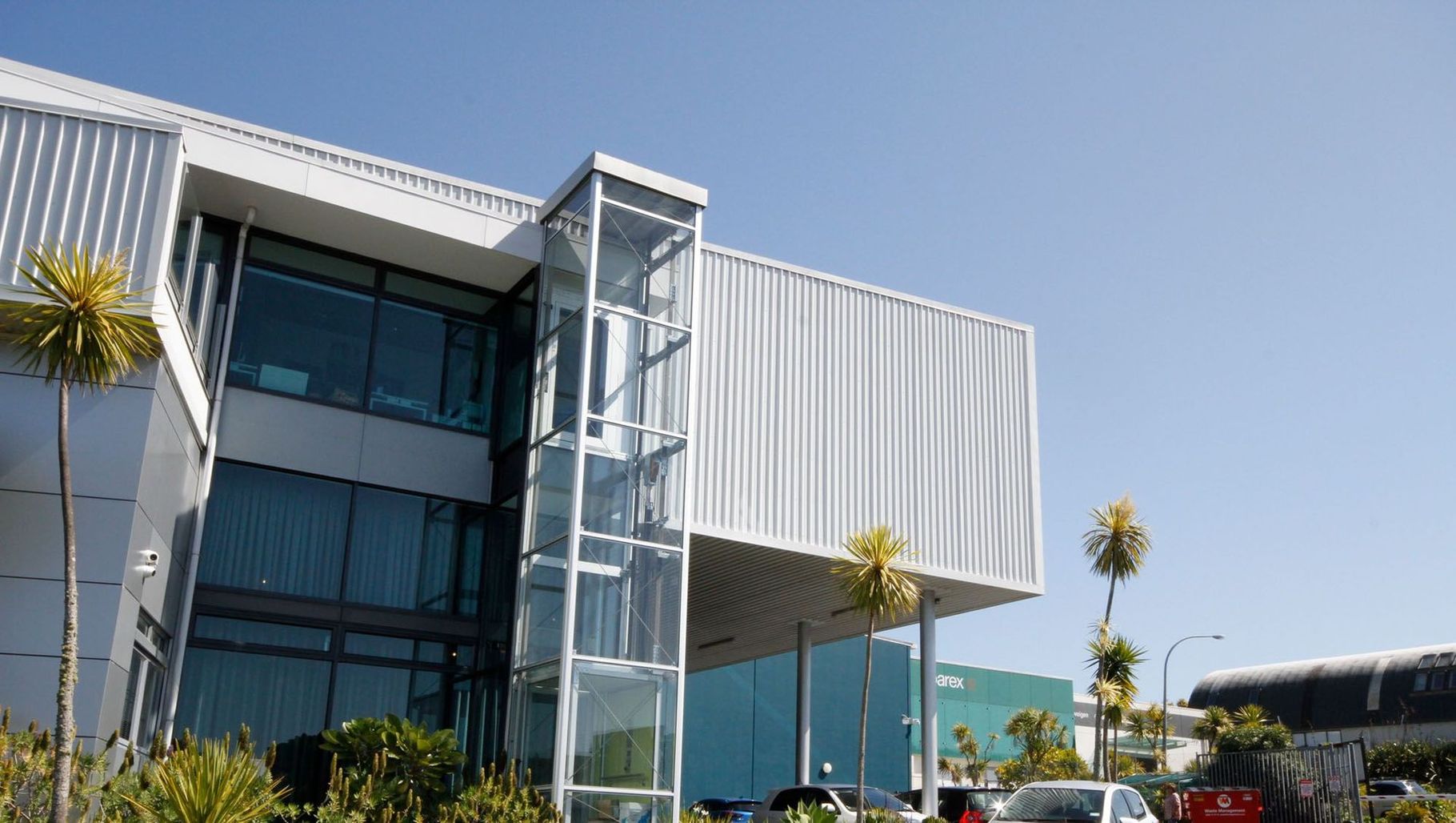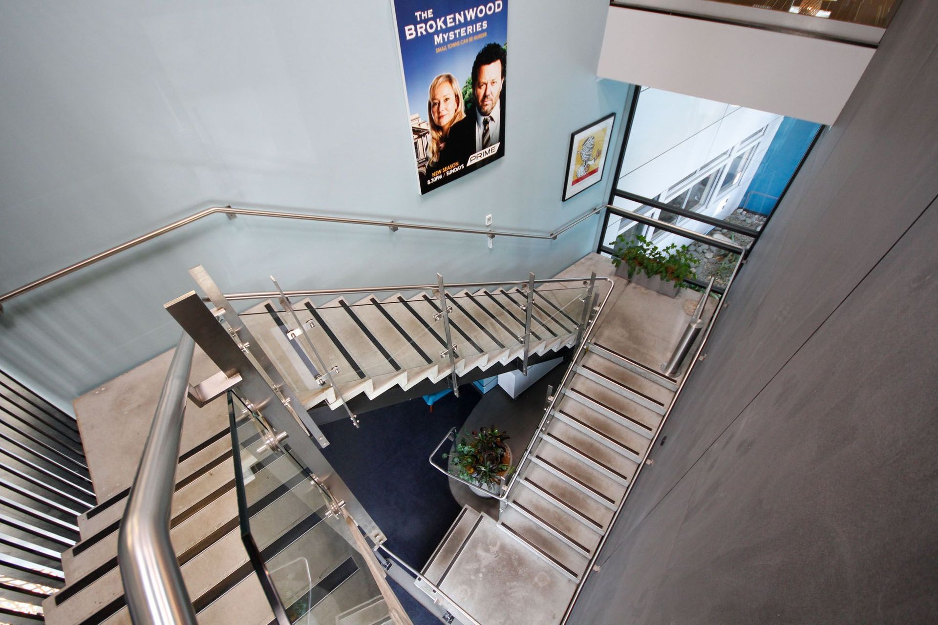 ArchiPro Project Summary - Expansion of South Pacific Pictures with a new open plan administration workspace featuring a grand staircase and large windows, completed amidst a live film set environment.