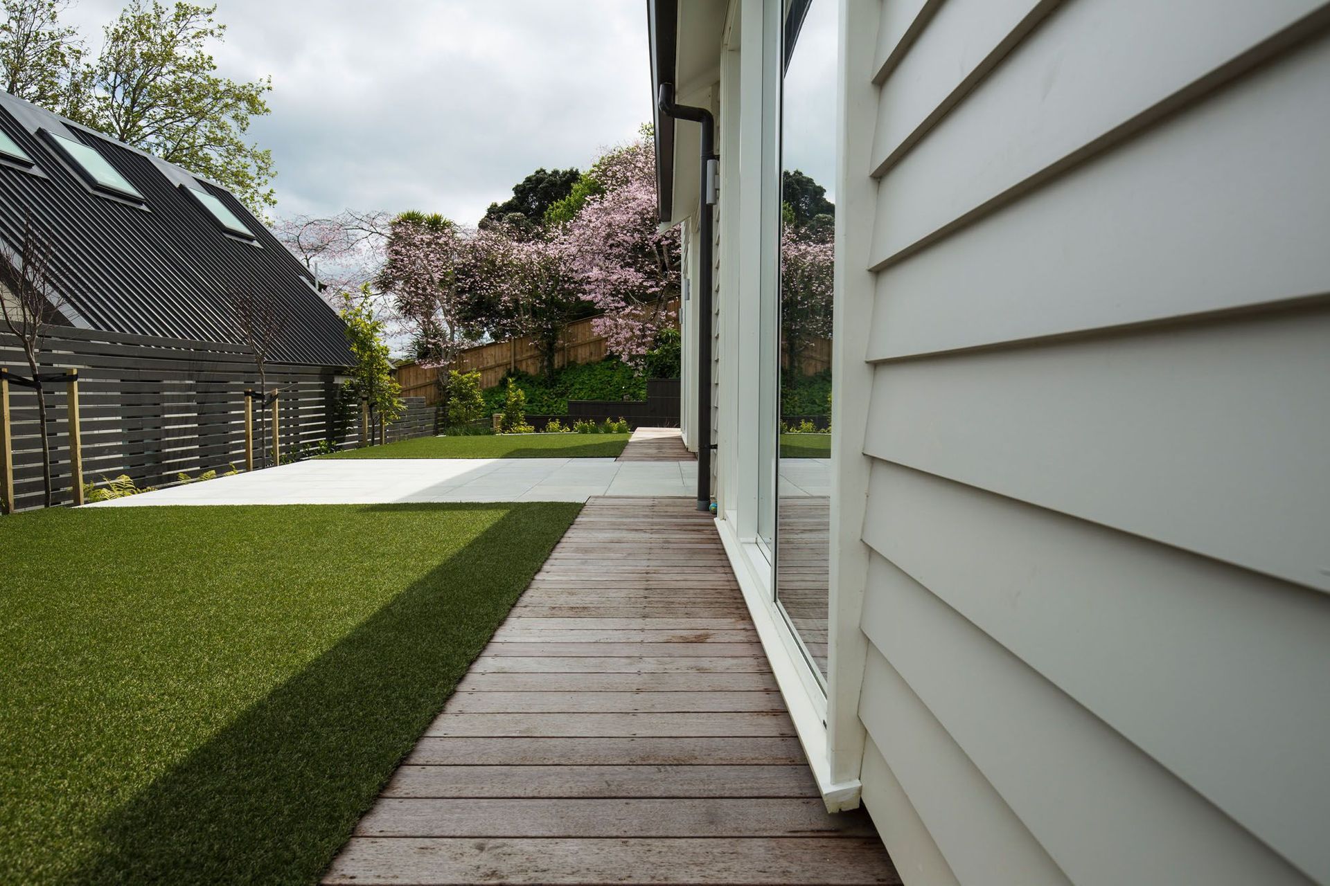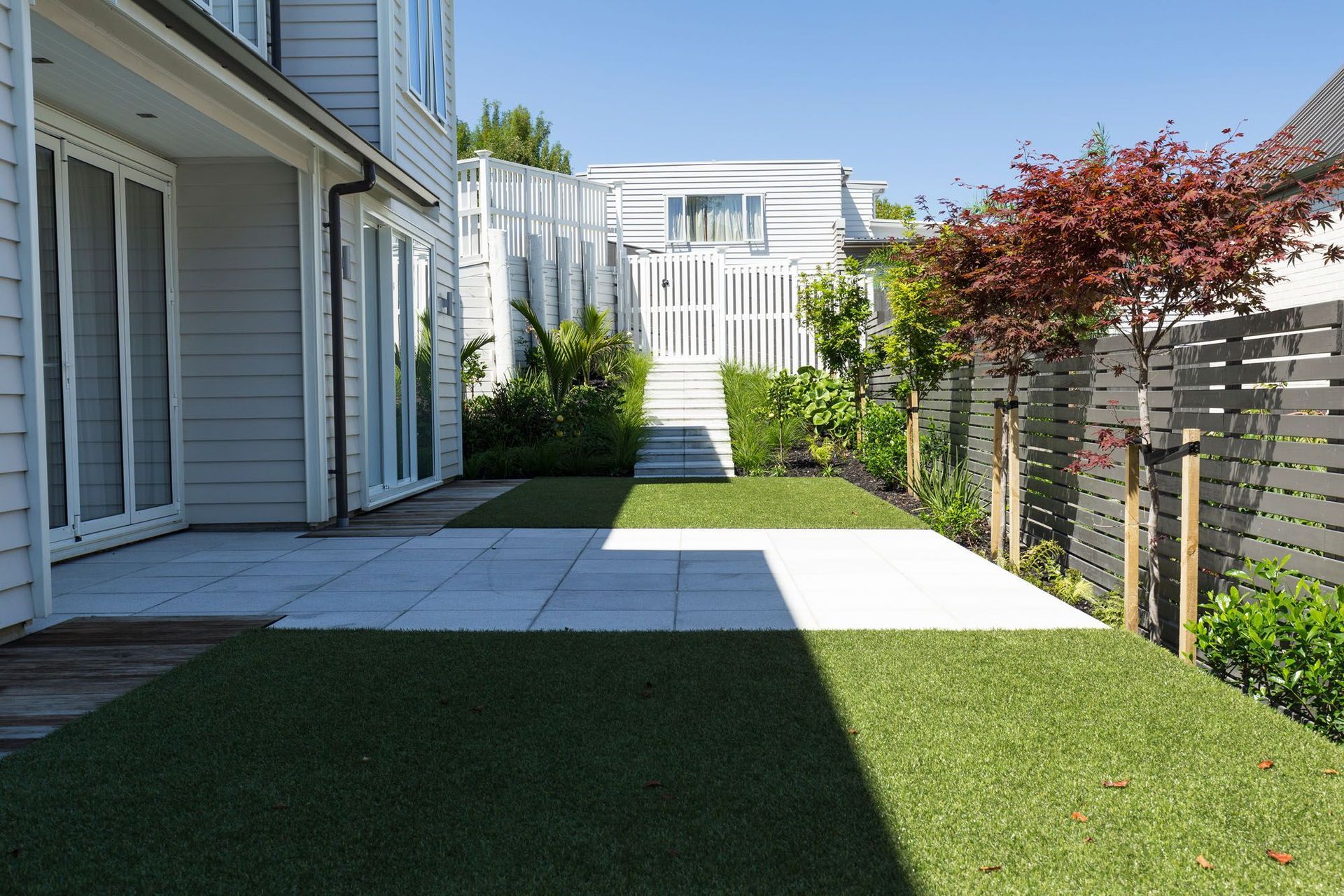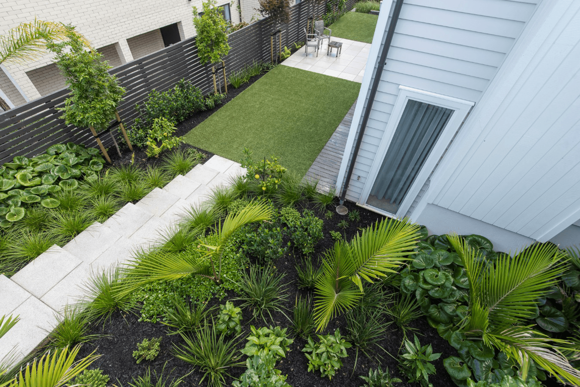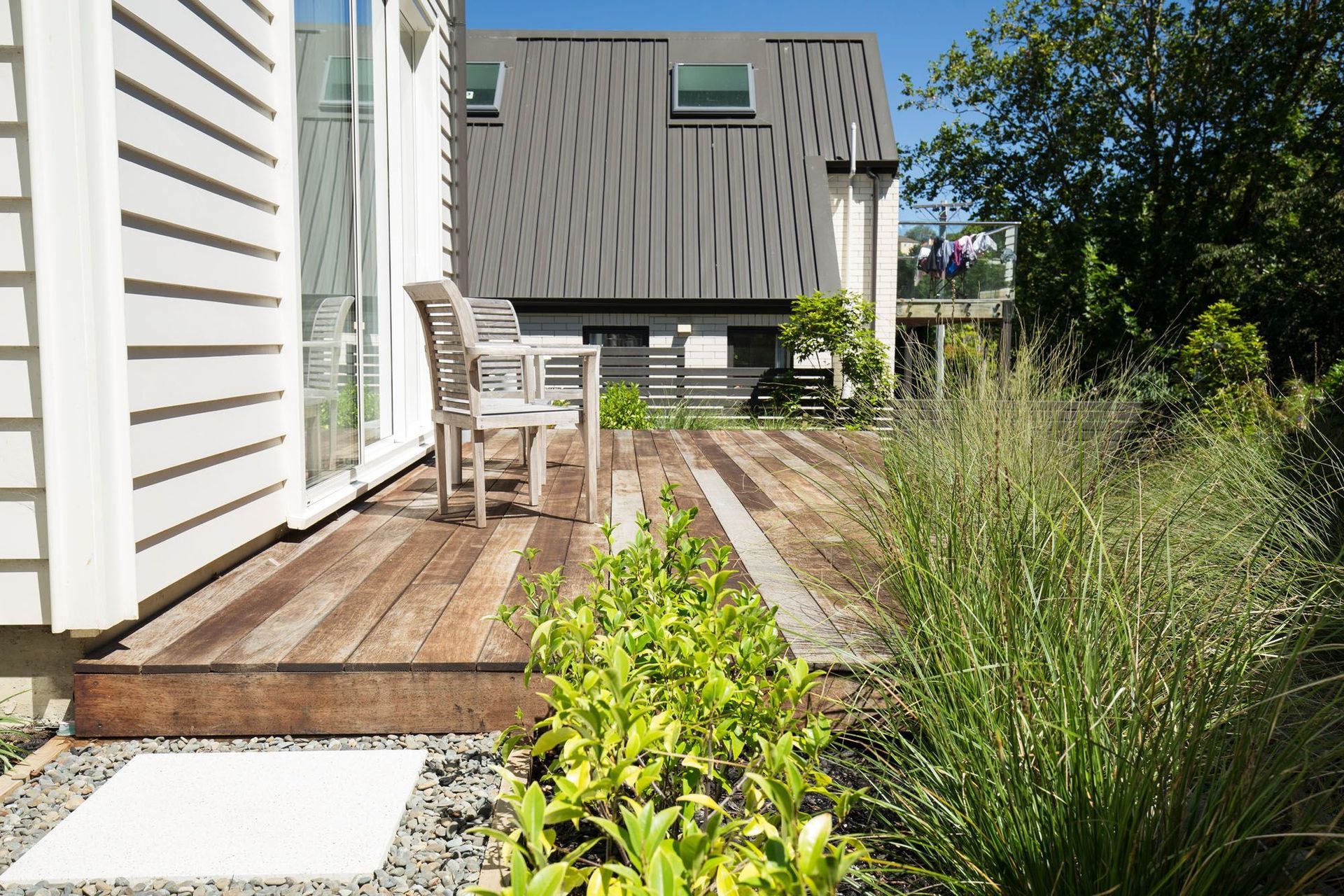 ArchiPro Project Summary - A contemporary, low-maintenance garden designed for a busy family, featuring distinct outdoor spaces for entertaining and play, enhanced by strong linear lines, a diverse planting palette, and thoughtful landscaping elements.