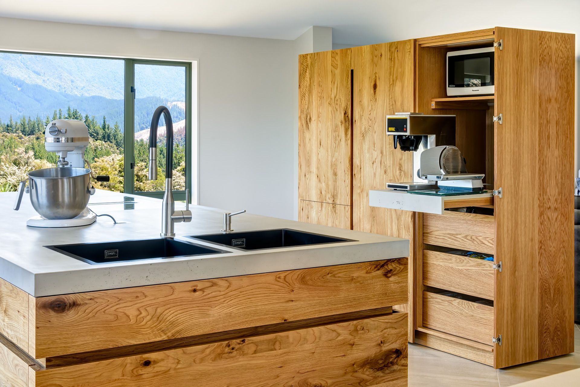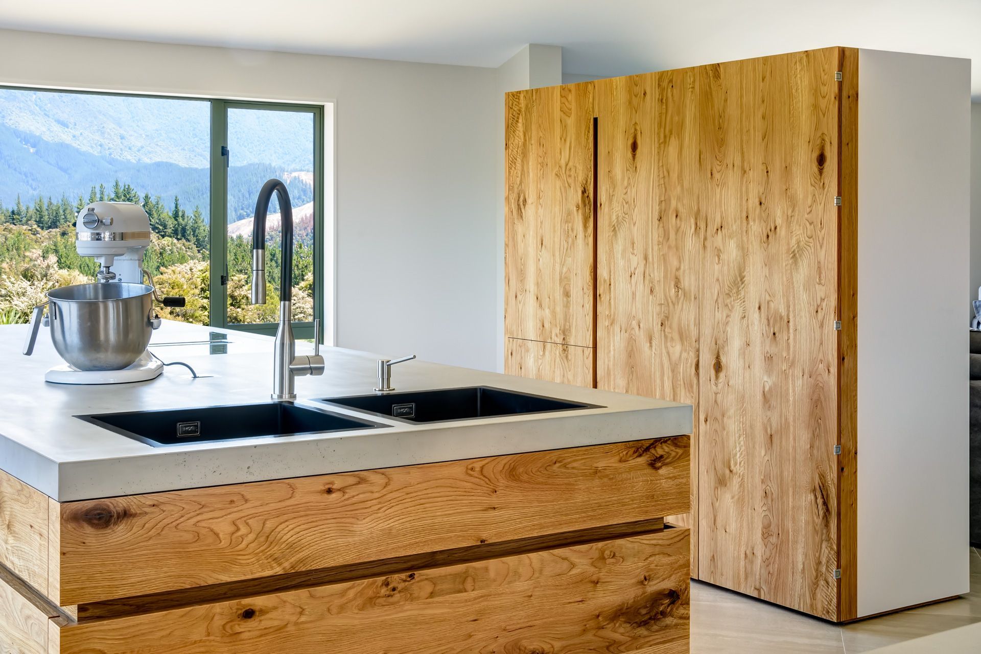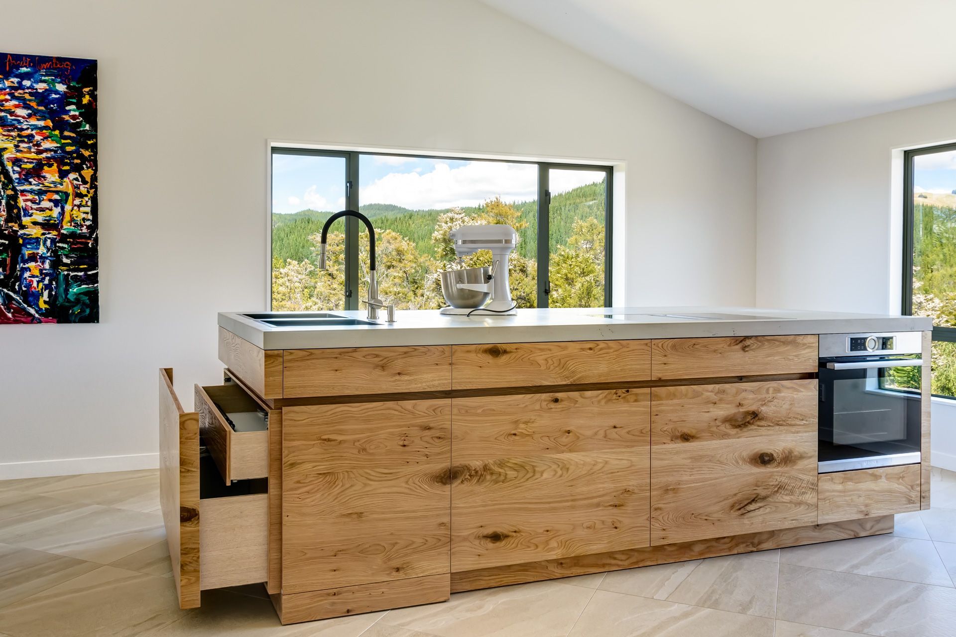ArchiPro Project Summary - A transformative renovation of the Split Apple Eco Lodge, enhancing natural light and space with a stunning open kitchen design, featuring dual islands and integrated appliances, all while preserving breathtaking views of the Abel Tasman landscape.