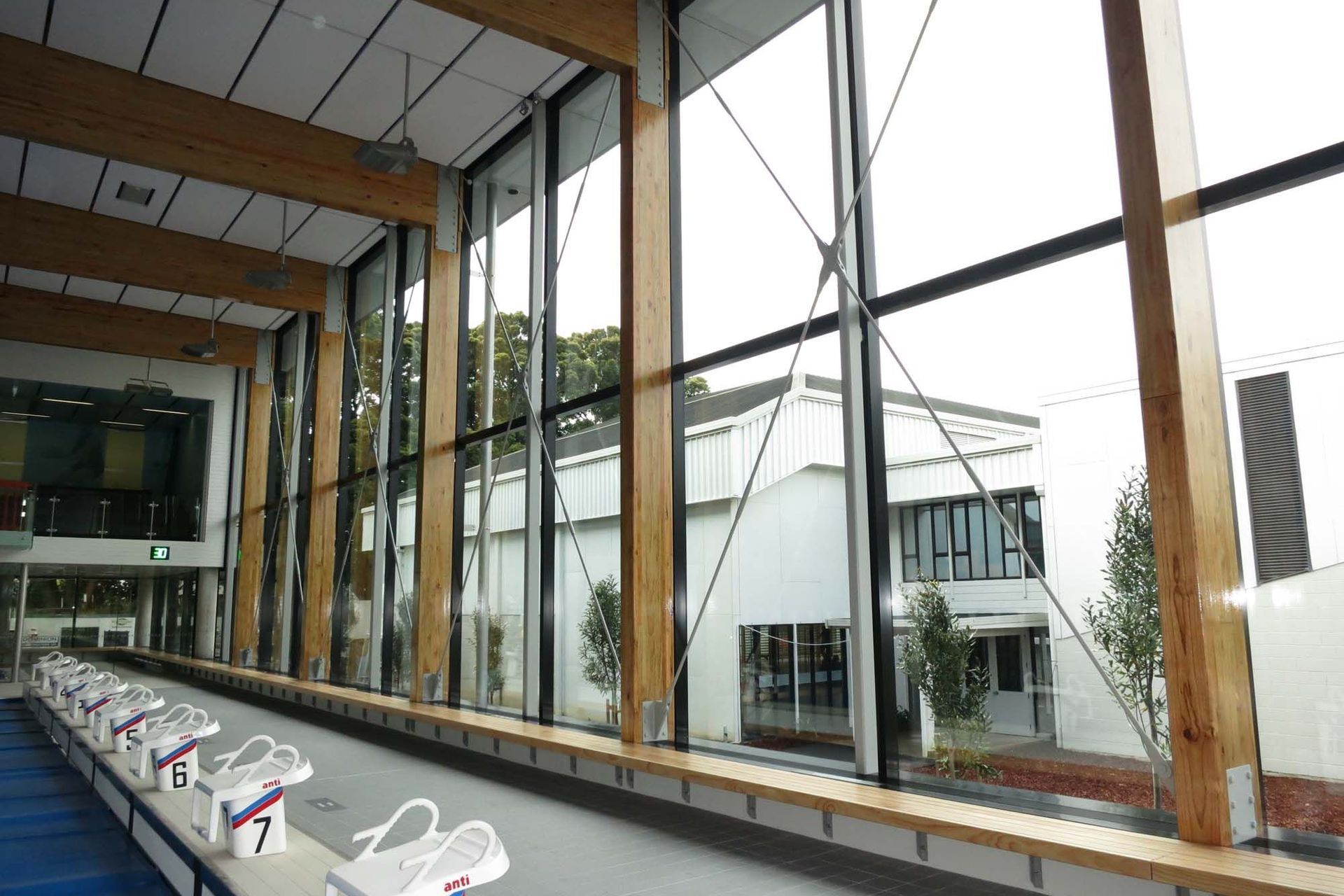 ArchiPro Project Summary - St Cuthberts School Centennial Pool Complex featuring advanced PW1000 double glazing and heavy-duty sliding doors, designed to manage humidity and enhance thermal performance, completed in 2014 by Architectus and Dominion Construction.