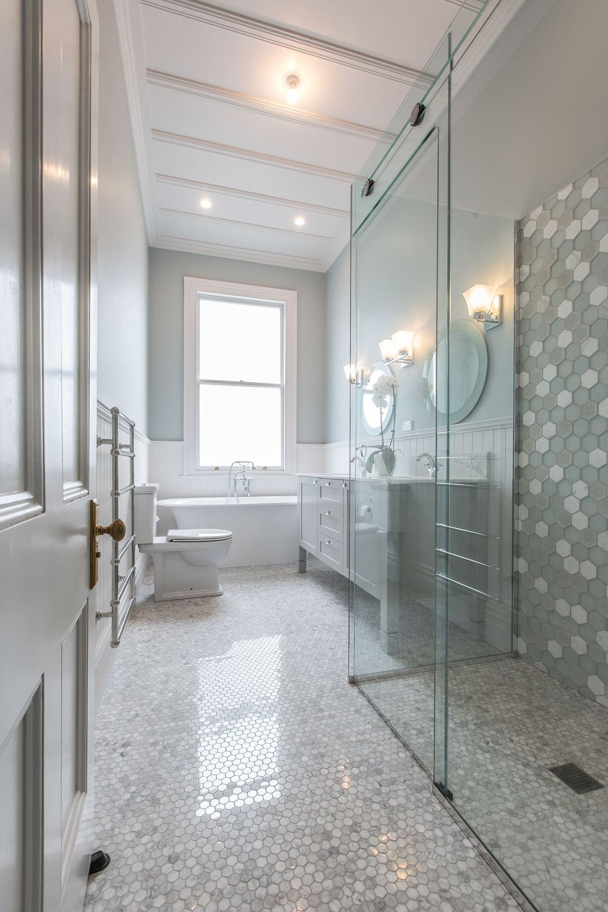 ArchiPro Project Summary - Thoughtfully modernized kitchen and bathroom in a historic 100-year-old St Marys Bay Villa, featuring period-appropriate aesthetics, enhanced dark timber flooring, maximized storage with floor-to-ceiling cupboards, and a spacious pantry behind double sliding doors.