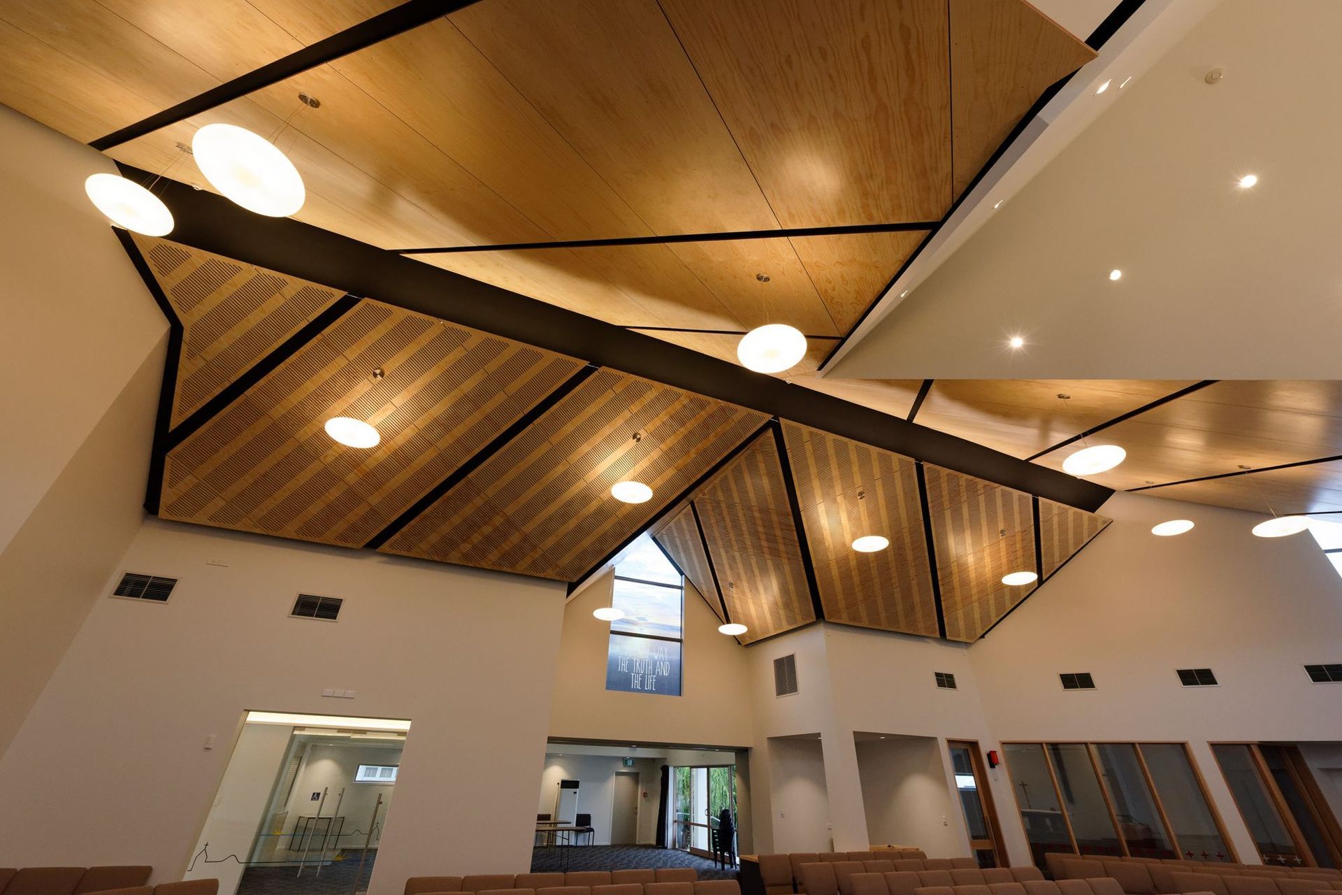 ArchiPro Project Summary - St Marys Church, the world's first church to achieve a Green Star rating, features an intricate steel framework, precast concrete walls, and a sophisticated layout of acoustic plywood ceiling panels, rebuilt after the Christchurch earthquakes.