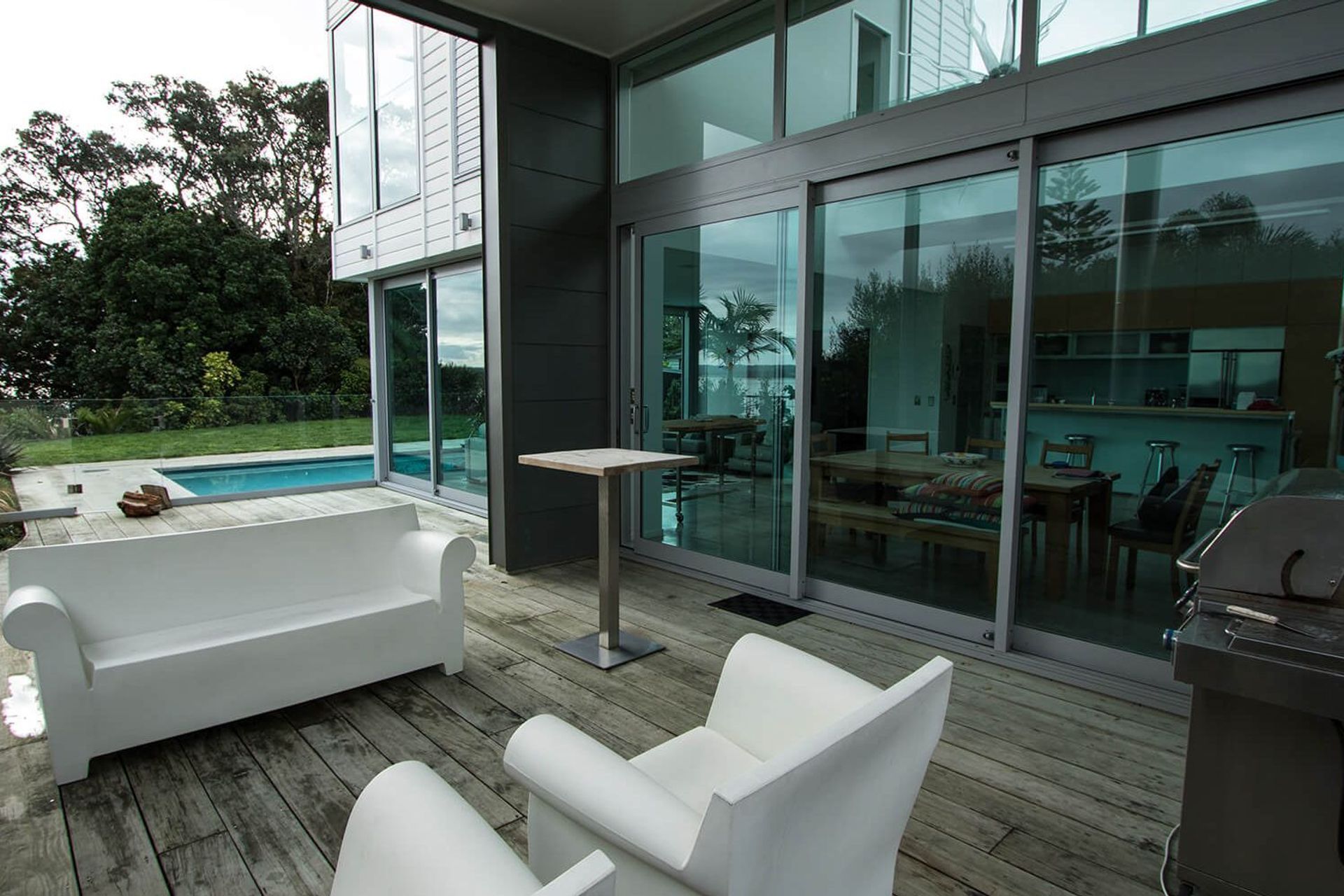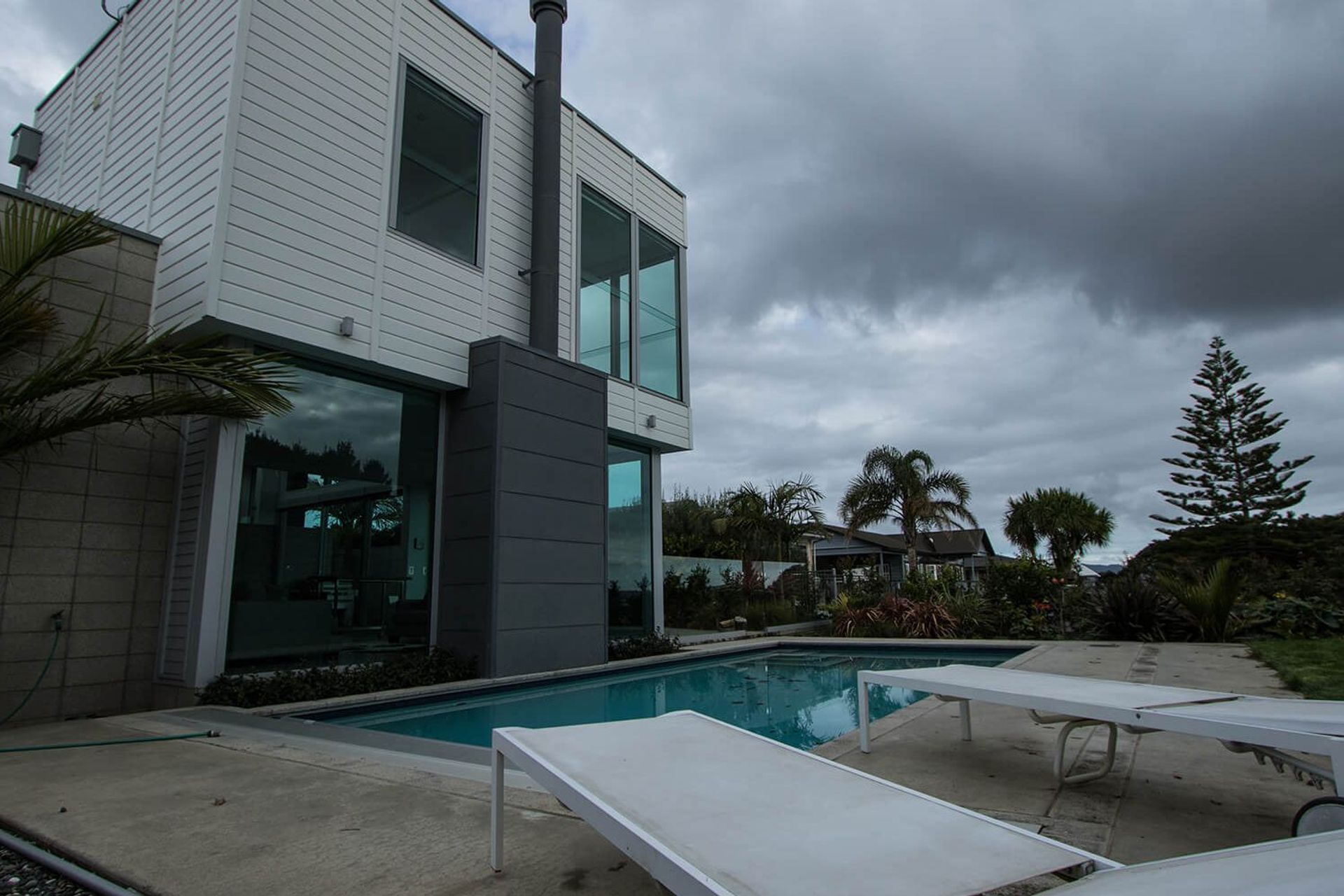 ArchiPro Project Summary - Luxurious new build in Point Chevalier featuring collaborative design by Maxim Build and Jason Bayley Architects, showcasing open-plan living, interconnected wings, and stunning ocean views.