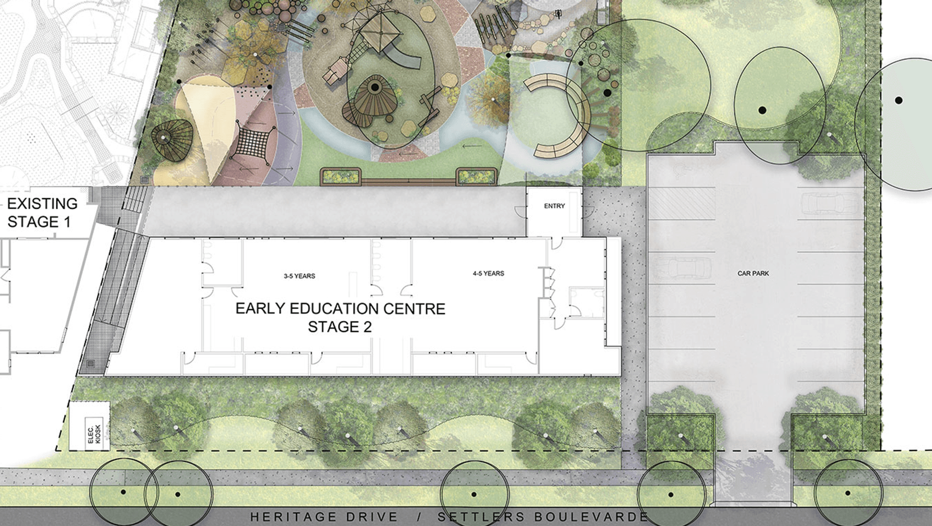 ArchiPro Project Summary - St Nicholas Early Education Centre in Chisholm, NSW, designed for 65 children, features natural play elements inspired by local floodplain patterns, promoting inclusive learning through timber and water play on a sloping site.
