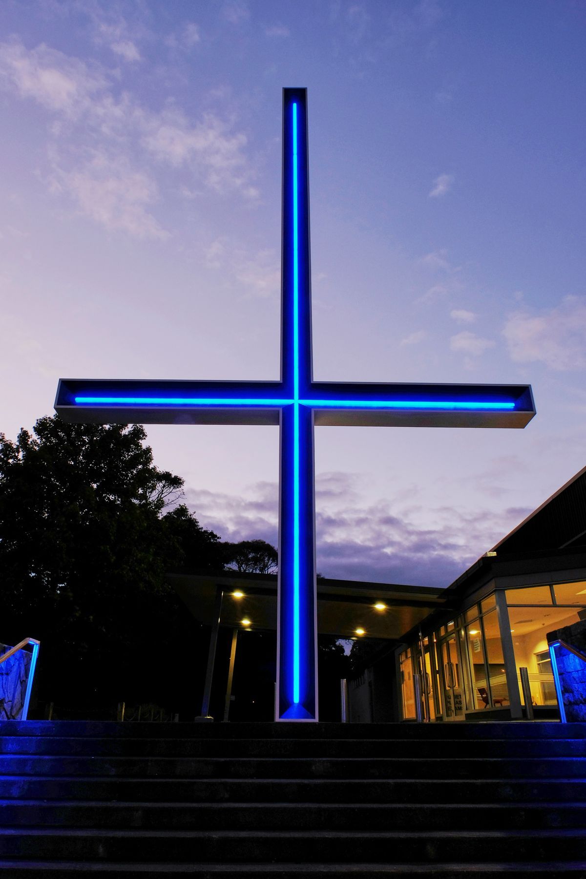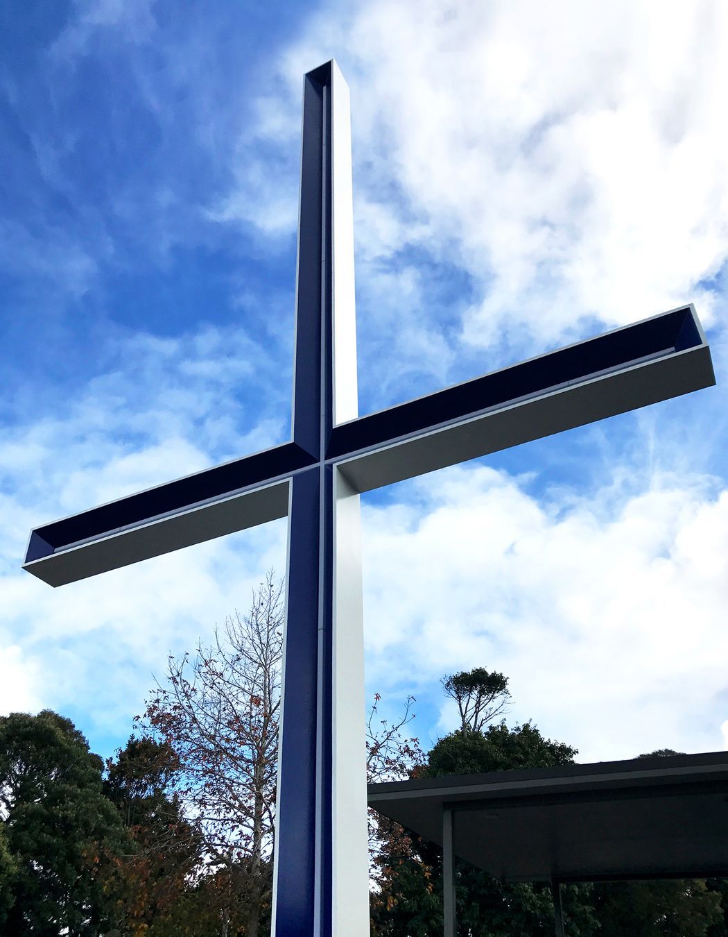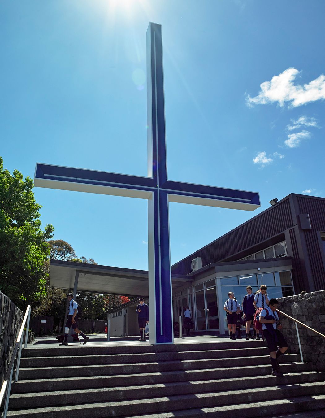ArchiPro Project Summary - Revitalization of St Peter's College entrance featuring a symbolic inverted cross, serving as a spiritual gateway and statement of faith, utilizing innovative structural steel and micro-pile technology to create a powerful connection to the College's heritage.