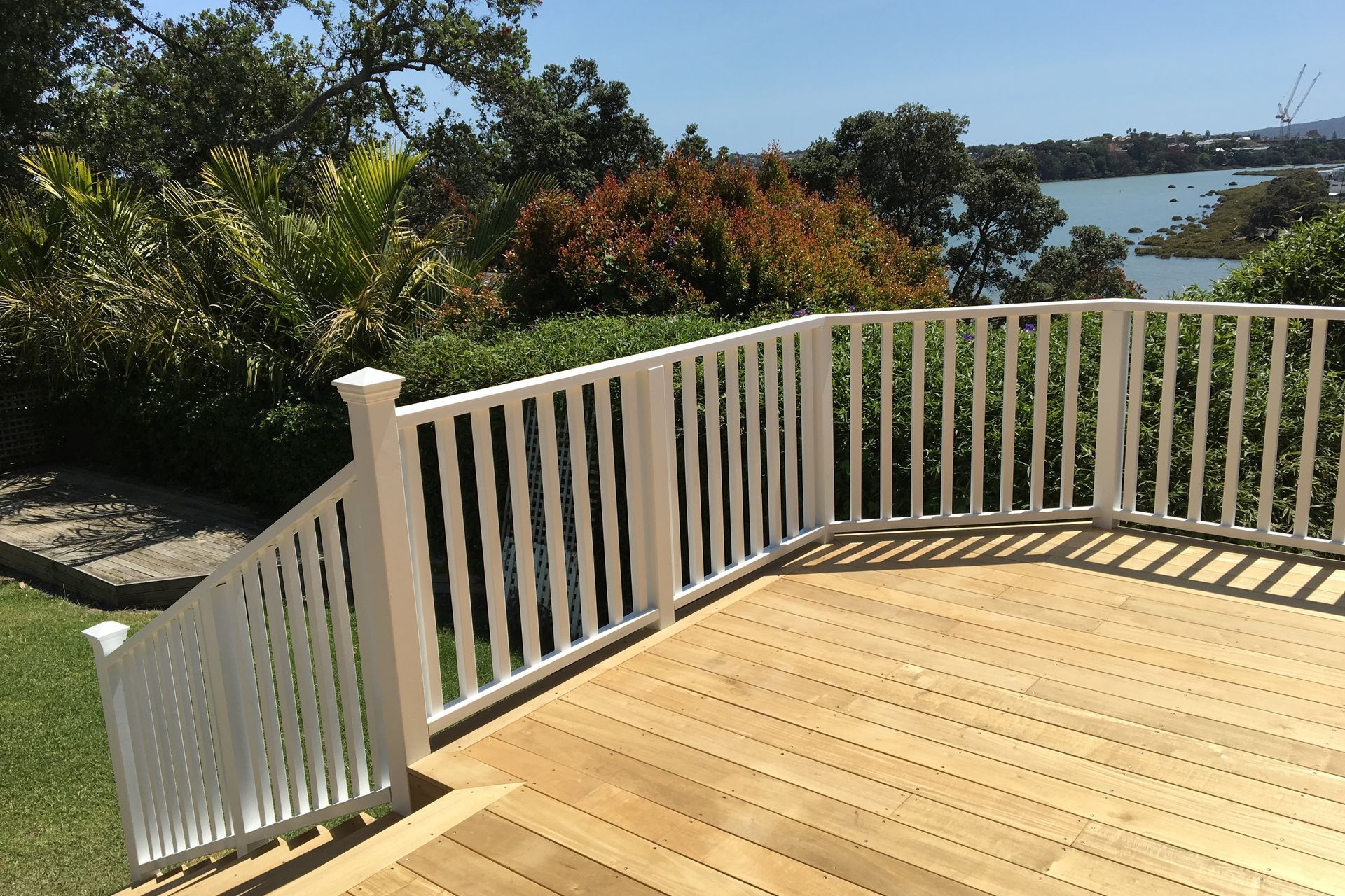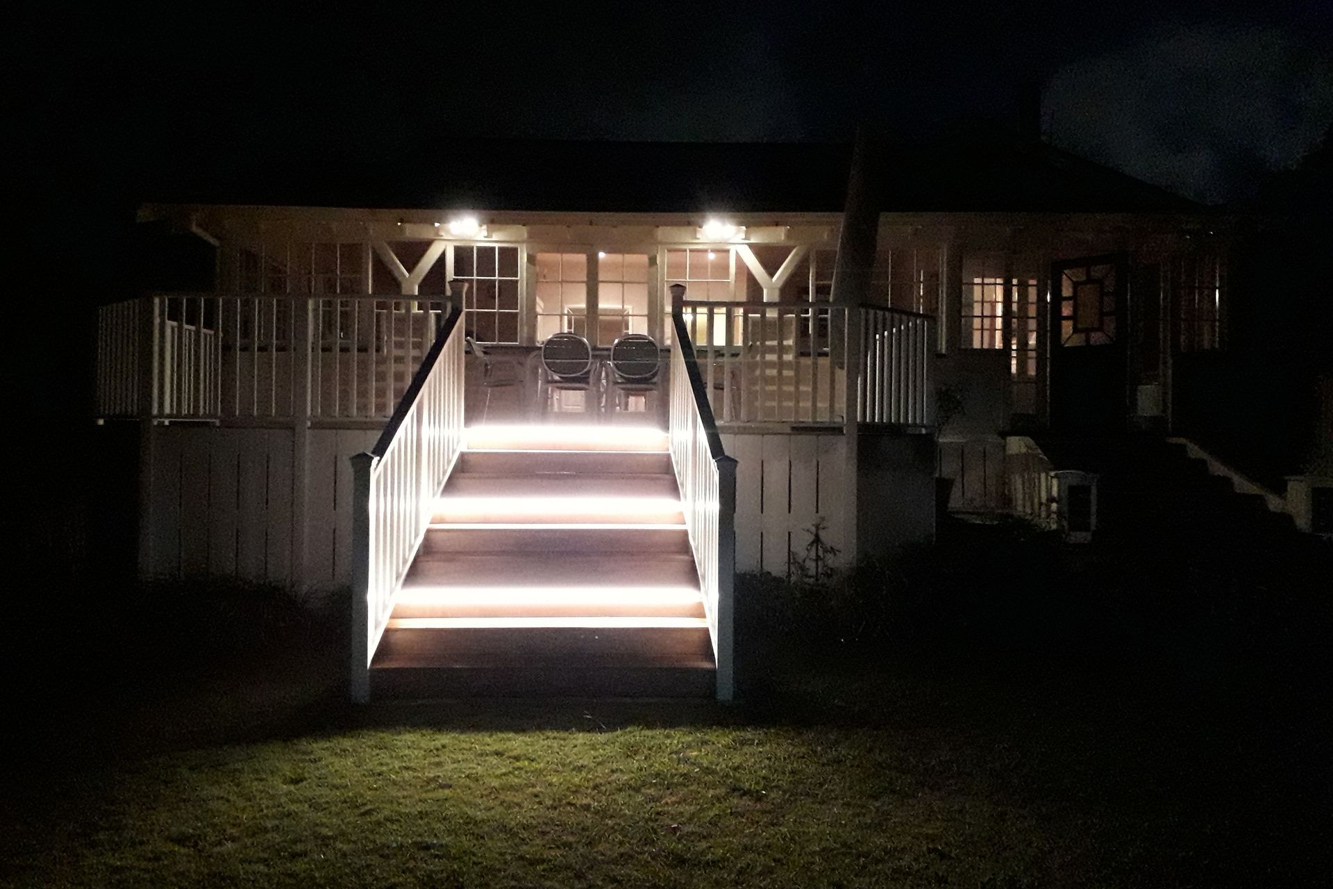 ArchiPro Project Summary - Replacement of an outdated paved deck with a new vitex deck, featuring a redesigned entry point with a flared staircase and LED rope lighting, ensuring compliance with modern building codes.