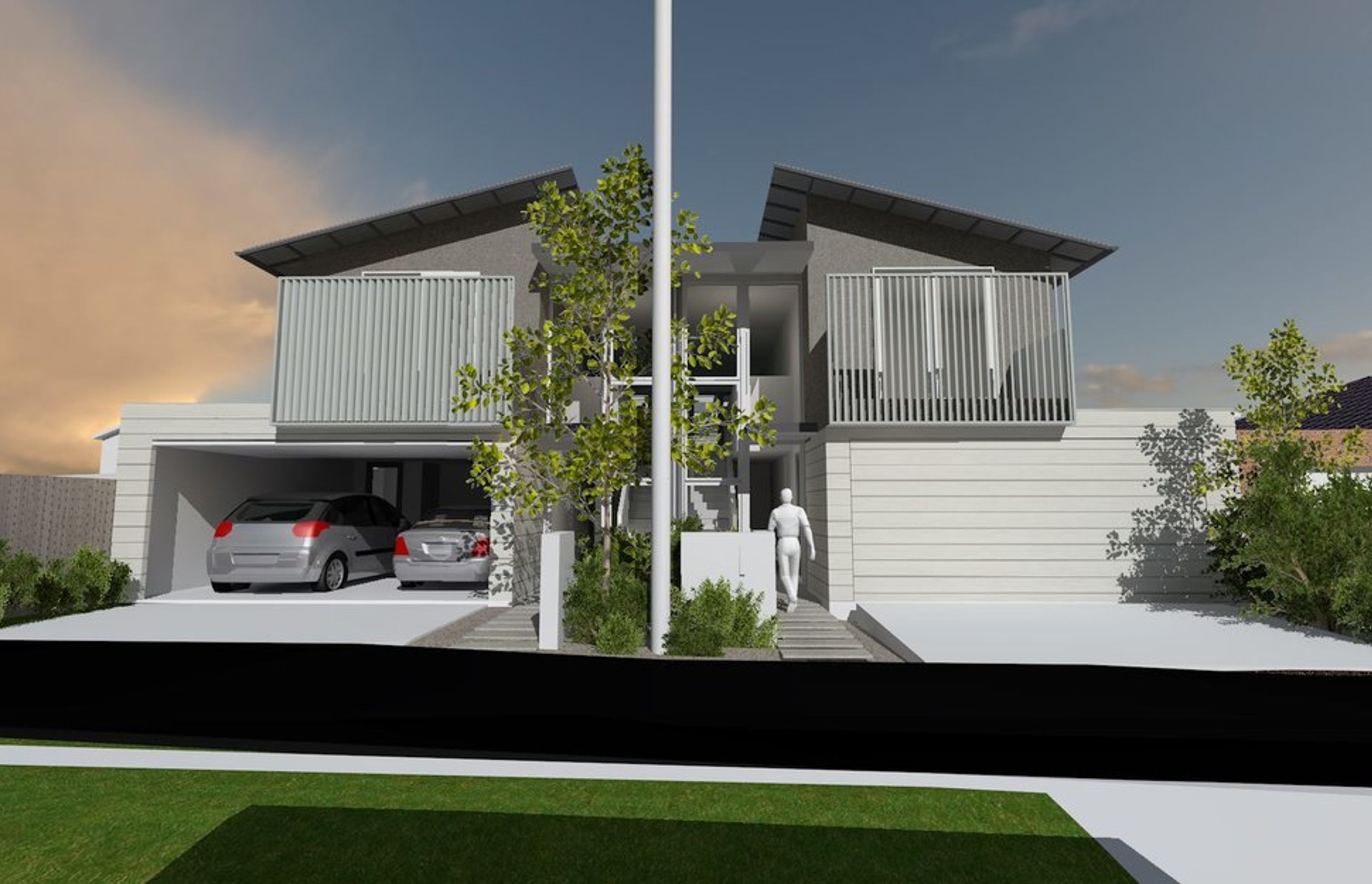 ArchiPro Project Summary - A complex of four double-storey two and three-bedroom units in Williamstown, featuring front street access, lock-up garages, studies, two bathrooms, and balconies for each unit.