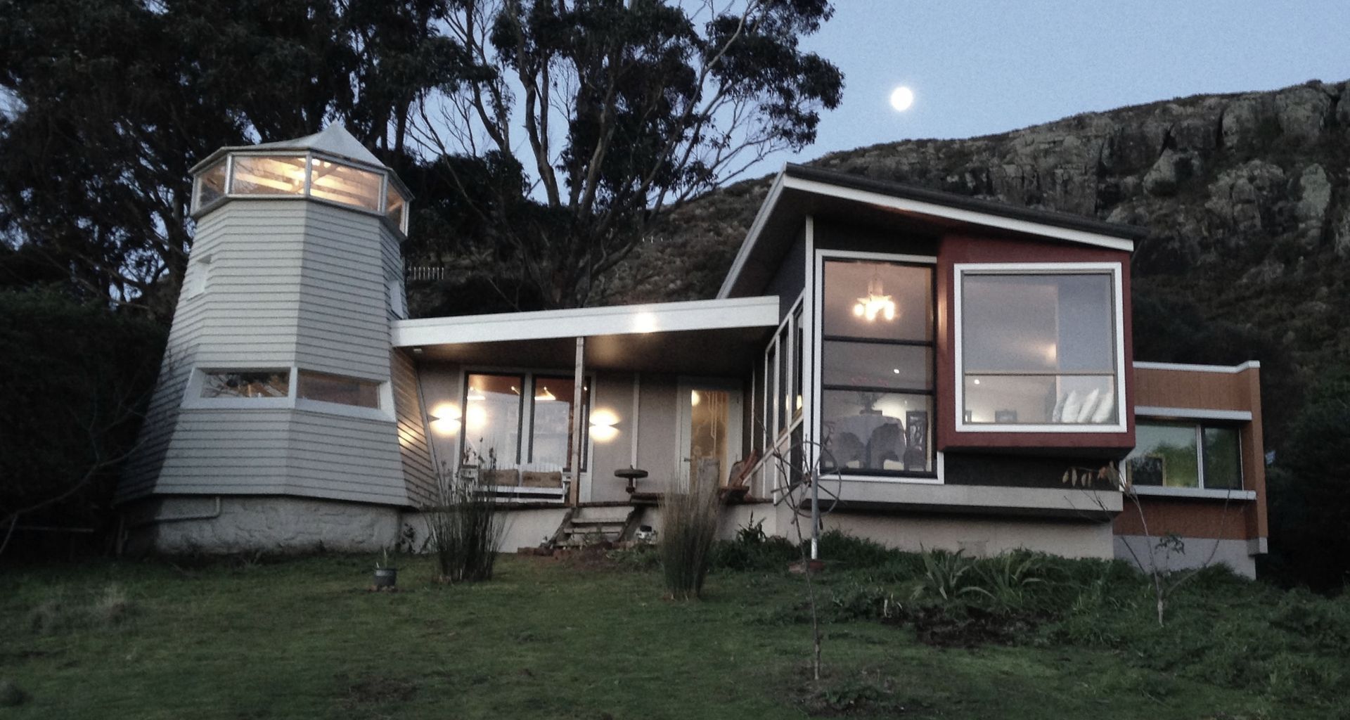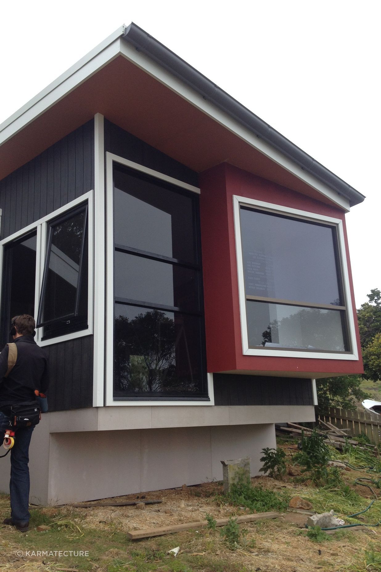 Finished project with The Nut National Park in the background. What was an original folly of a windmill and other outbuildings has been collected and curated into a comfortable 1 1/2 bedroom cottage. Orientation of the building makes the best of the views to local beaches and to the Green Hills beyond. Recycling and up cycling was a core focus of the project and was featured on Grand Designs Australia