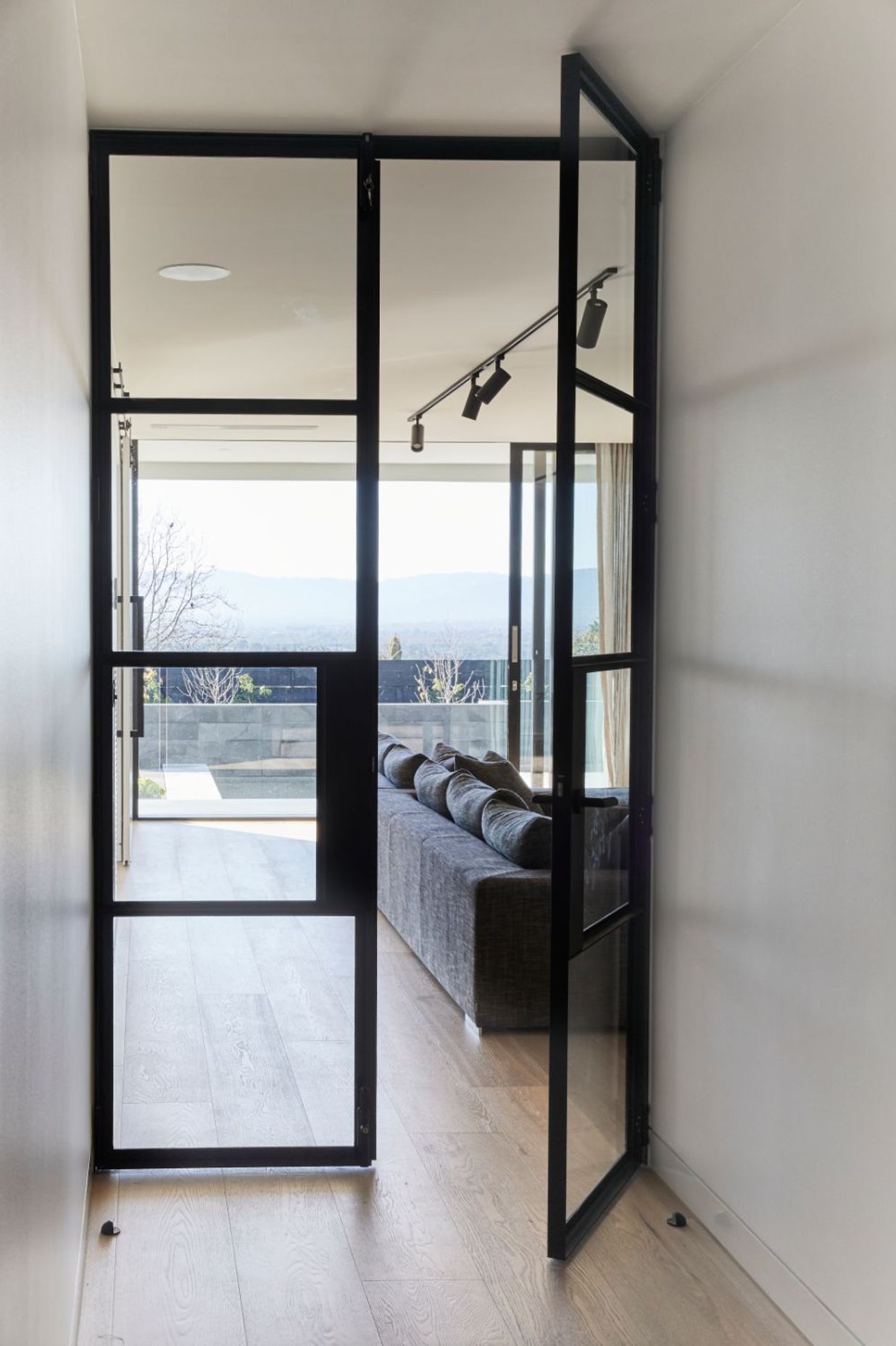 ArchiPro Project Summary - Custom-designed Stirling Residence offers breathtaking views of the Dandenong Ranges, featuring reversed living spaces, luxurious master suite, opulent cellar, and seamless access to outdoor entertaining areas, setting a new standard in architectural elegance.