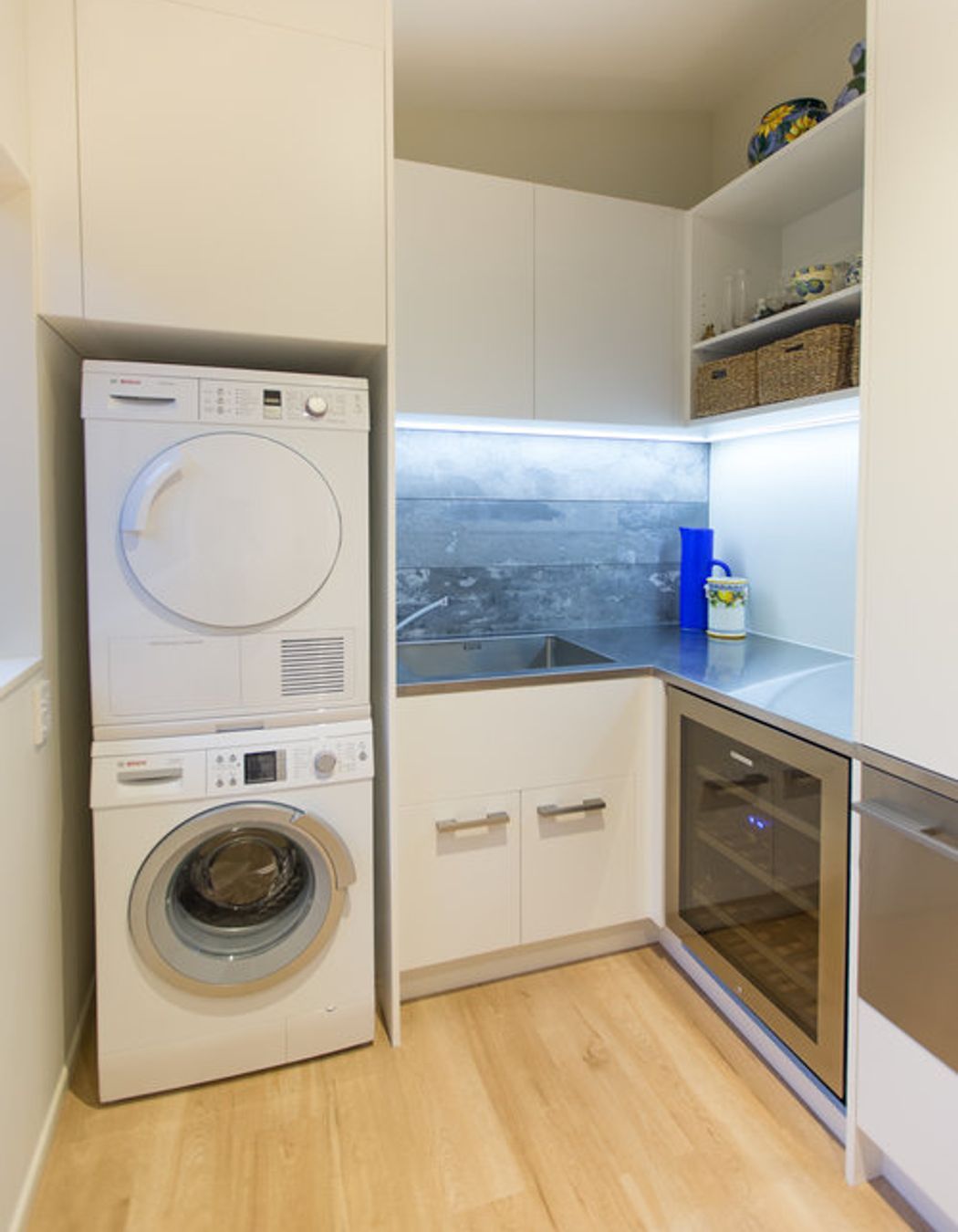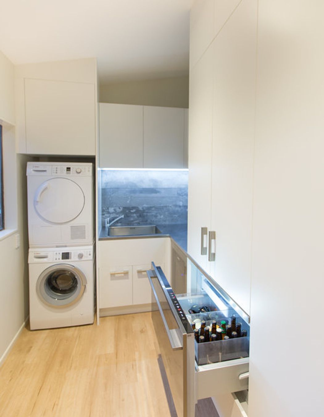 ArchiPro Project Summary - A stylish scullery/laundry featuring ample storage, a wine fridge, and a Fisher and Paykel cool drawer, seamlessly integrated next to the kitchen for enhanced functionality and entertaining.