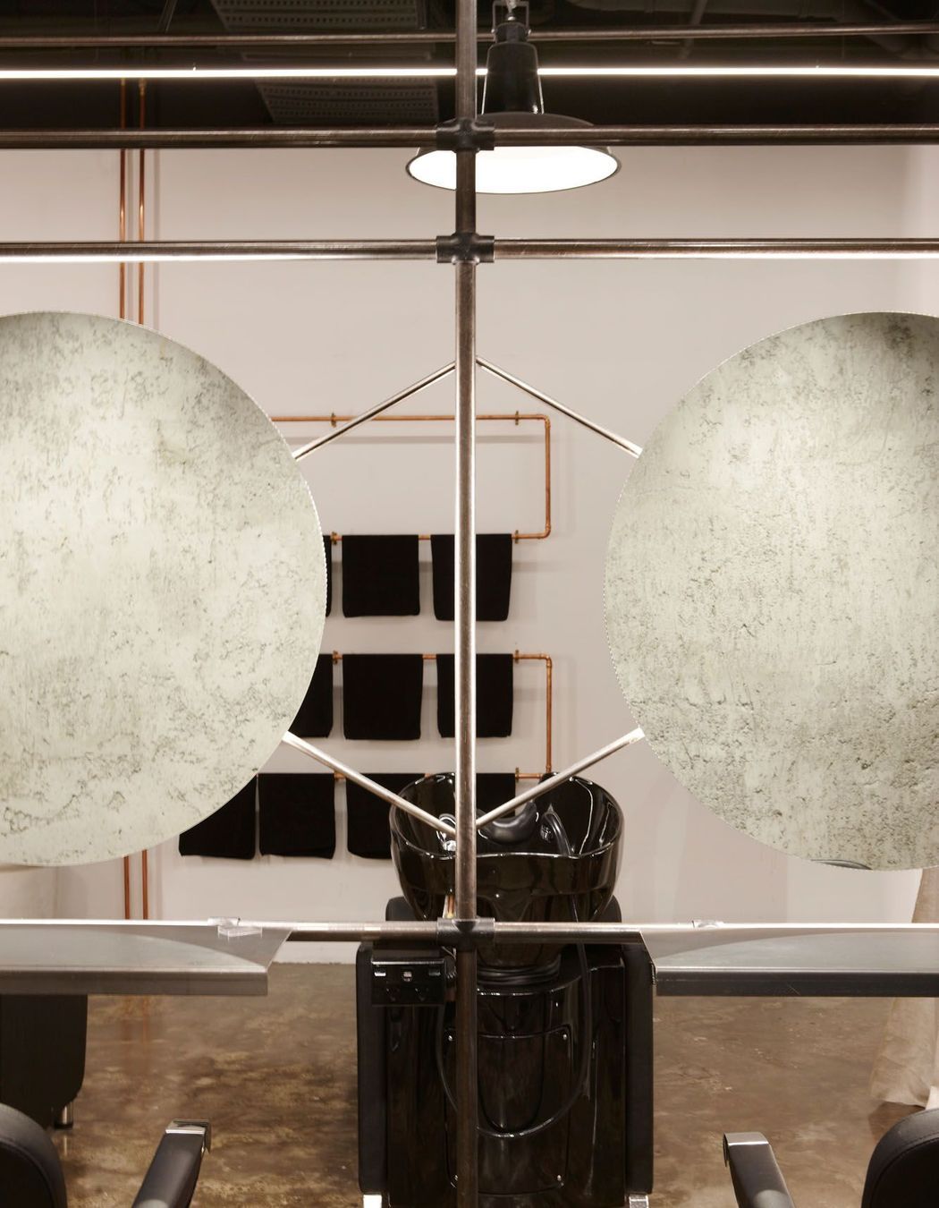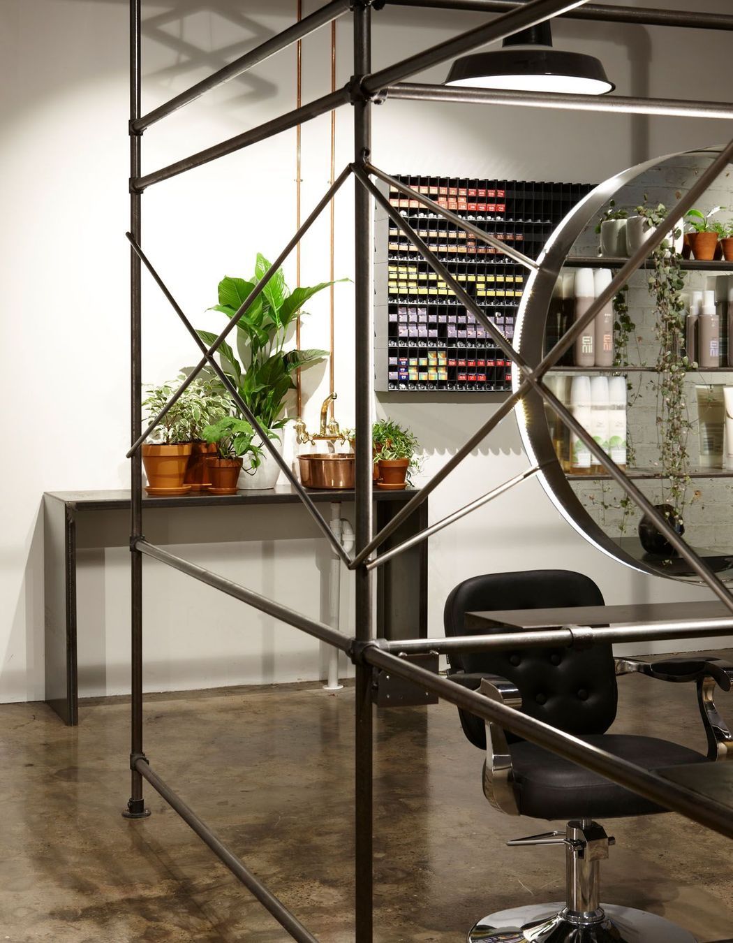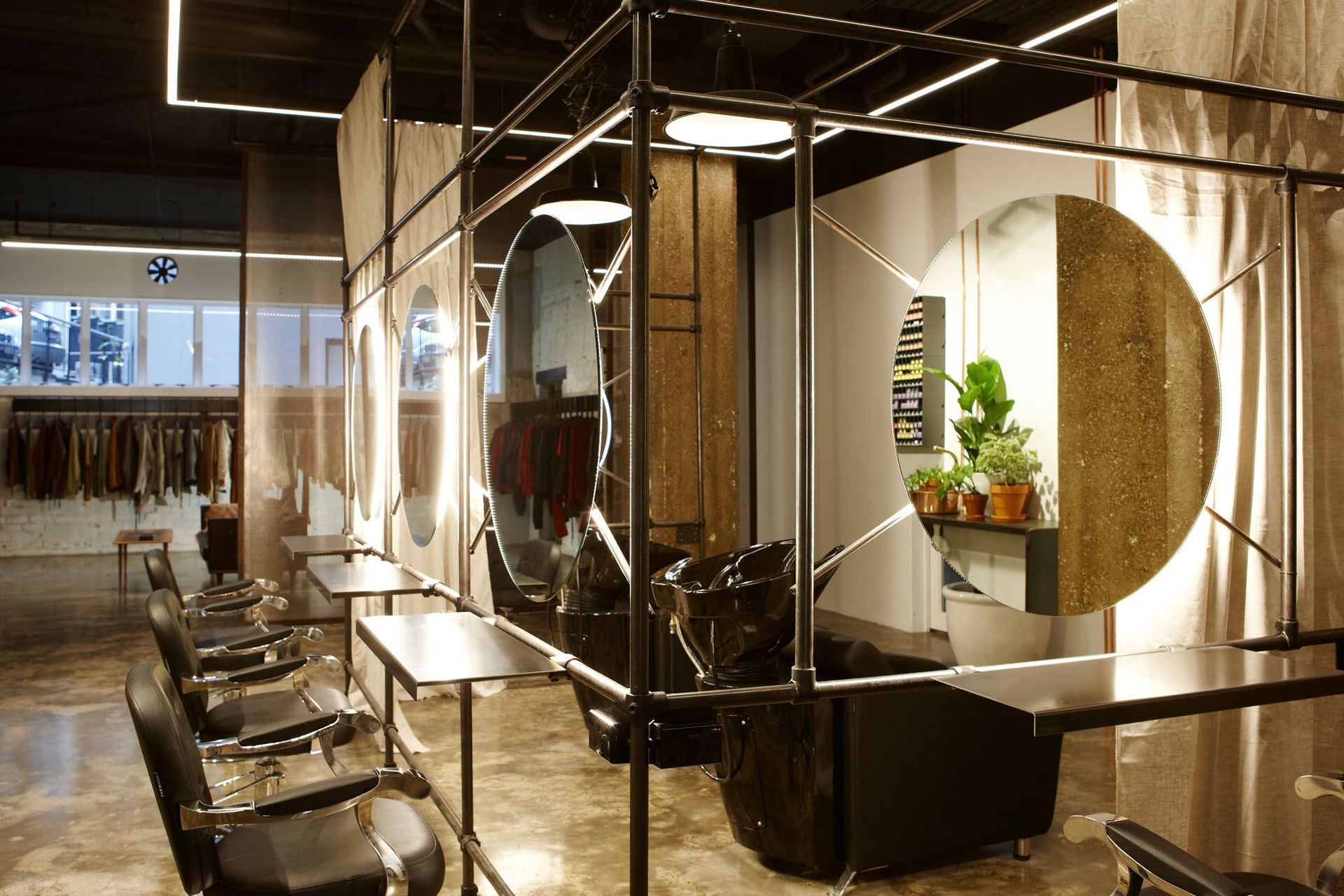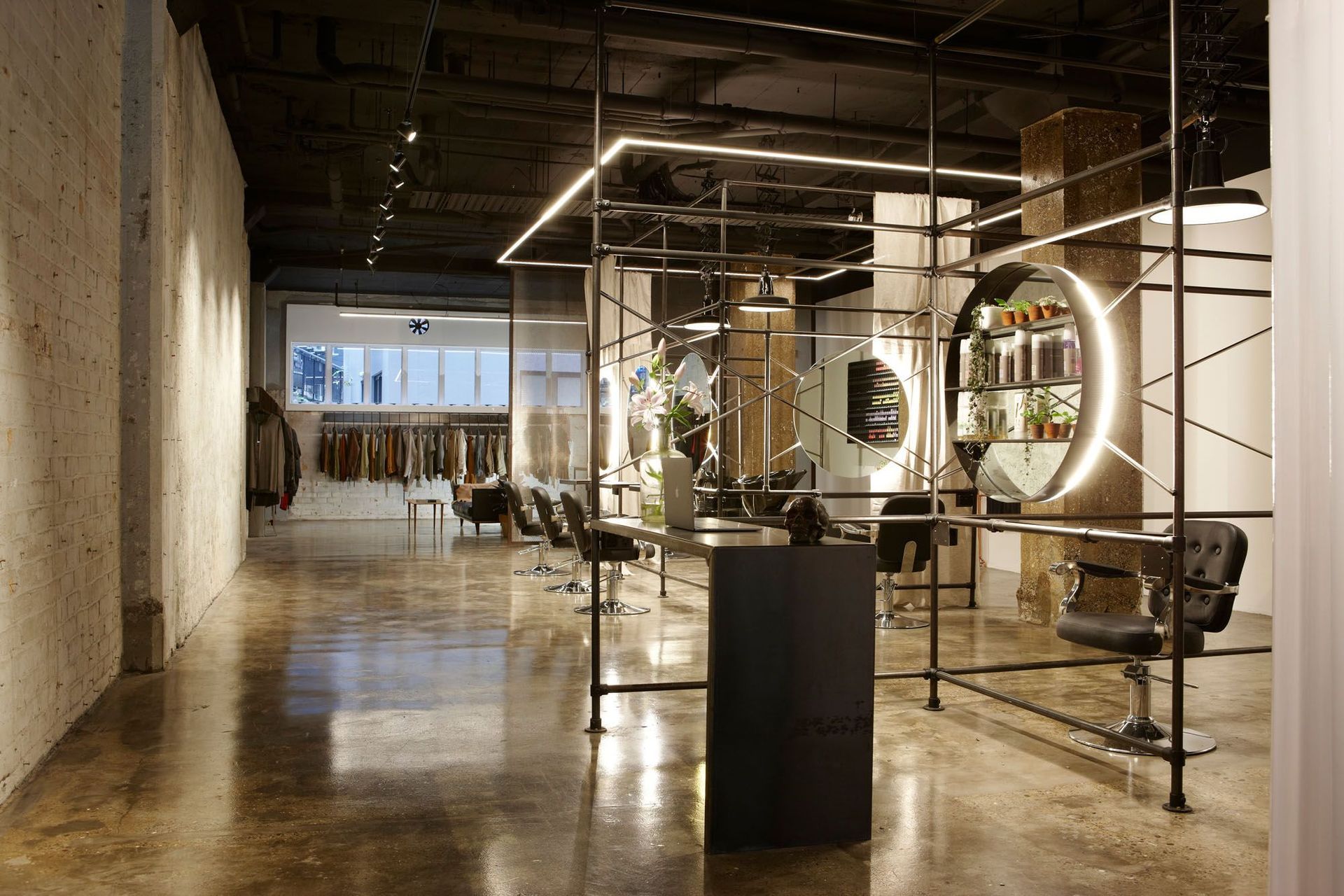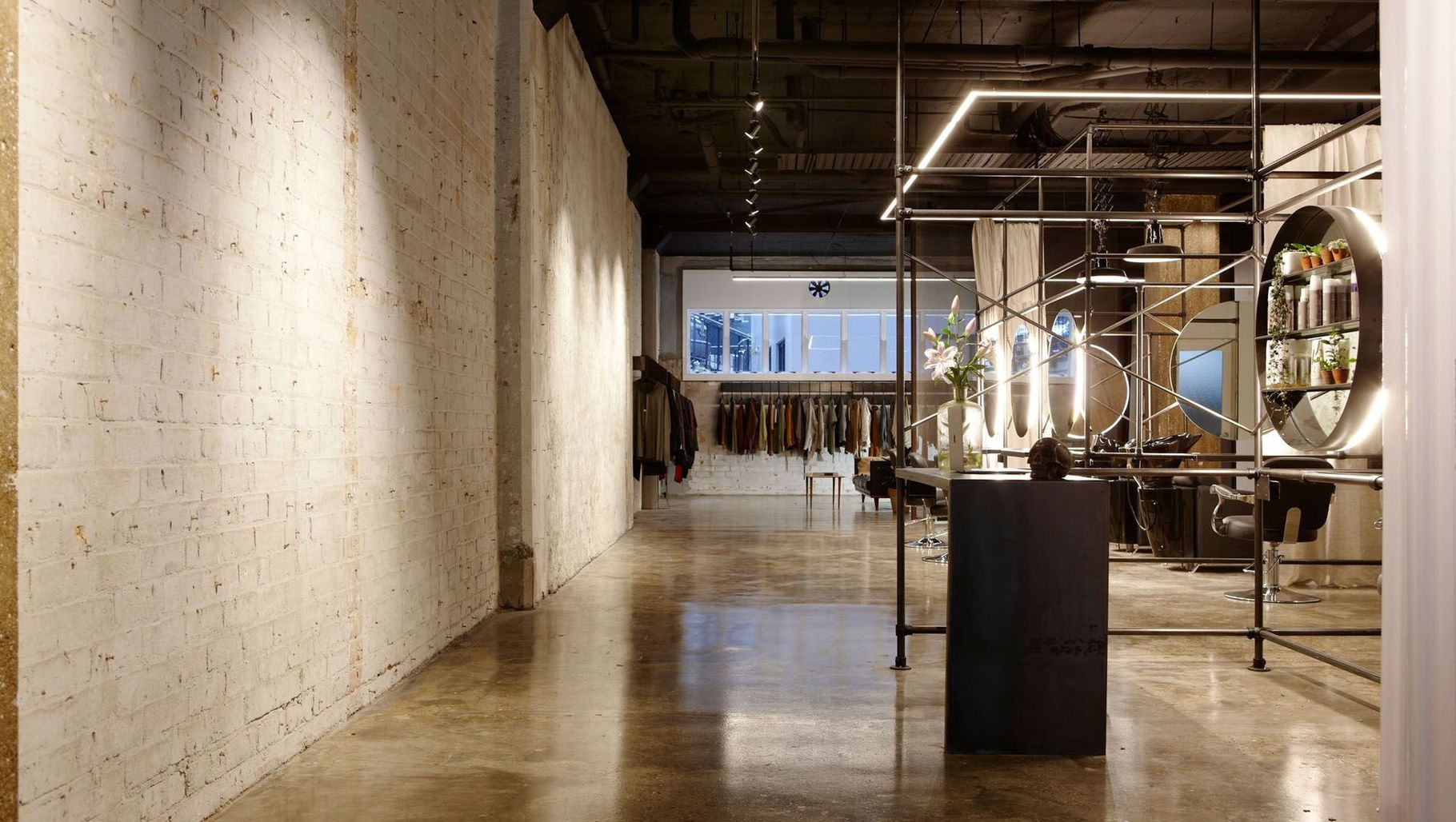 ArchiPro Project Summary - Transforming an industrial space into a glam-industrial hair salon and menswear tailor, featuring a sculptural steel framework, innovative lighting, and a design that fosters exploration and flexibility for fashion shows and exhibitions.
