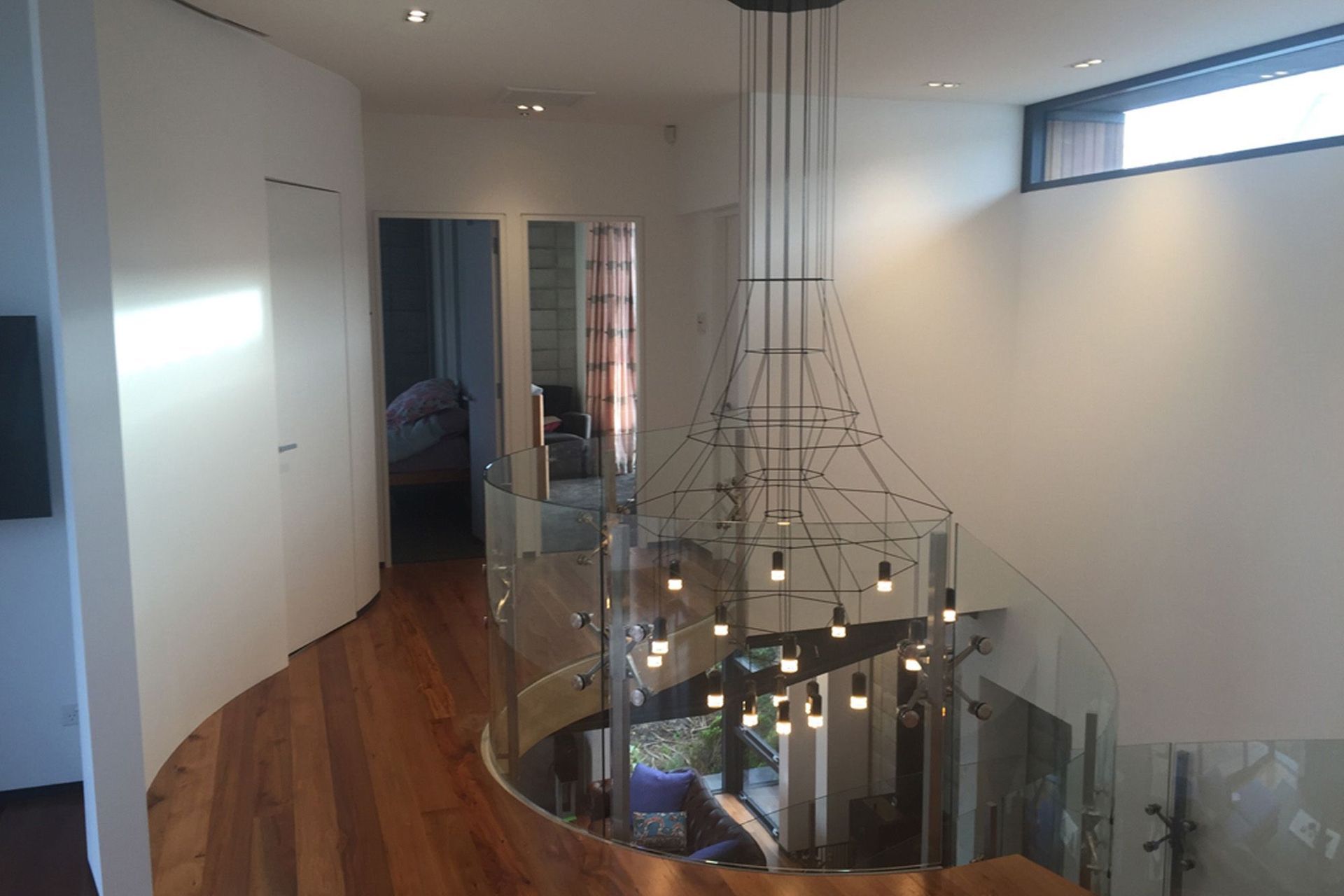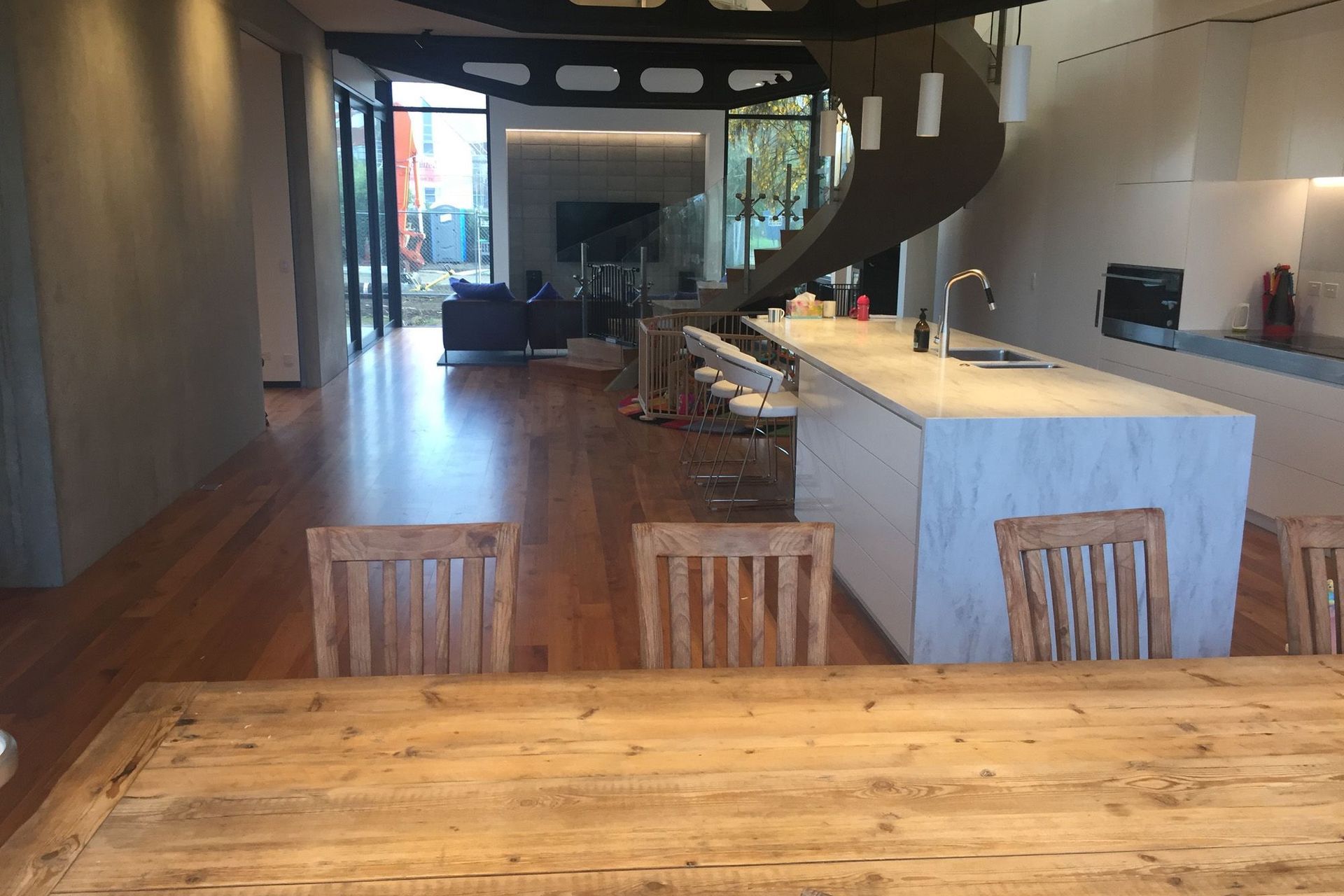 ArchiPro Project Summary - A stunning inner city family home featuring a black precast concrete frame, expansive windows, reclaimed steel from the Christchurch earthquake, recycled rimu flooring, and a striking floating curved staircase.