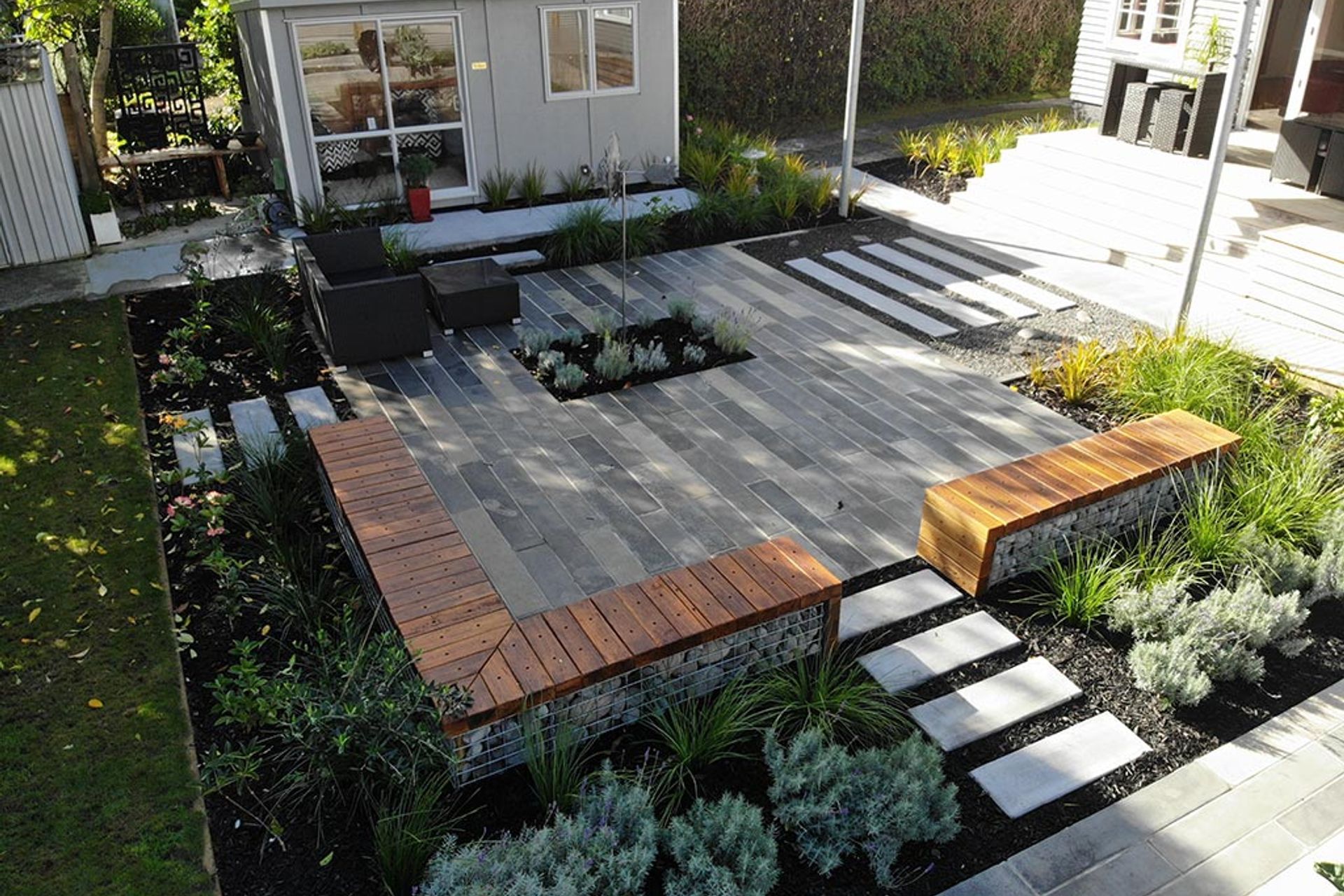 ArchiPro Project Summary - A modern suburban garden transformation featuring a functional courtyard, raised vegetable gardens, and a serene studio workspace, designed to blend contemporary aesthetics with industrial influences.