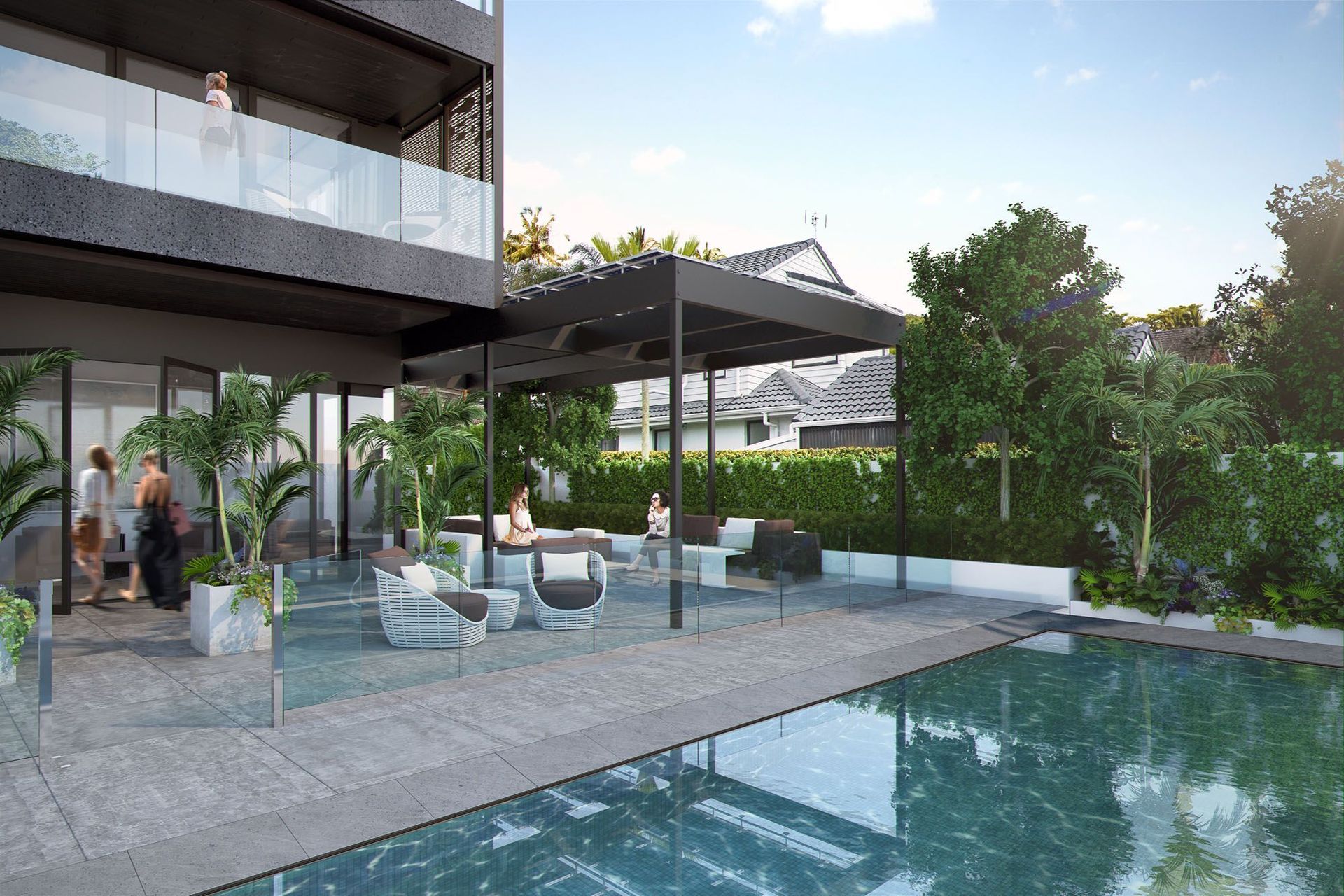 ArchiPro Project Summary - Luxury apartment complex in Takapuna featuring six stories, a mix of one- to three-bedroom units, two penthouse suites, and a communal terrace with swimming pool, all designed to a 6 Homestar standard and incorporating innovative architectural elements.