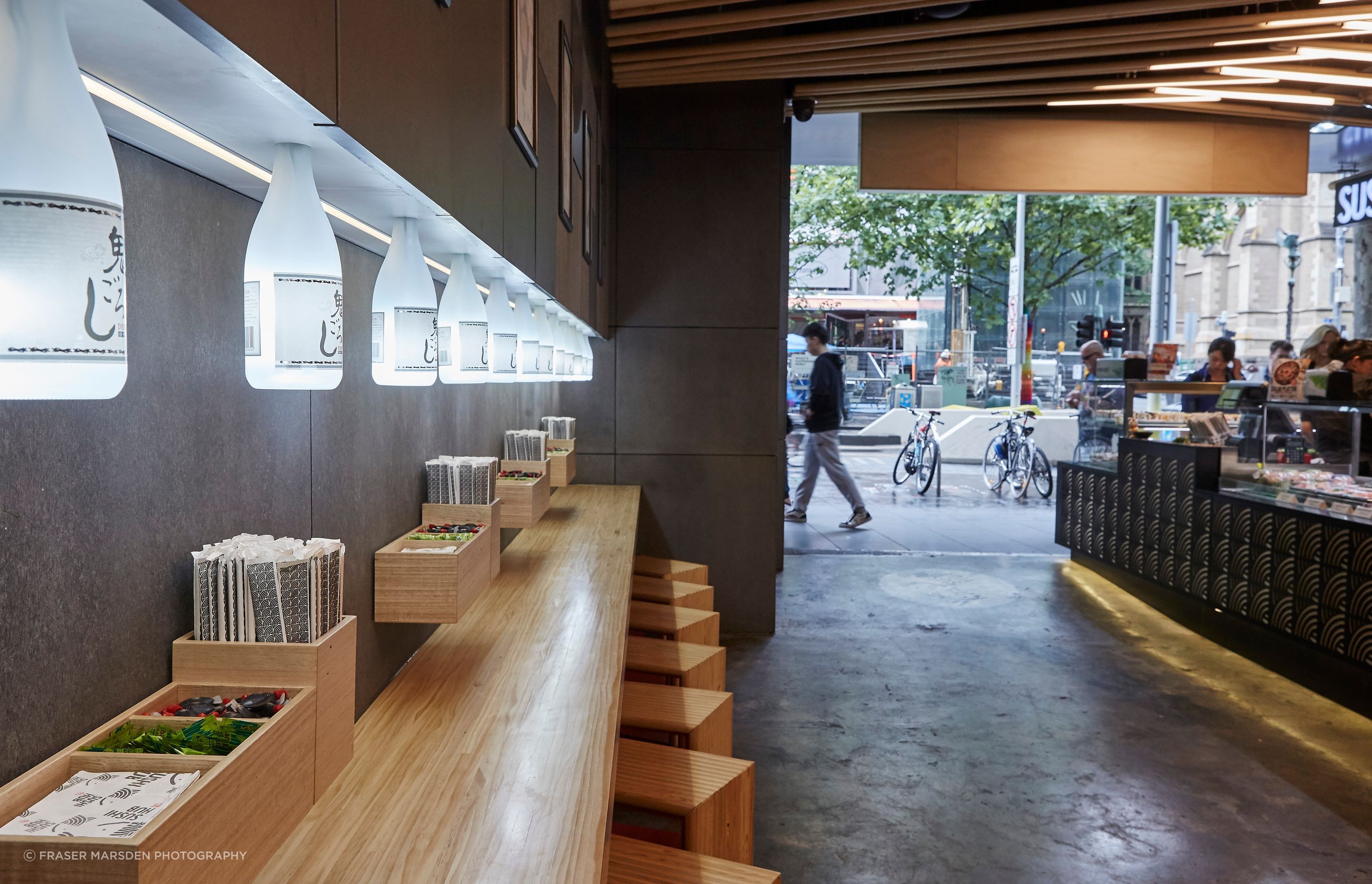 ArchiPro Project Summary - A modern interpretation of traditional Japanese architecture, Sushi Hub Swanston offers a unique grab-and-go dining experience in the heart of Melbourne, completed in 2016.