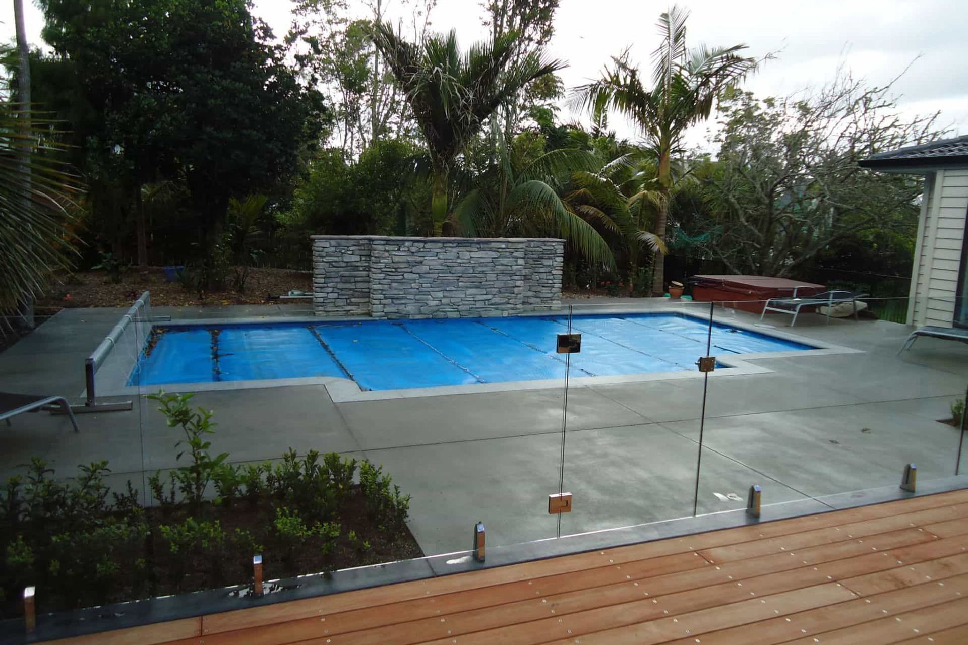 ArchiPro Project Summary - Elegant dark concrete swimming pool surround in Greenhithe, featuring a smooth finish achieved with 10mm Fine Pump mix and 8 kilograms of Black Oxide per cubic meter, expertly pumped through a 50mm line due to limited access.