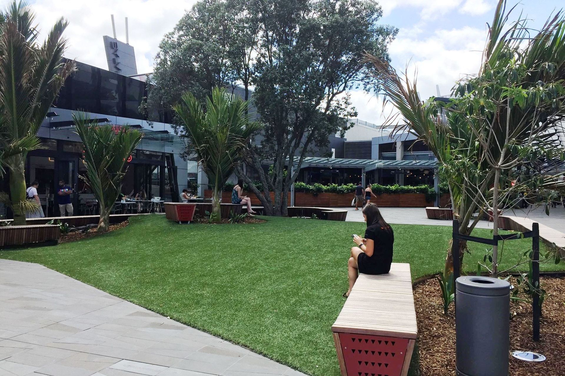 ArchiPro Project Summary - A vibrant green oasis at Sylvia Park, featuring a durable TigerTurf lawn, comfortable seating, and tranquil gardens, providing shoppers a peaceful retreat amidst the bustling cafés and restaurants.