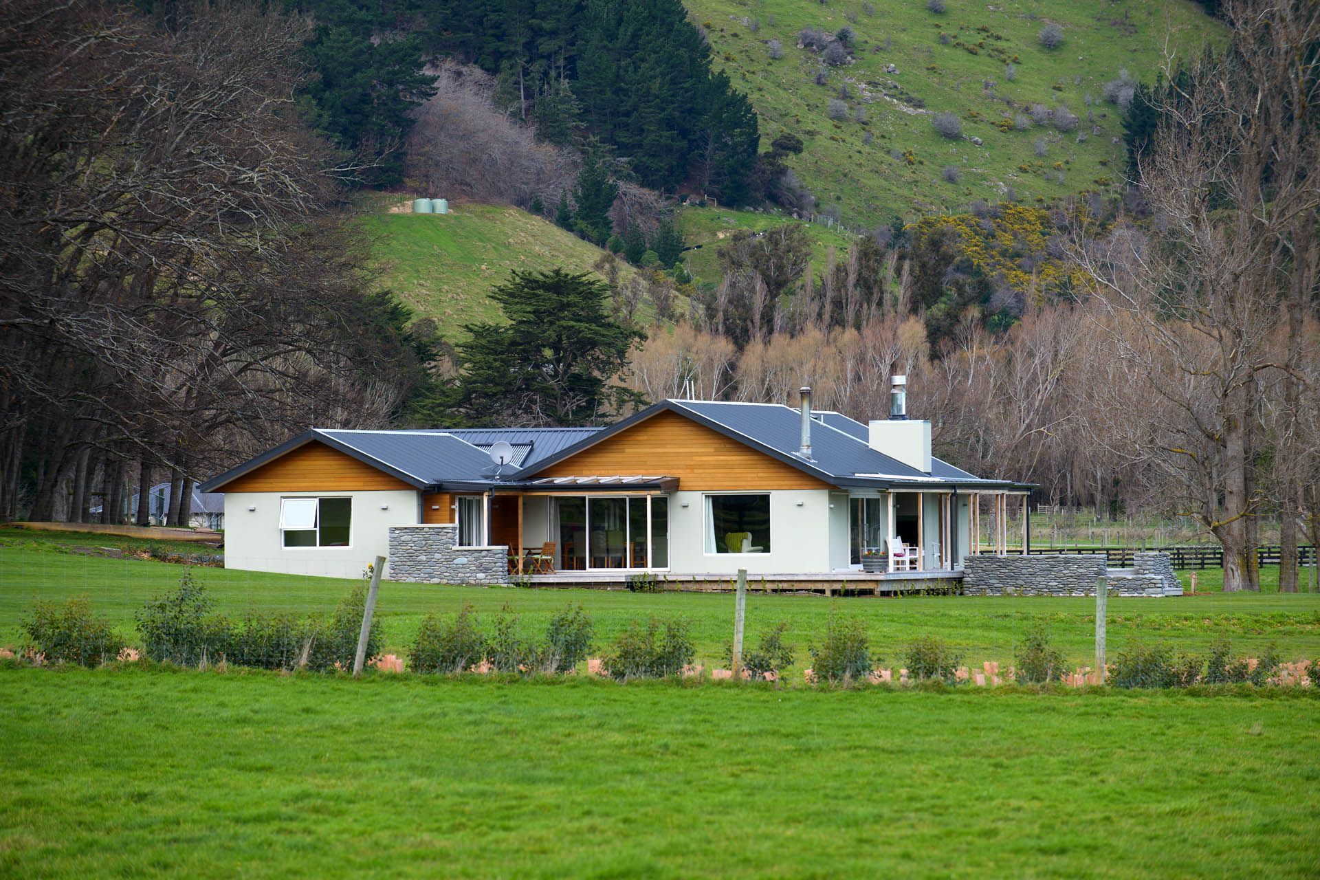 ArchiPro Project Summary - Tai Tapu: A spacious country hideaway featuring a vaulted timber ceiling, Waimakariri Stone fire surround, open-style kitchen, and a strategically designed wraparound verandah for optimal thermal comfort throughout the seasons.