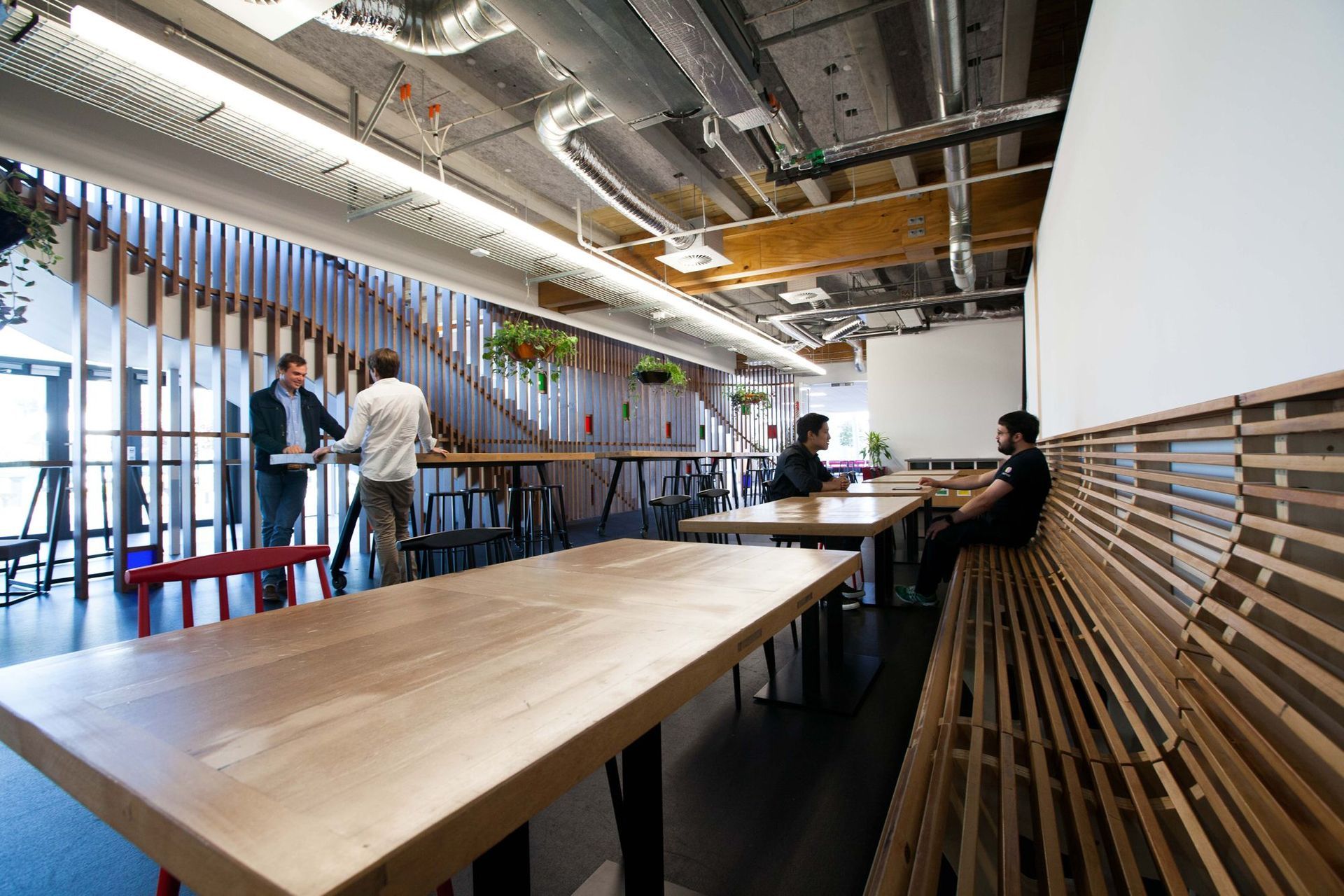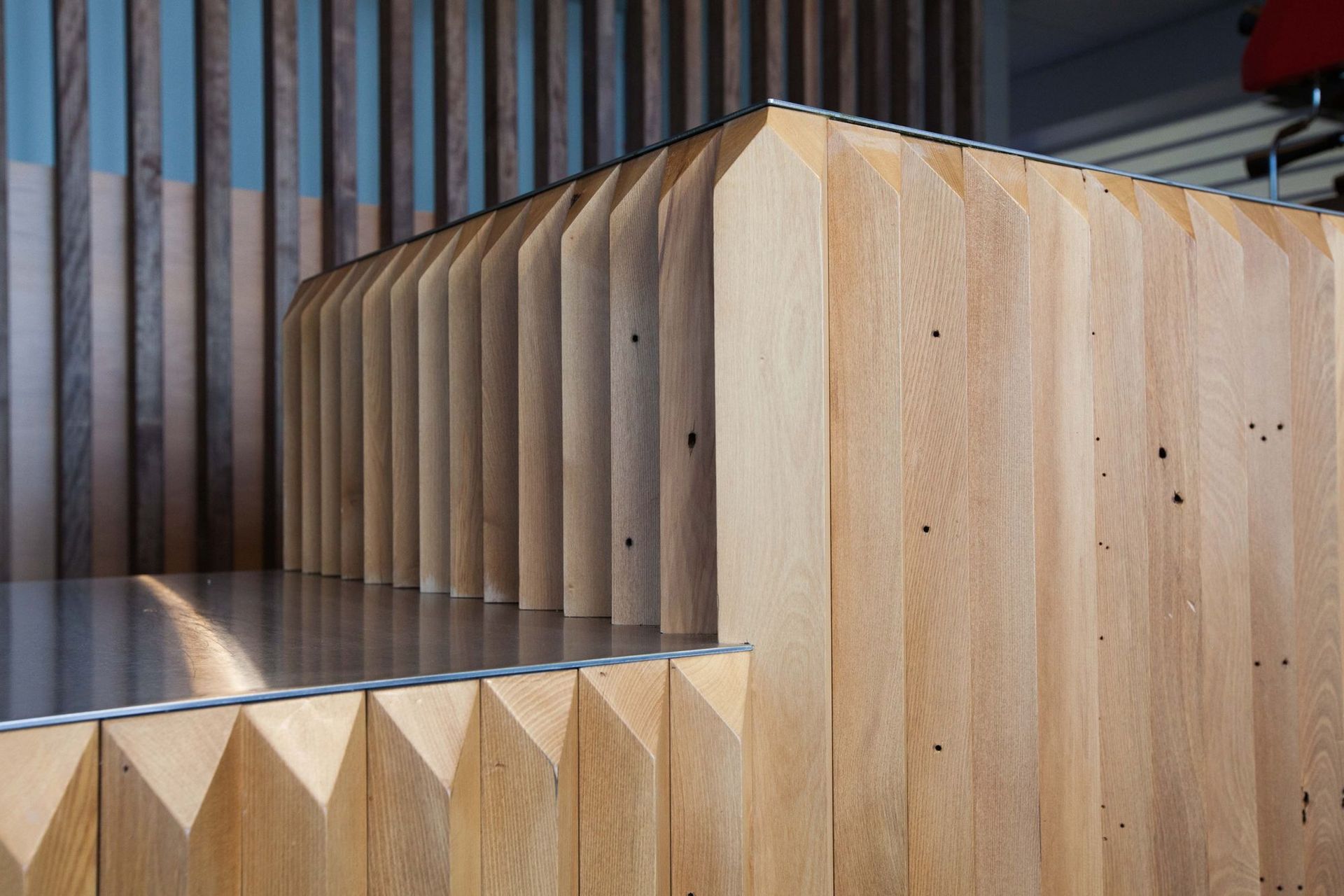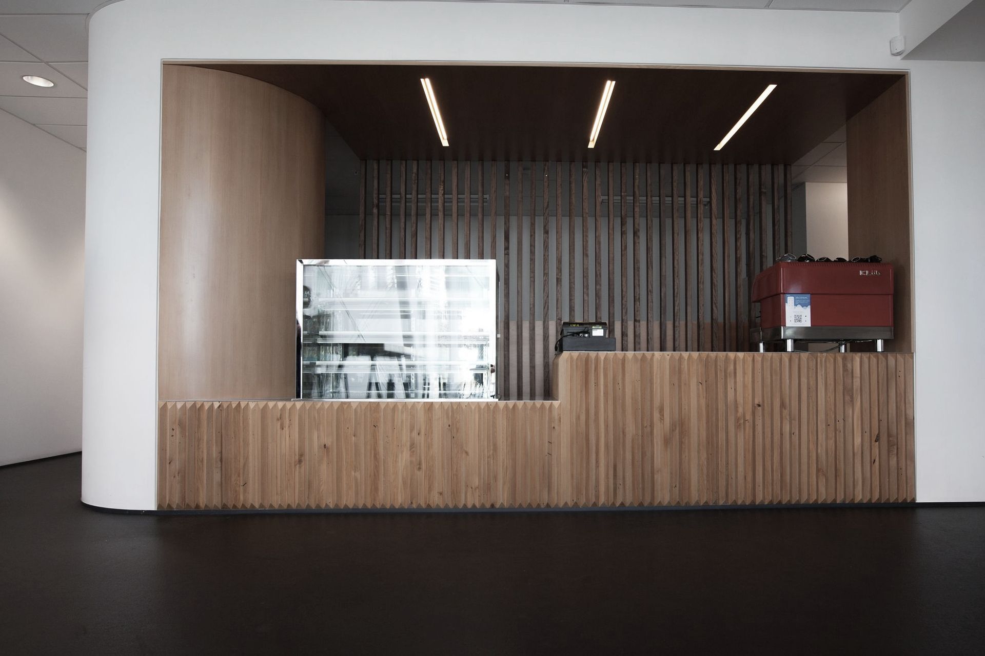 ArchiPro Project Summary - Bespoke café fitout featuring upcycled native timber joinery, crafted from reclaimed materials to align with sustainability goals and enhance the café experience at Tait Communications, Christchurch.