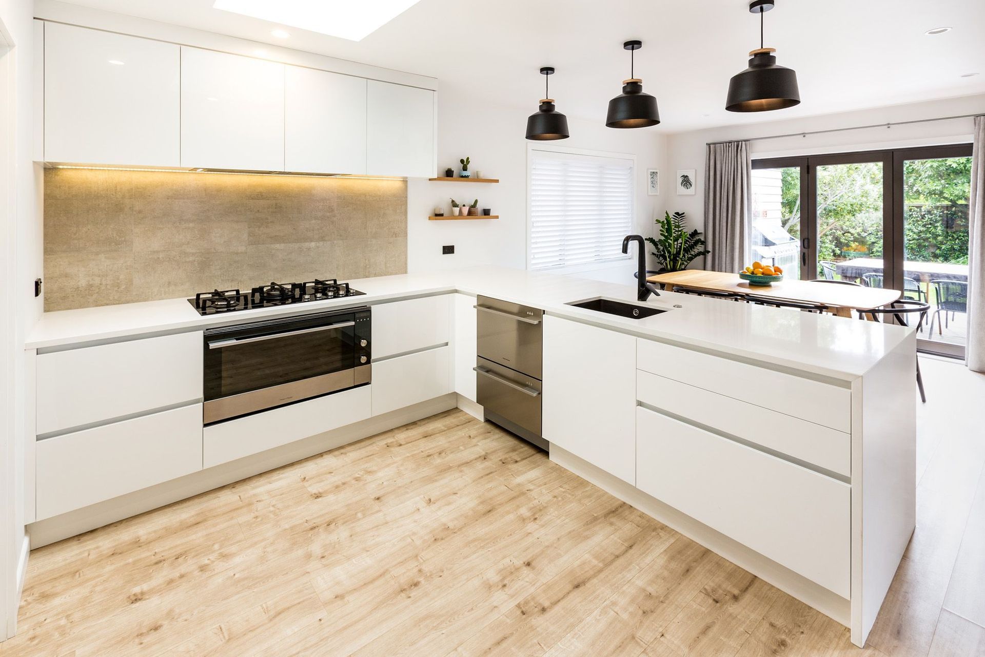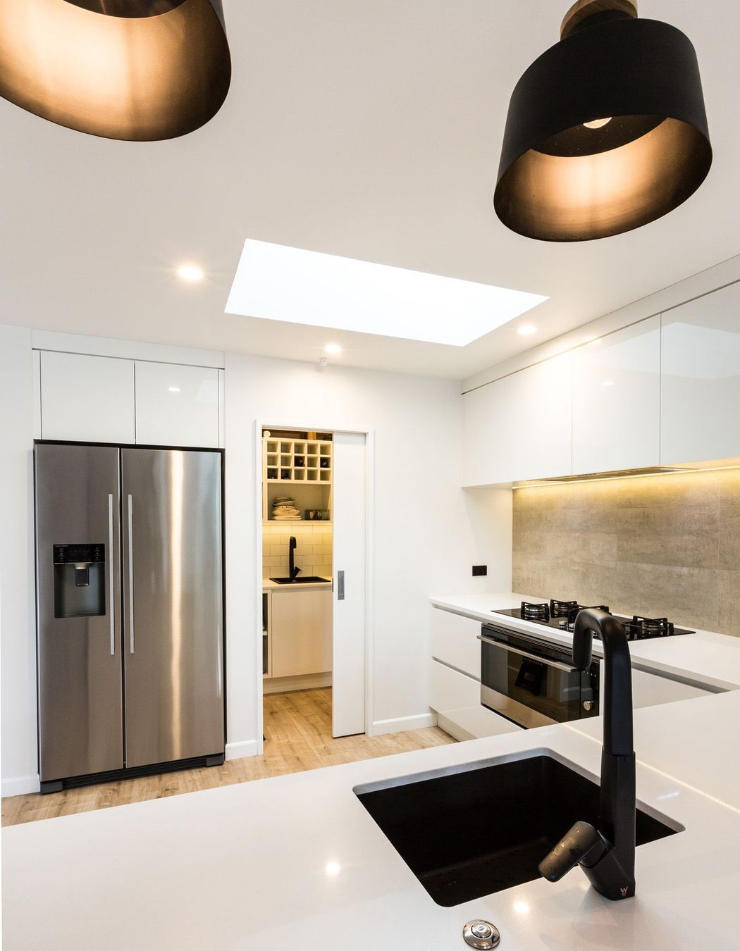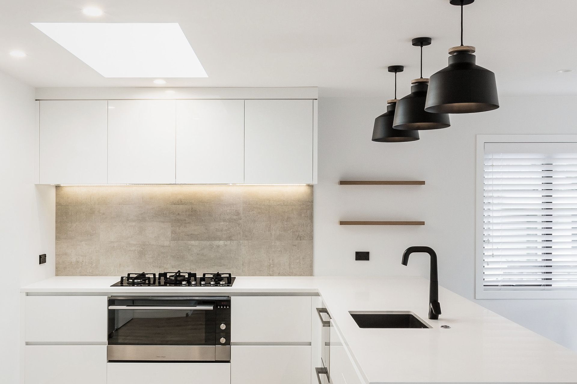 ArchiPro Project Summary - A striking black and white kitchen featuring warm timber flooring and accents, creating a harmonious balance between contemporary design and inviting warmth.