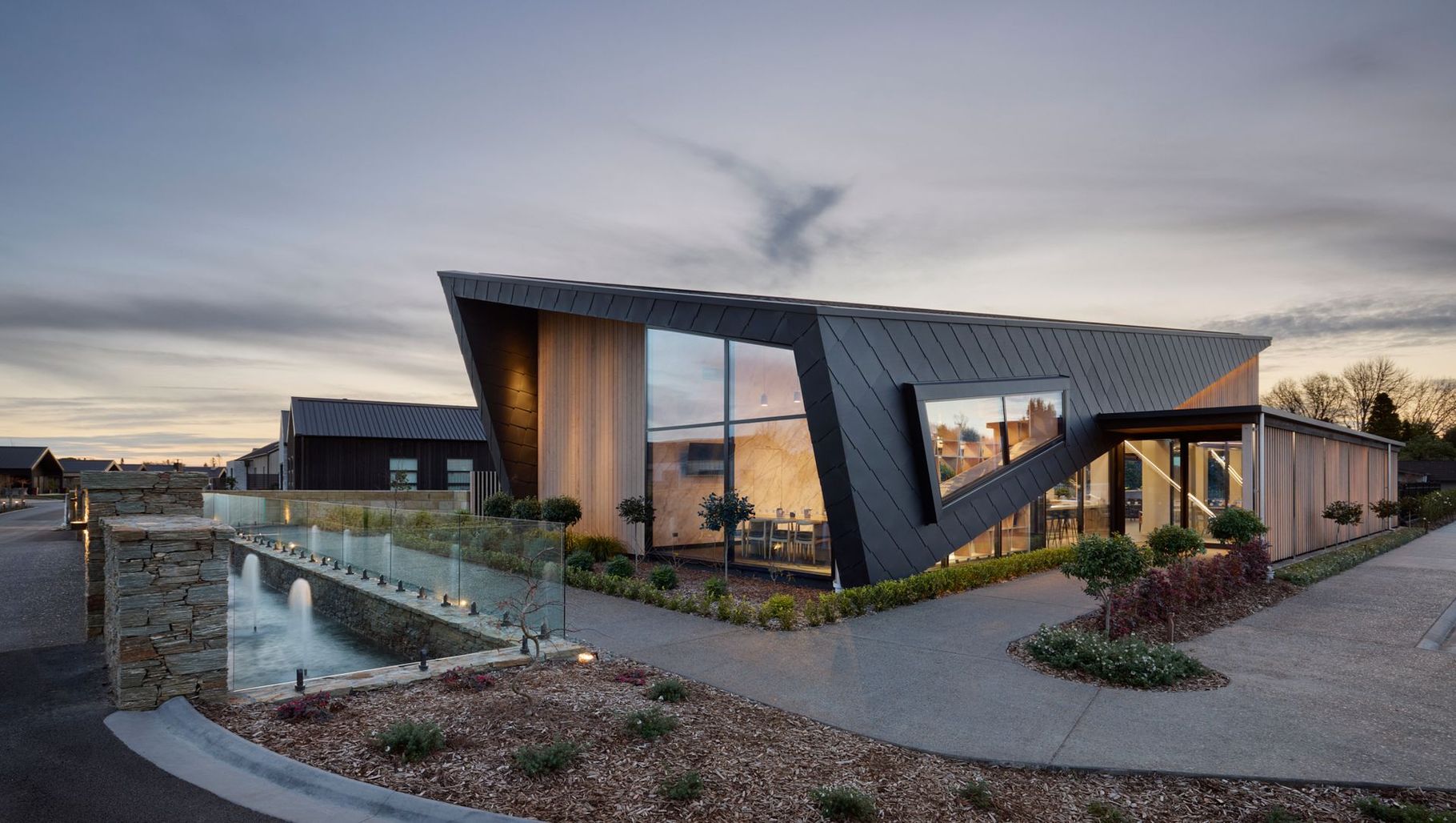 ArchiPro Project Summary - Contemporary café design for Tamahere Country Club featuring a light-filled interior, textured metal cladding, and a unique arched schist bridge, completed in 2023 for the Sanderson Group.