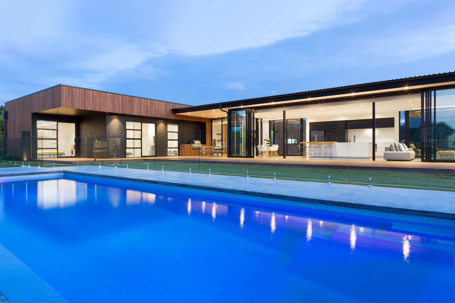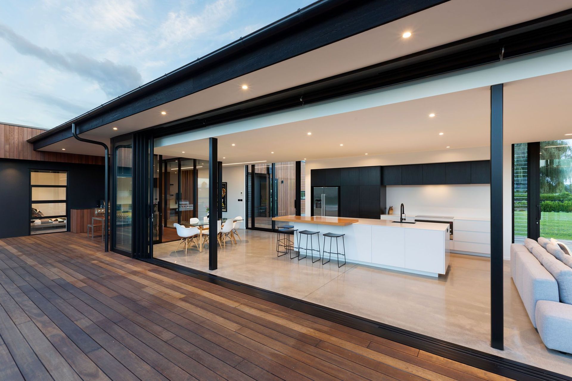 ArchiPro Project Summary - The Tamahere Home showcases modern farmhouse architecture with hardwood siding and inviting garden spaces.