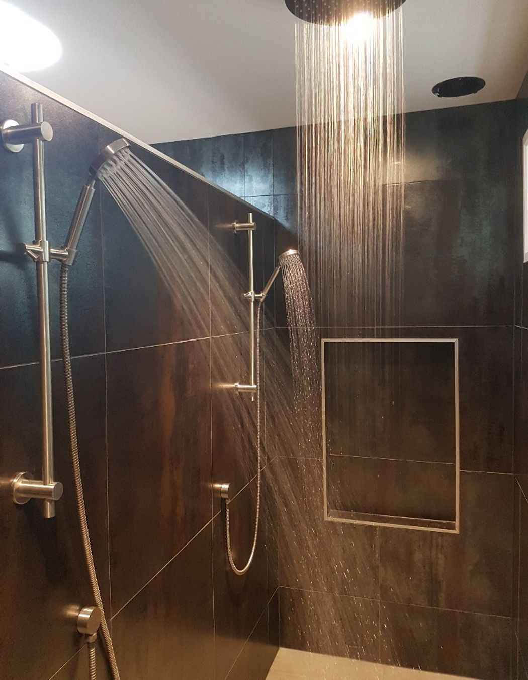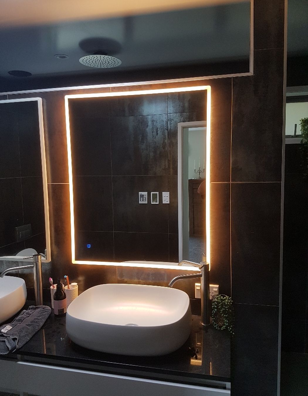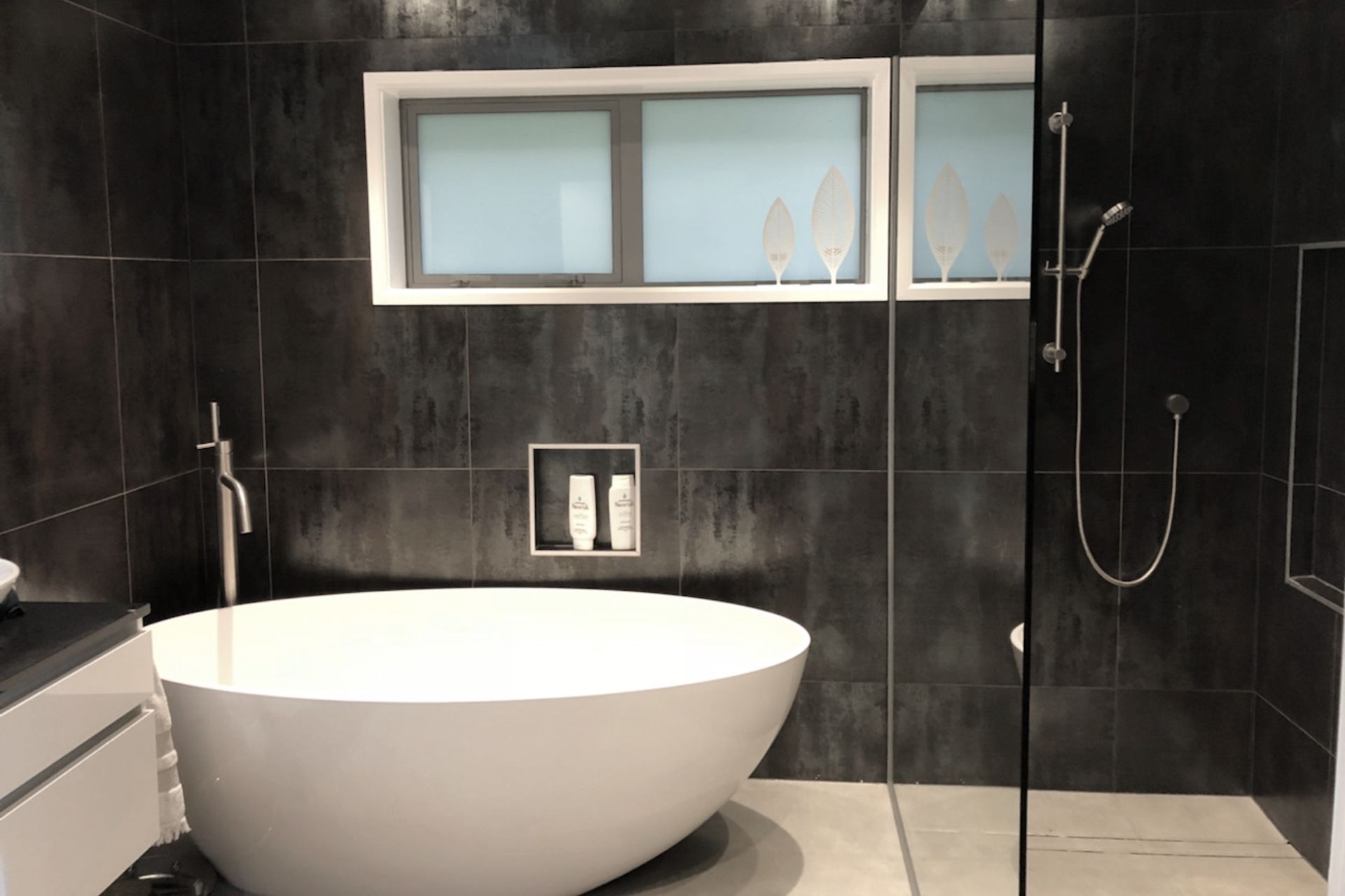 ArchiPro Project Summary - Comprehensive renovation of two 1960s bathrooms featuring full floor-to-ceiling stone tiling, upgraded plumbing, underfloor heating, Italian fittings, and mood lighting for a contemporary aesthetic.