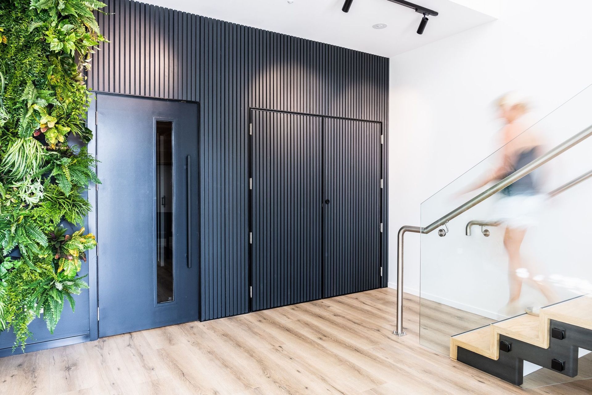 ArchiPro Project Summary - Interior design of a multi-functional commercial building featuring a gym, warehouse, offices, and a design studio, emphasizing cohesive aesthetics, robust finishes, and innovative lighting solutions.