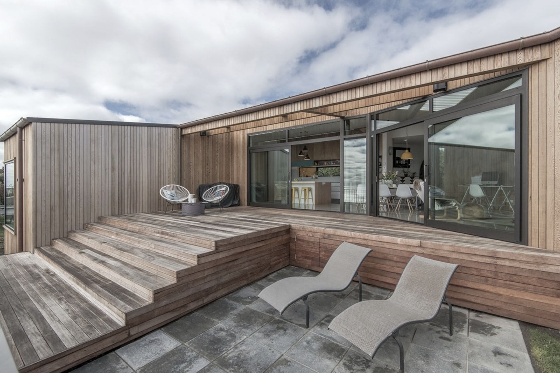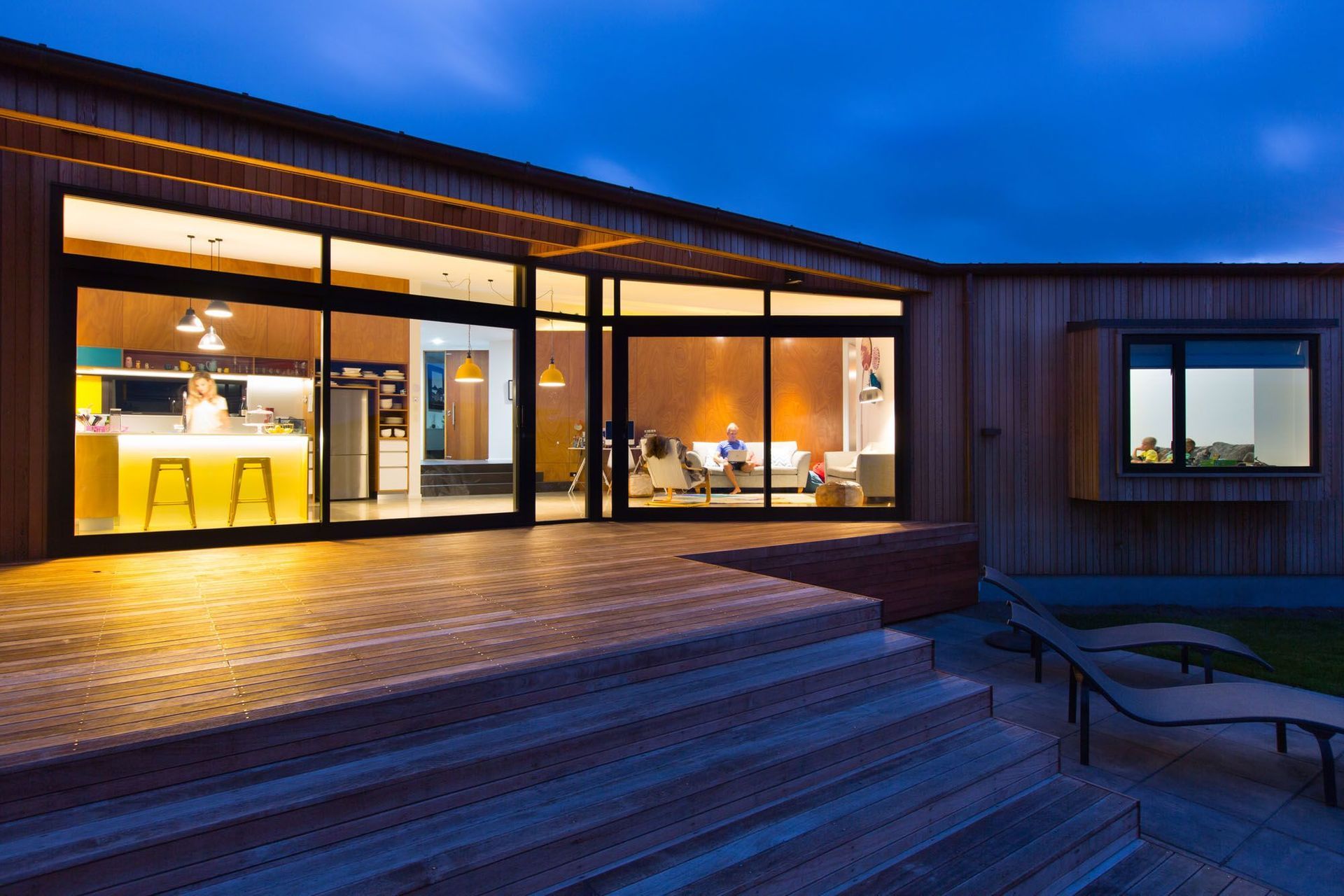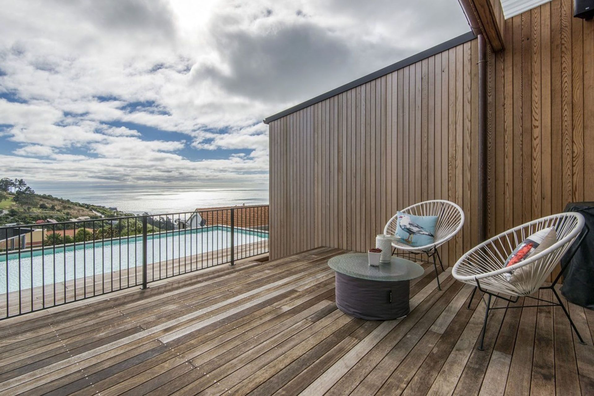 ArchiPro Project Summary - Contemporary hillside home in Sumner, Christchurch, featuring cedar cladding, sweeping ocean views, a swimming pool, and a unique floating gaboon plywood wall that balances open-plan living with private spaces.