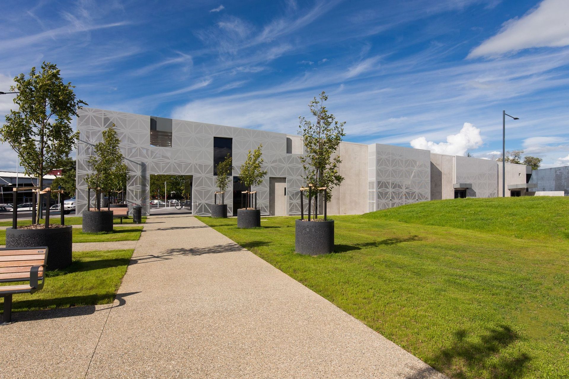 ArchiPro Project Summary - Te Awamutu Library features a modern design with a limited exterior palette of precast concrete, glass, and intricate perforated metal cladding, creating a unique identity while engaging the community and focusing on the human perspective.