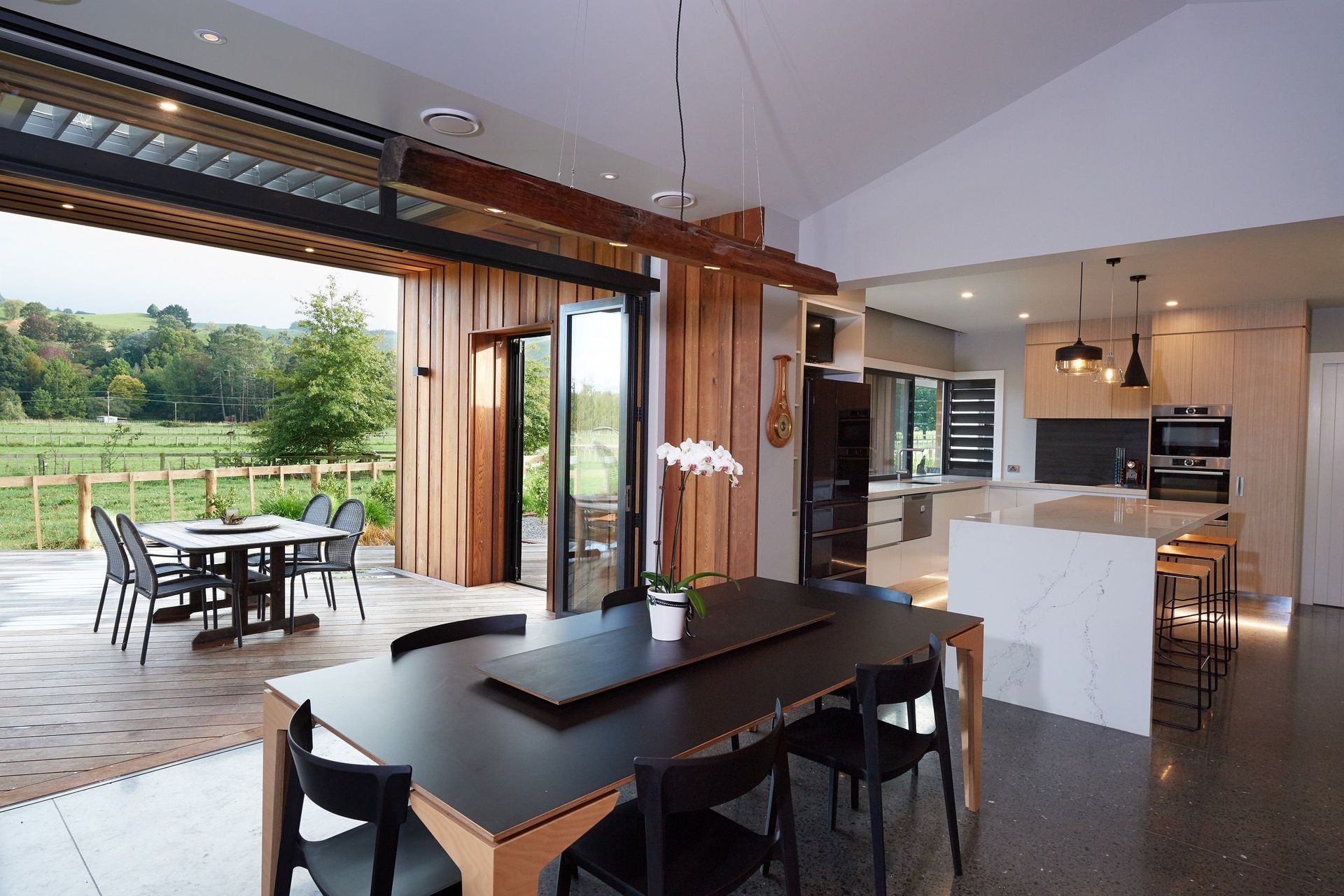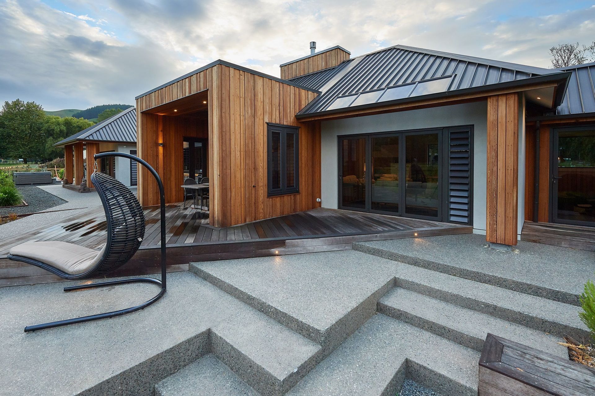 ArchiPro Project Summary - A striking lifestyle home in Te Miro Valley, featuring cedar weatherboards, a dramatic tawa timber entrance, and thoughtfully designed outdoor spaces for entertaining, perfectly balancing form and function for a creative couple.