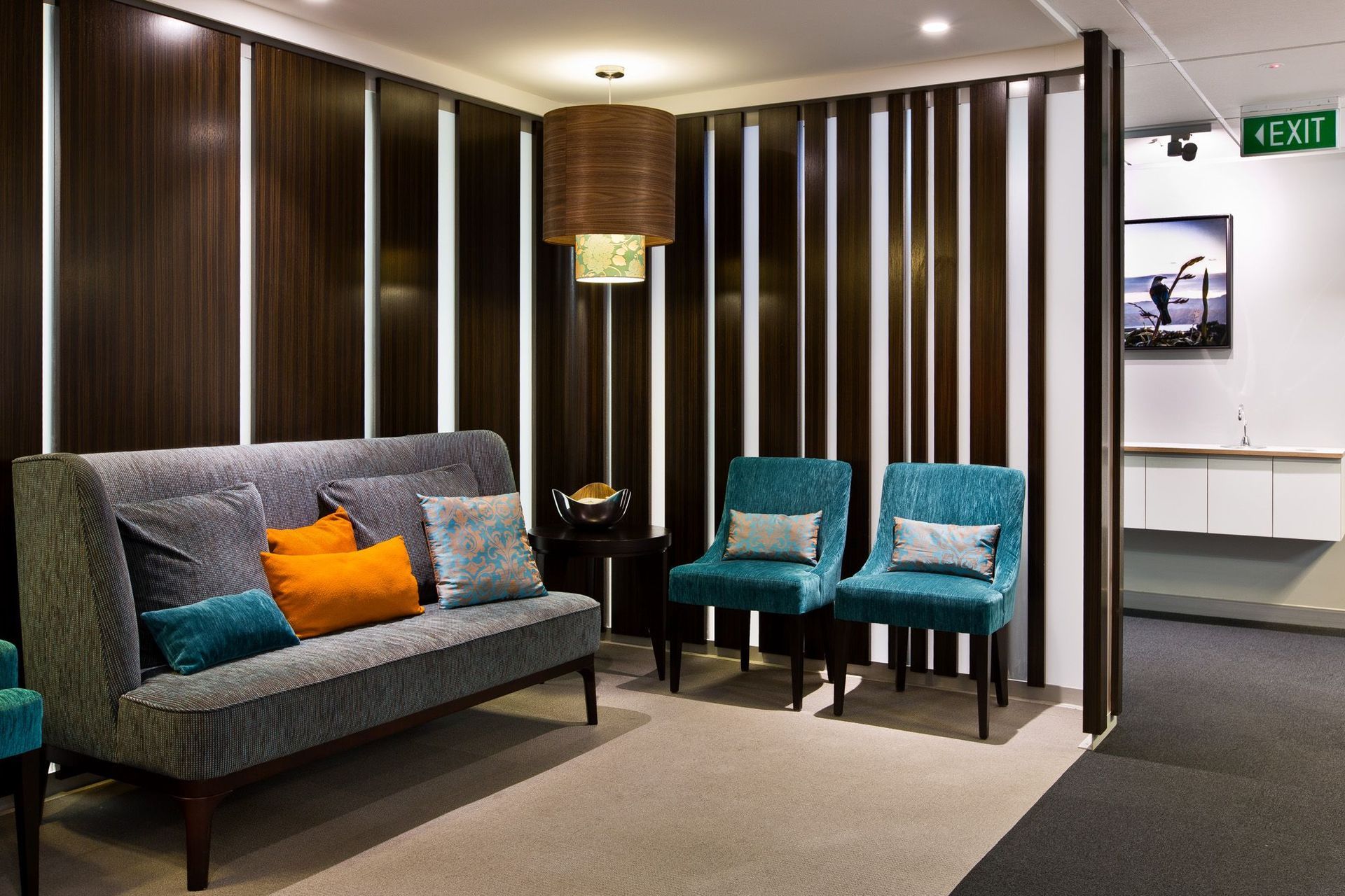 ArchiPro Project Summary - A warm and inviting dental practice designed to feel like a residential lounge, featuring bespoke furniture, vibrant colors, and thoughtful spatial planning to enhance patient comfort and experience.