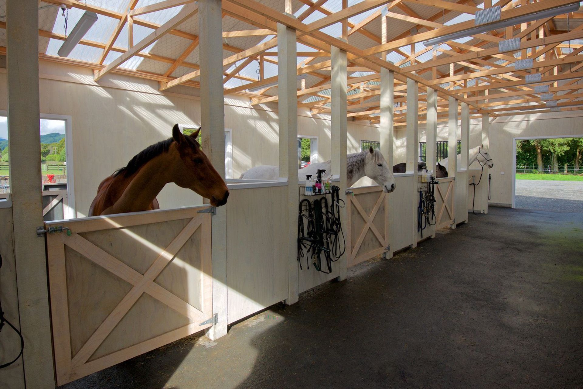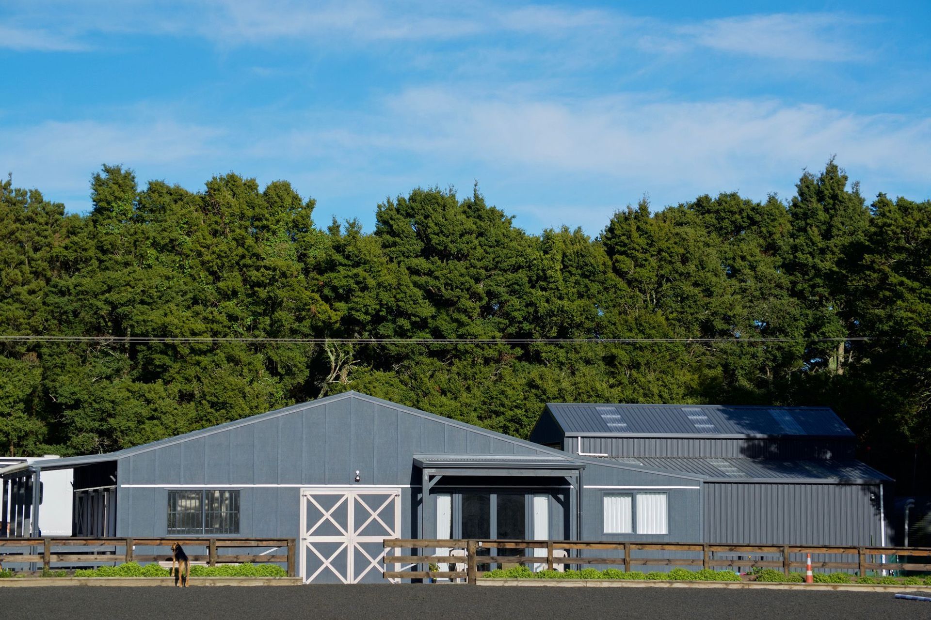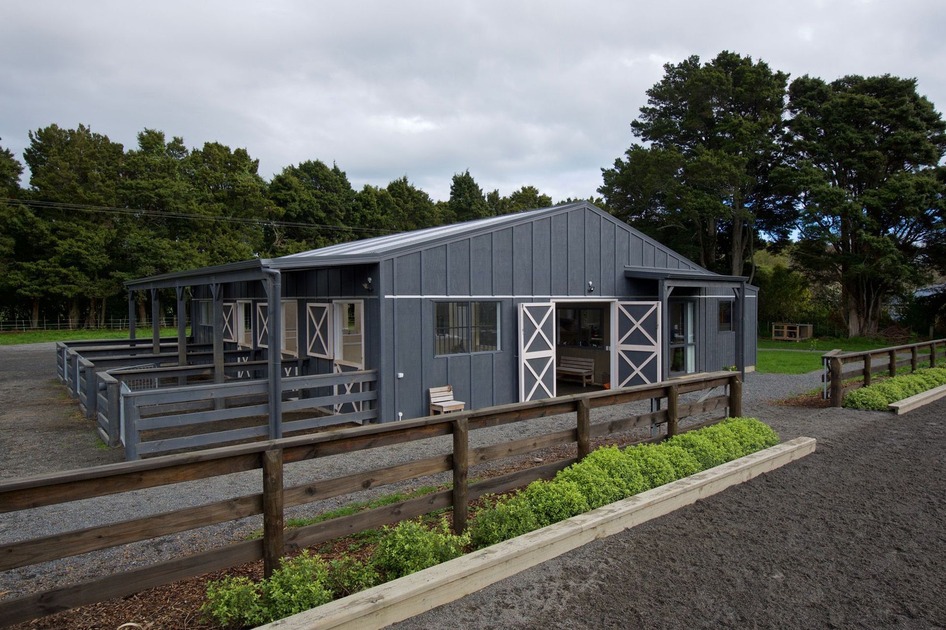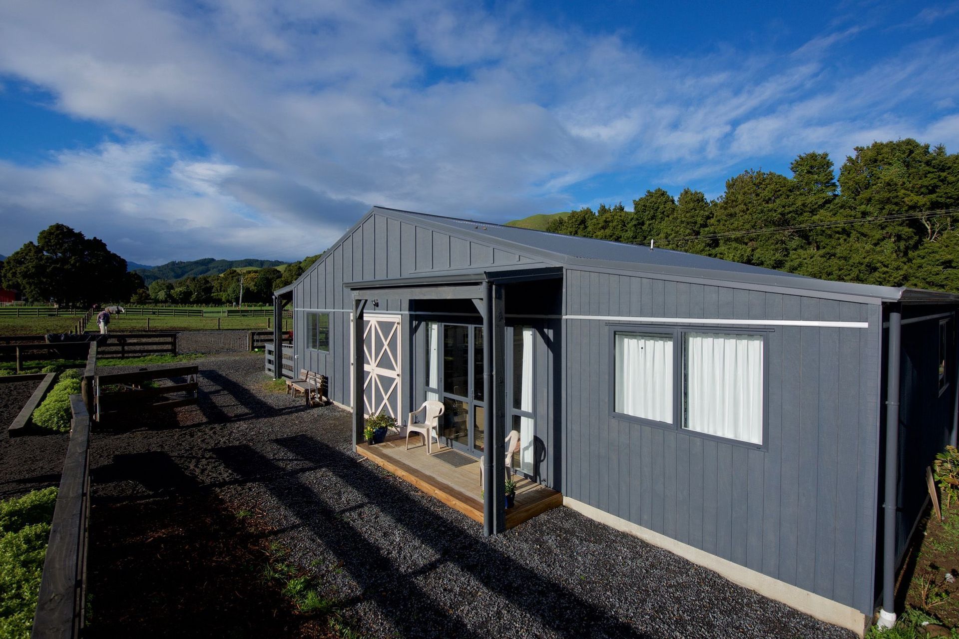 ArchiPro Project Summary - The Bartment: A charming 215m2 equestrian stable and utility building featuring a 57m2 apartment, designed for functionality and natural light, with a focus on low maintenance materials and a seamless connection to the training arena.