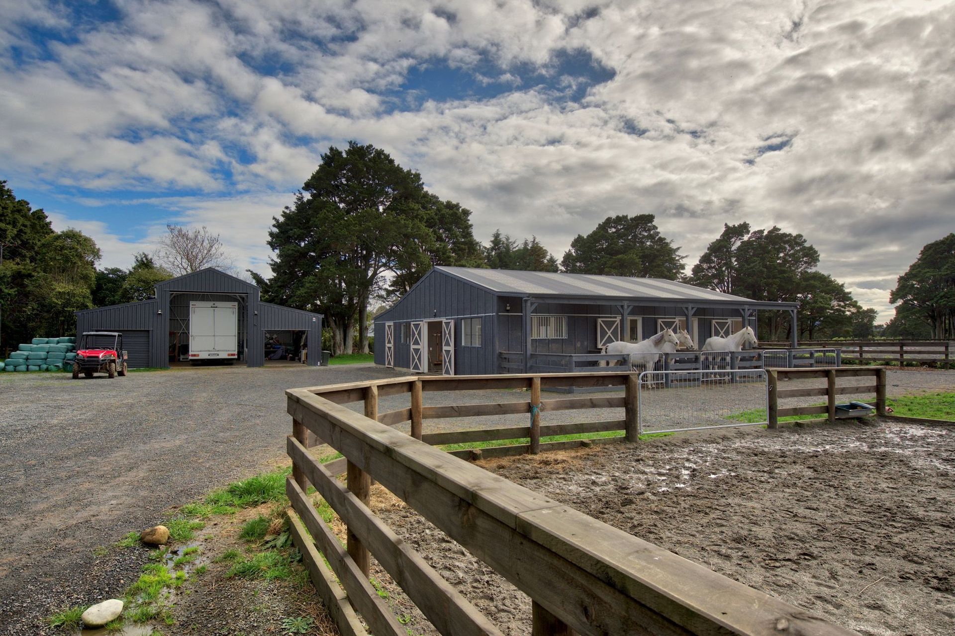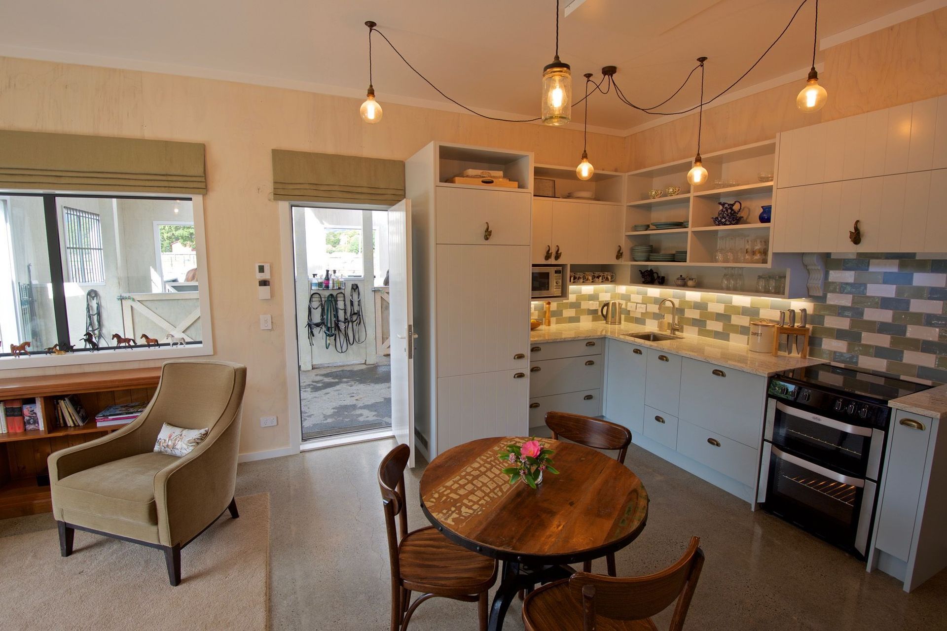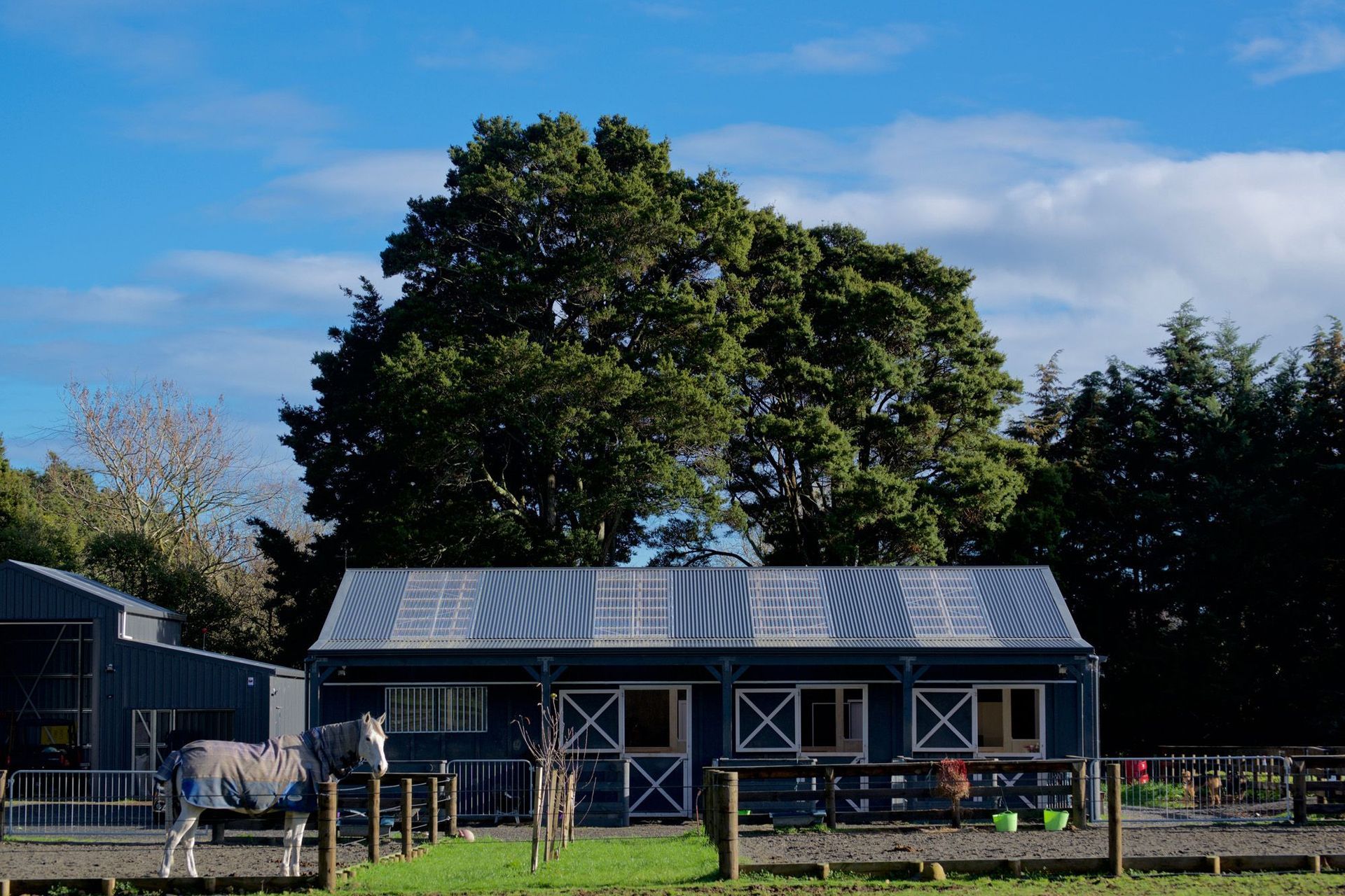 ArchiPro Project Summary - The Bartment: A charming 215m2 equestrian stable and utility building featuring a 57m2 apartment, designed for functionality and natural light, with a focus on low maintenance materials and a seamless connection to the training arena.