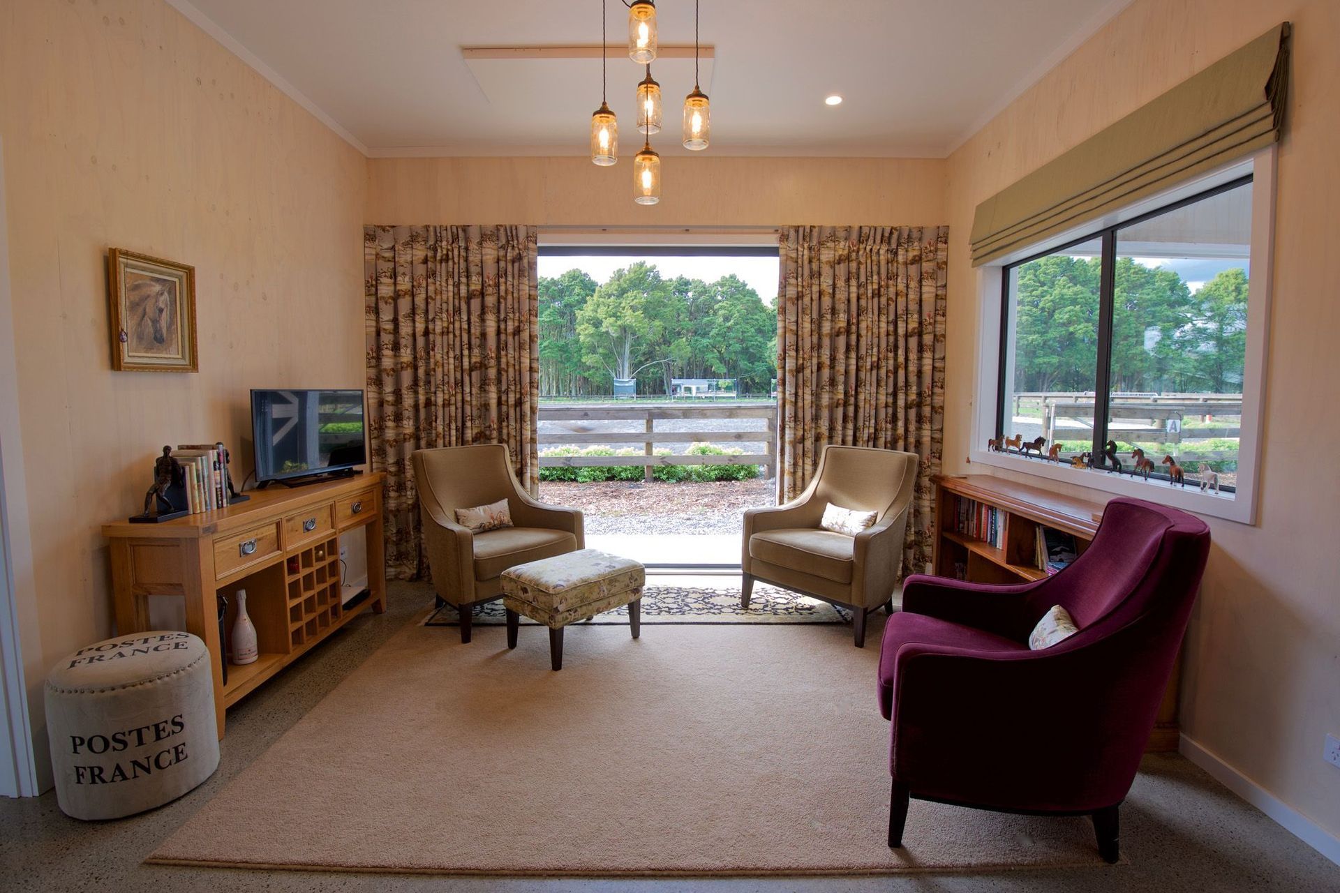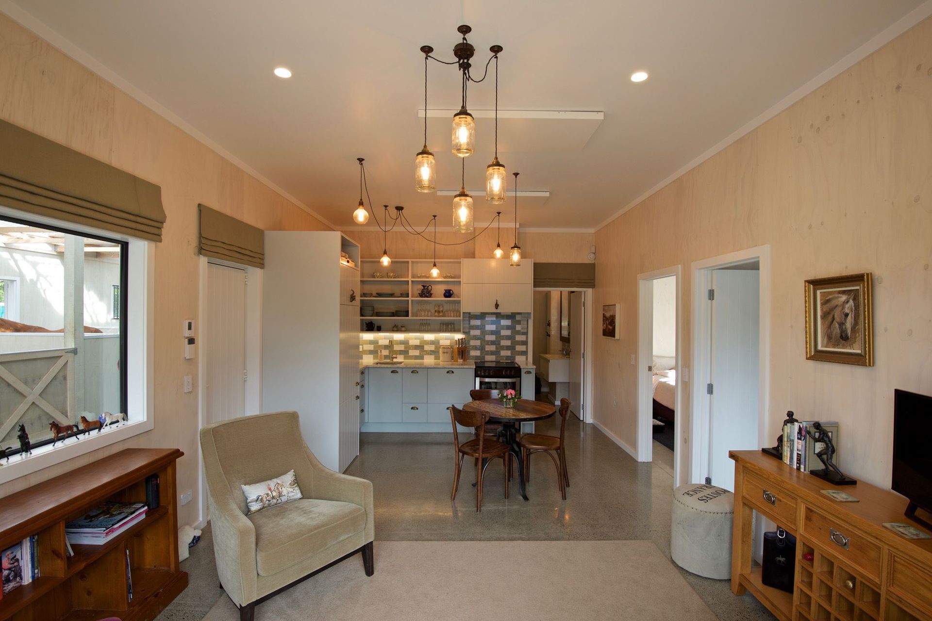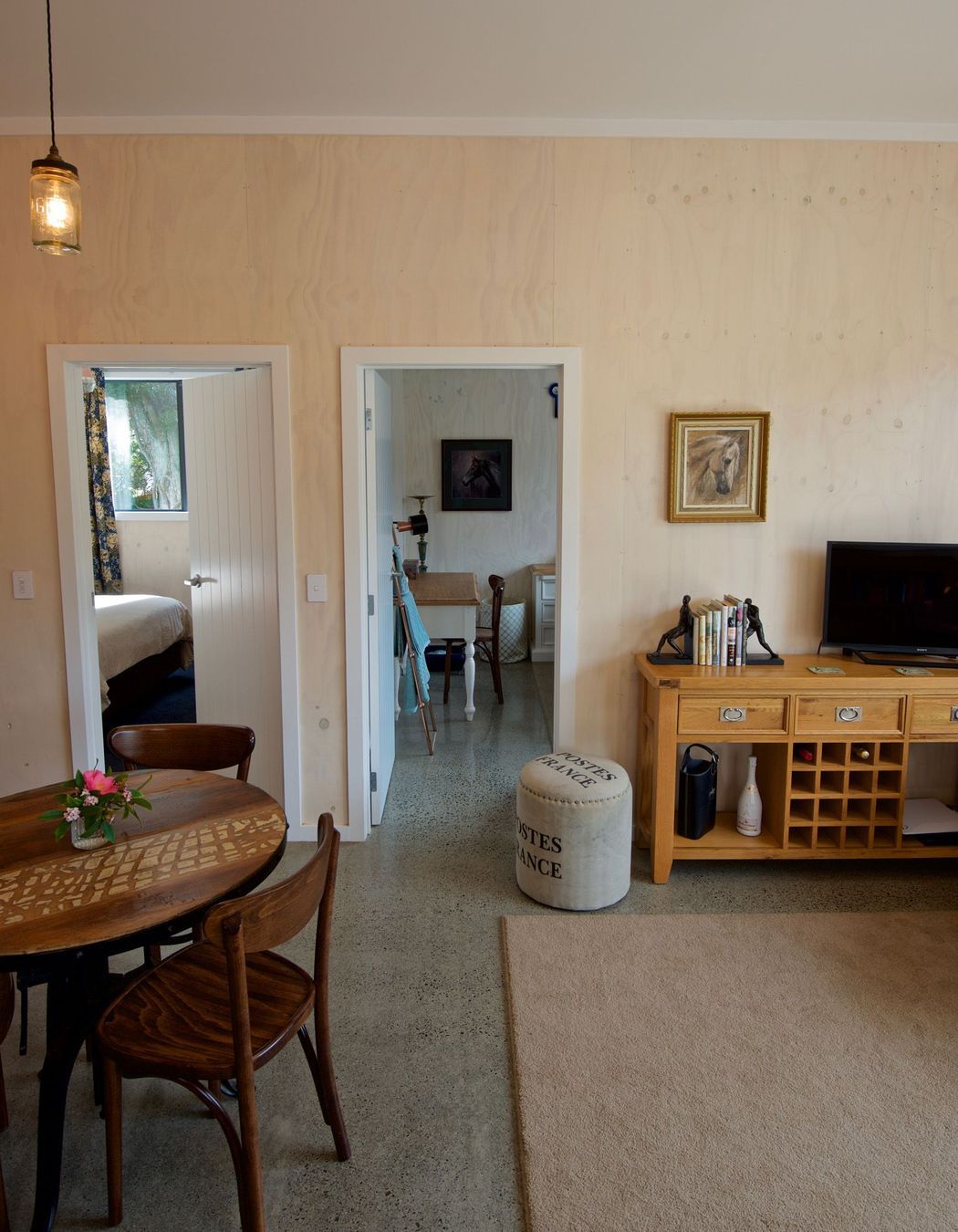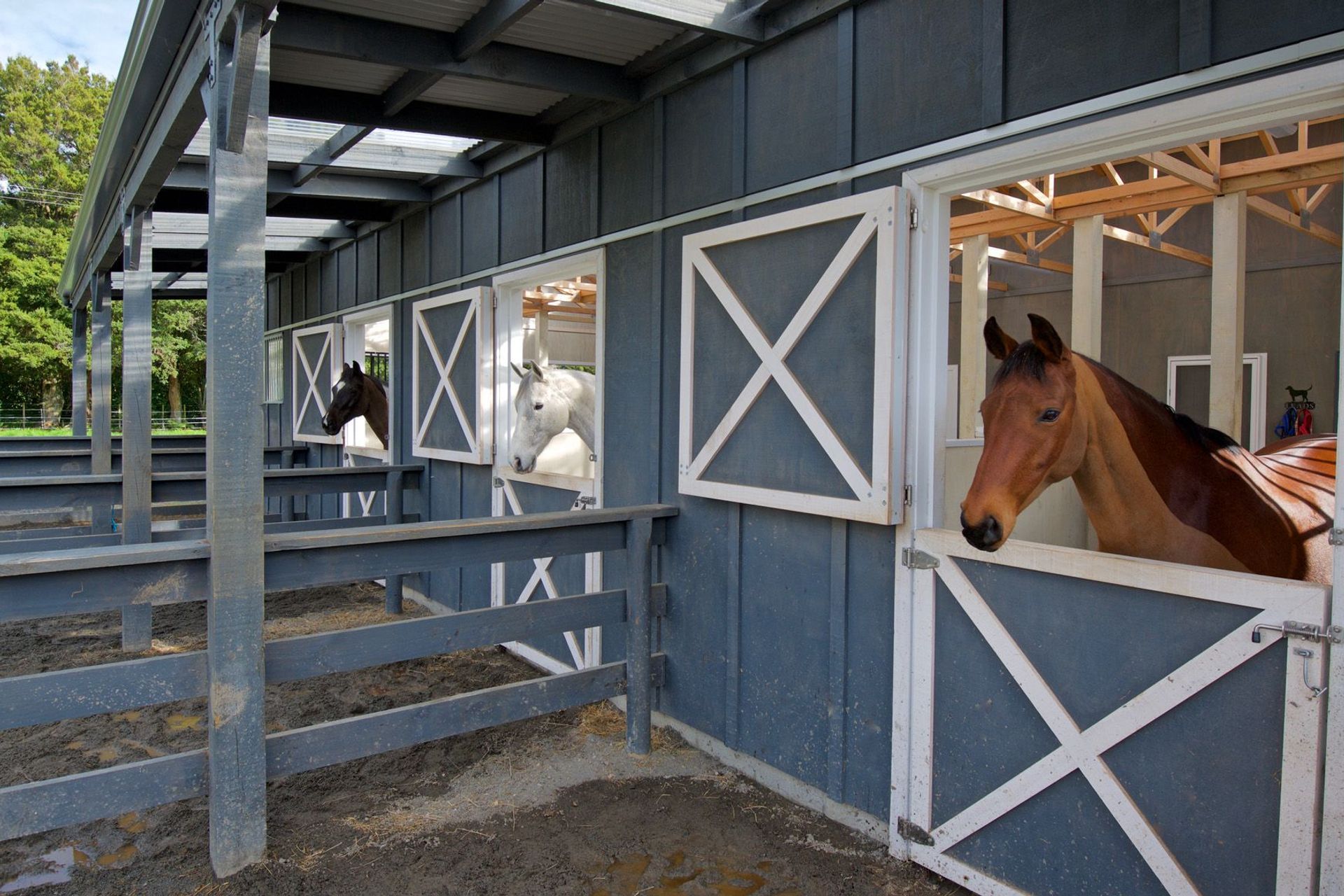 ArchiPro Project Summary - The Bartment: A charming 215m2 equestrian stable and utility building featuring a 57m2 apartment, designed for functionality and natural light, with a focus on low maintenance materials and a seamless connection to the training arena.