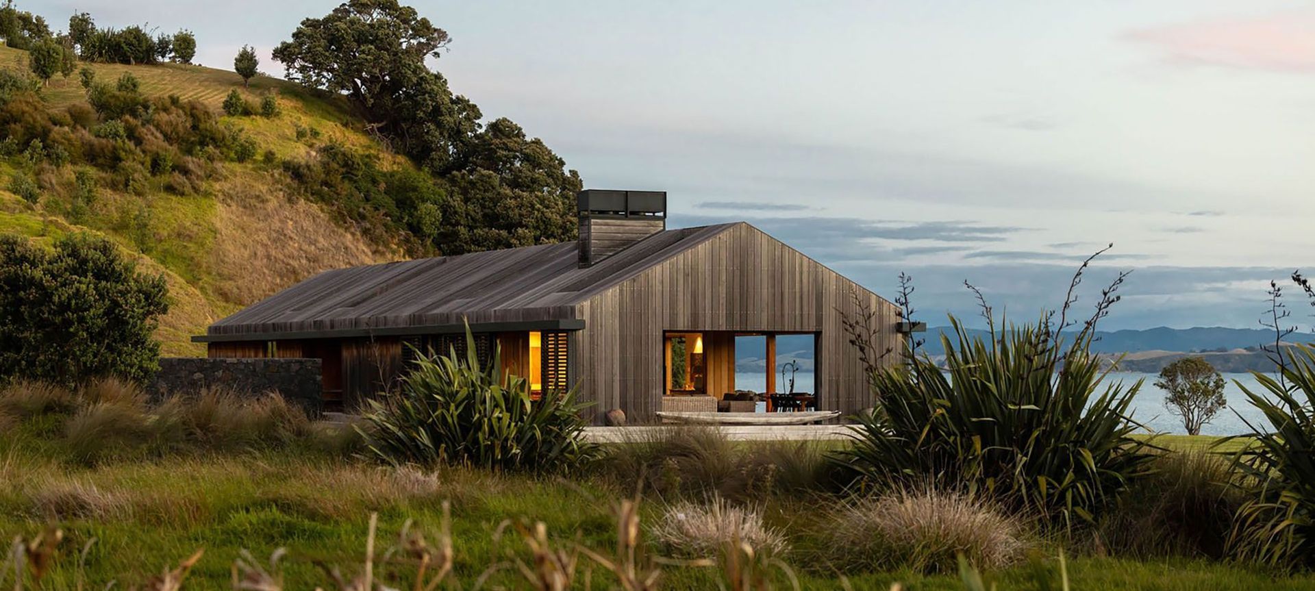 ArchiPro Project Summary - A secluded Waiheke Island dwelling, elegantly wrapped in silvered cedar, inspired by traditional agricultural building forms.