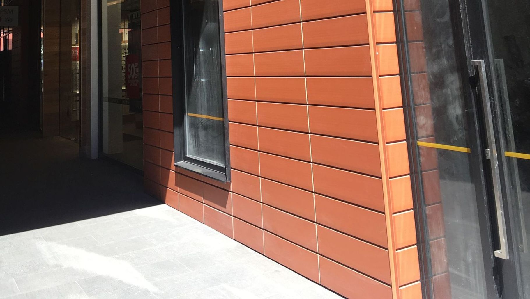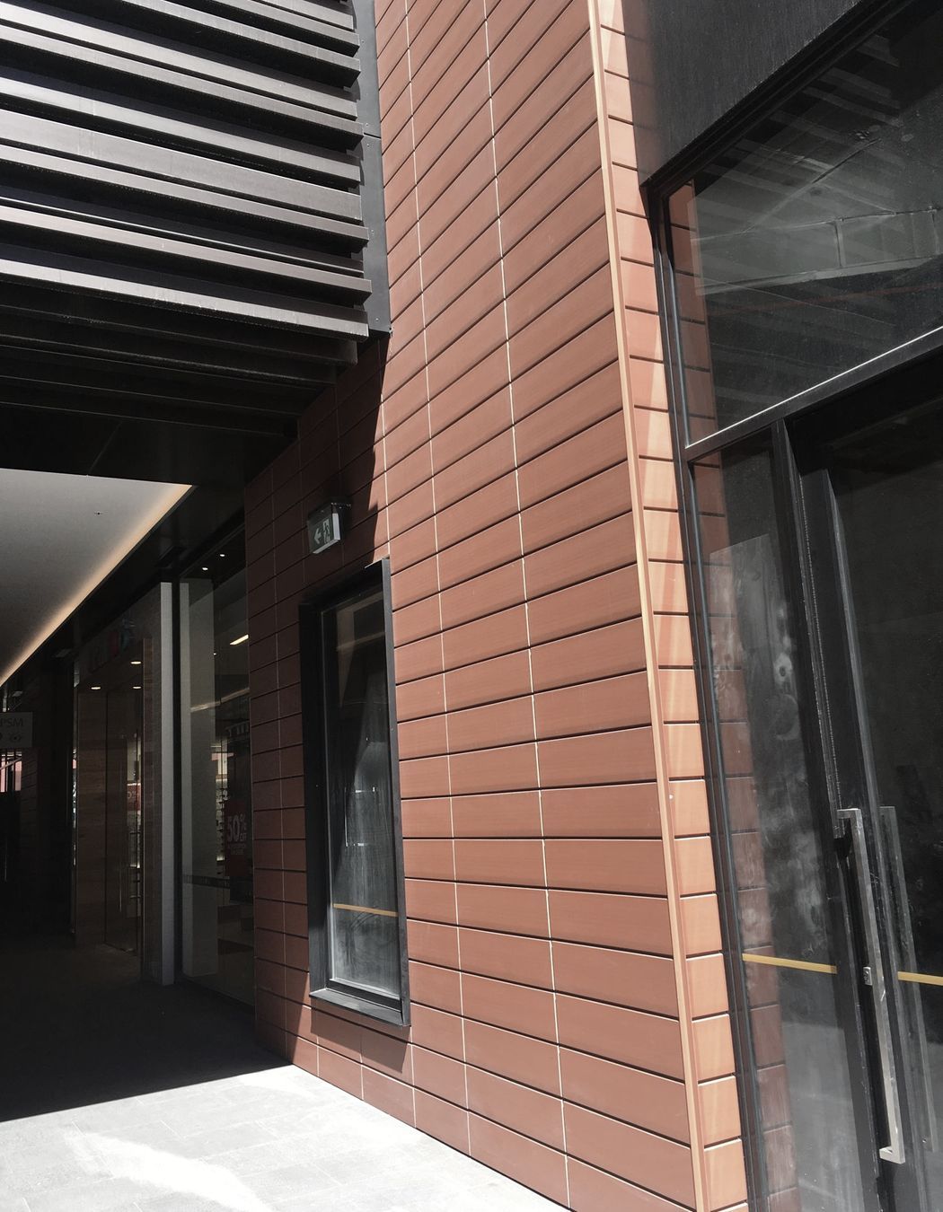 ArchiPro Project Summary - The Crossing Precinct: A showcase project in Christchurch CBD featuring Maxclad Terracotta Tiles, enhancing the rail system and adding texture to the overall build, demonstrating KSI's capabilities in collaboration with Southbase Construction Ltd.