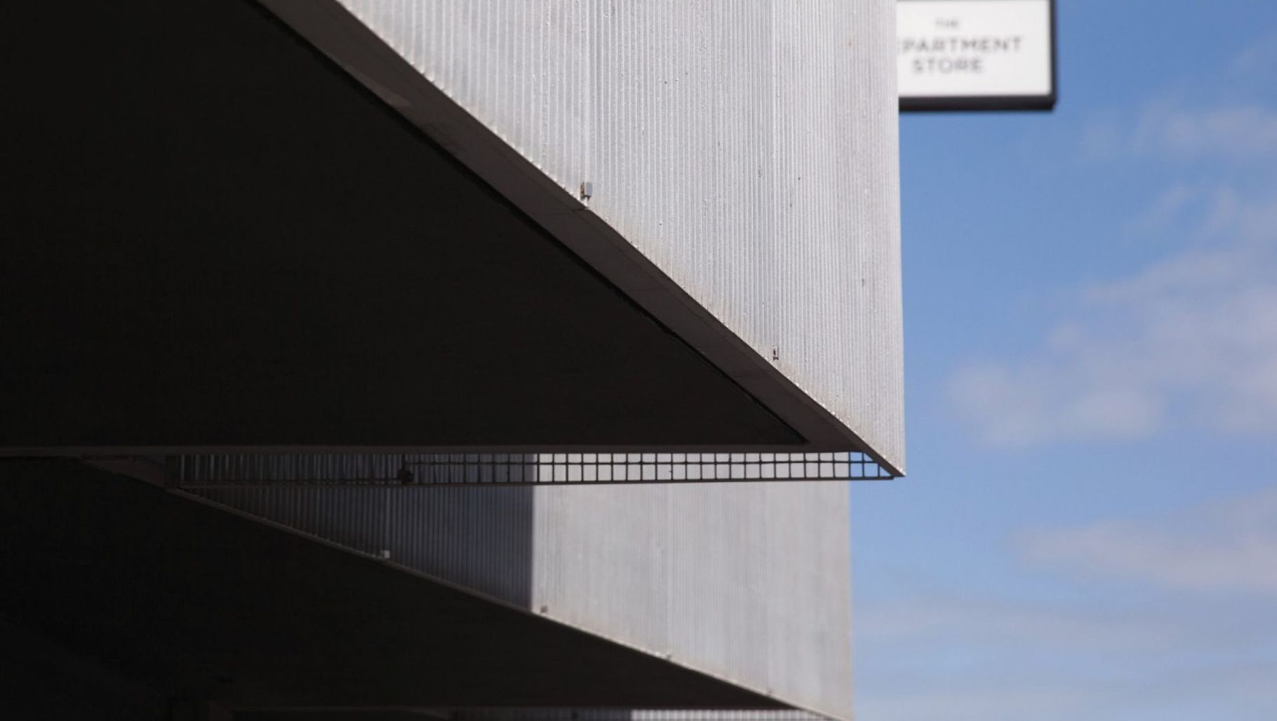 ArchiPro Project Summary - A transformative department store project revitalizing a 1980s structure with a striking façade featuring staggered balconies and industrial mesh, creating a unified and dynamic presence that evolves with the viewer's perspective.