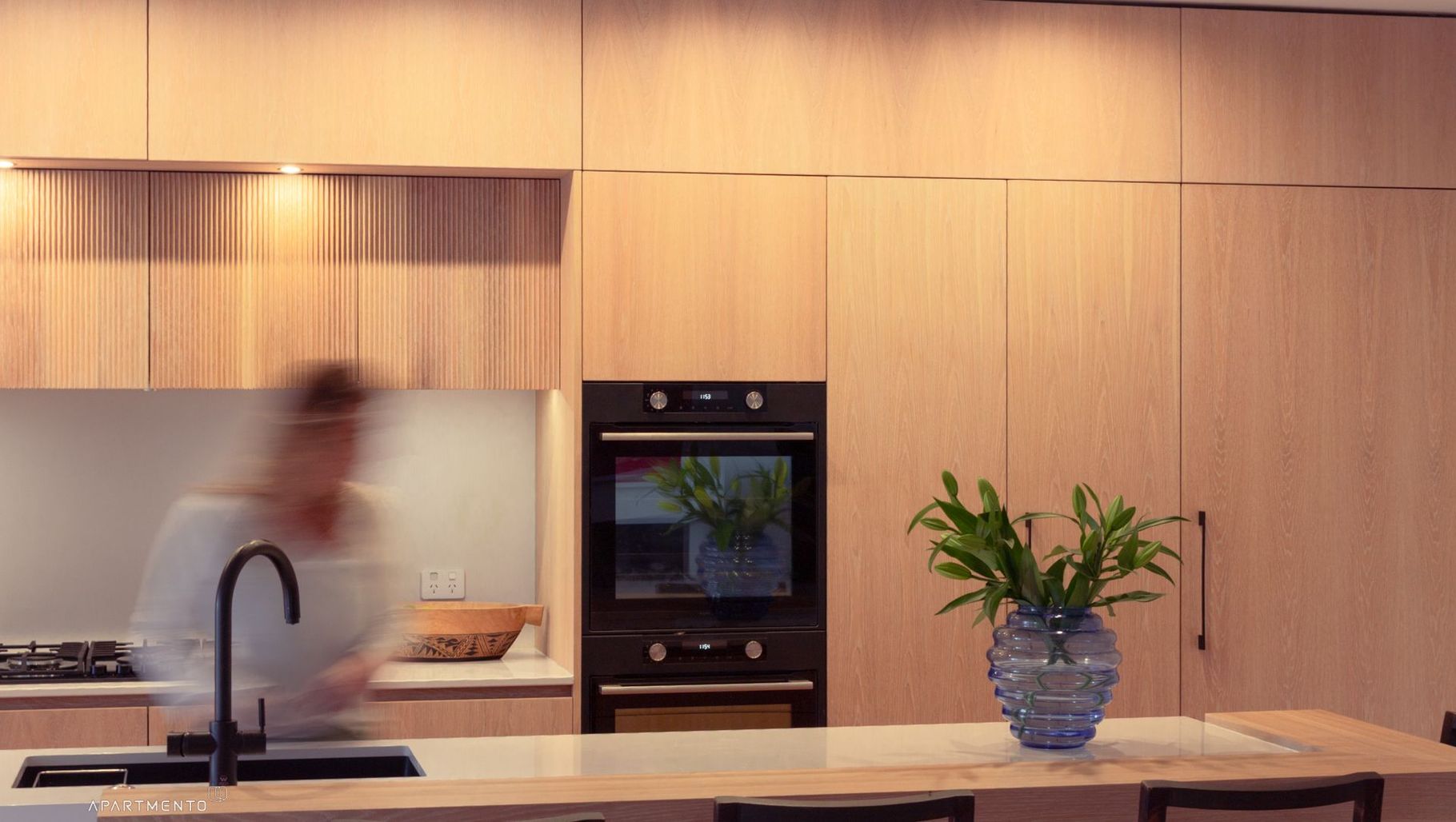 To balance function with style, Apartmento integrated two large pantries, an island bench with water filtration, and various hidden storage—all without compromising the design intent.