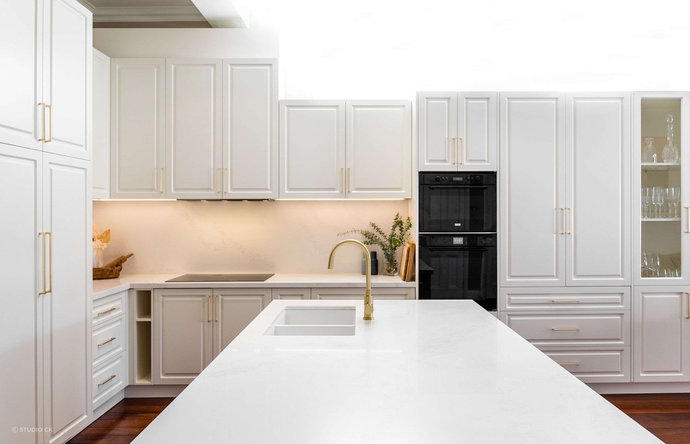 Adjacent to the breakfast nook, we thoughtfully incorporated a drinks cabinet where all of their entertainment glassware is meticulously stored. Positioned conveniently near the living area, this space not only fulfills a practical purpose but also serves as an elegant display cabinet for their exquisite glassware collection, adding a touch of sophistication to the overall design. To maintain the minimalistic aesthetic our clients desired, we opted for brass-coloured hardware and tapware. This choice not only complements the overall design but also harmonises with the aesthetic of the entire house, creating a cohesive and appealing visual narrative.