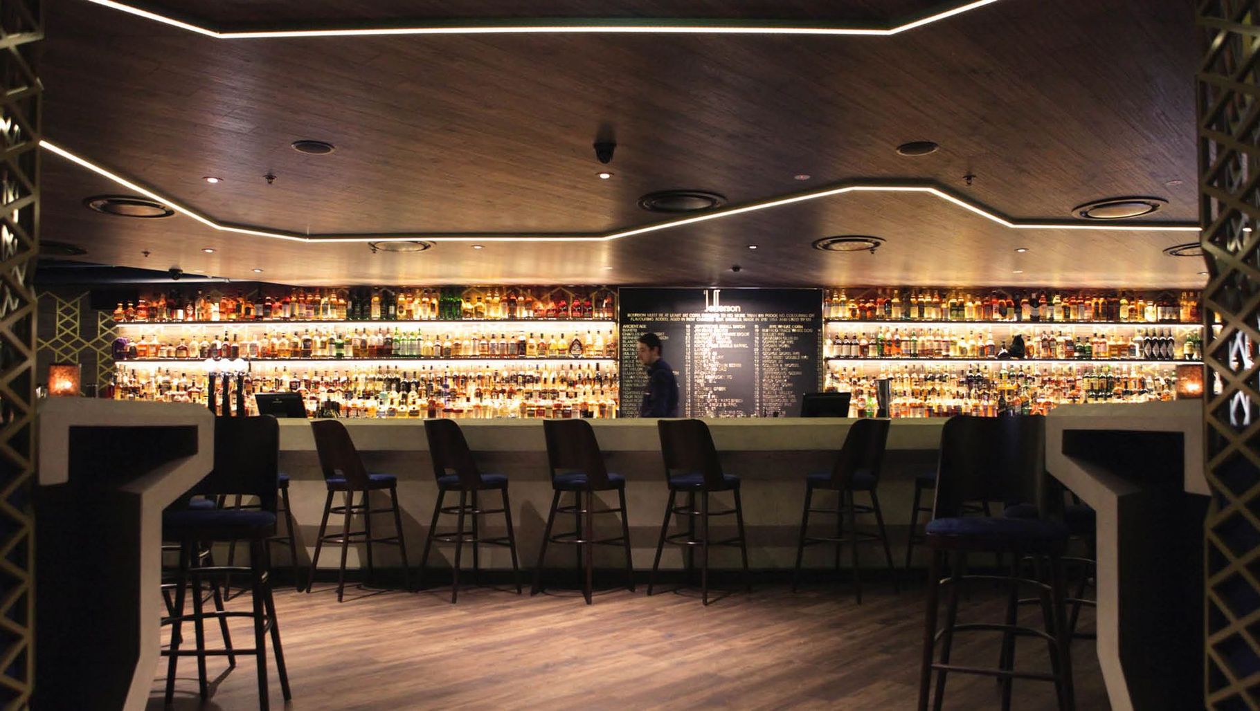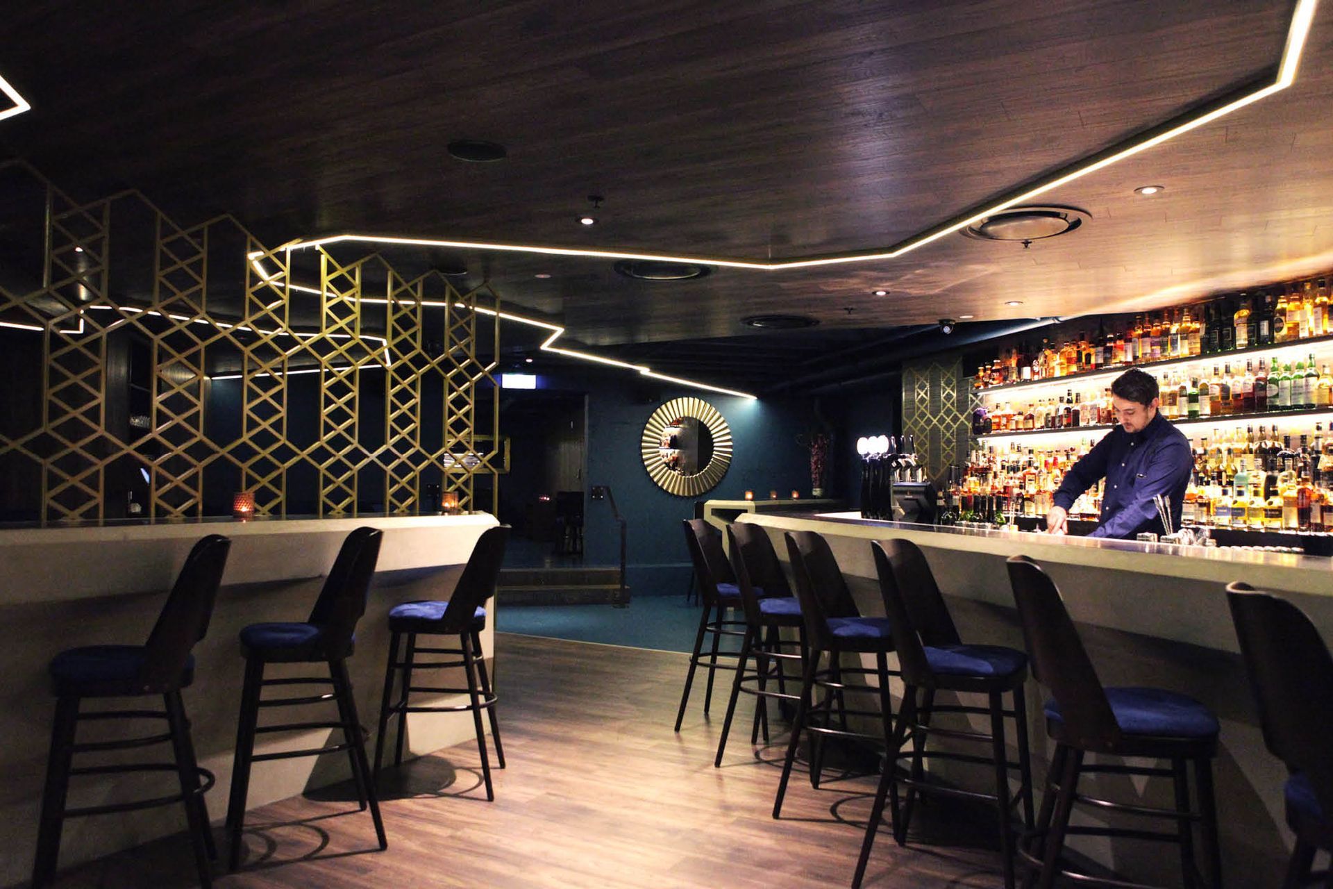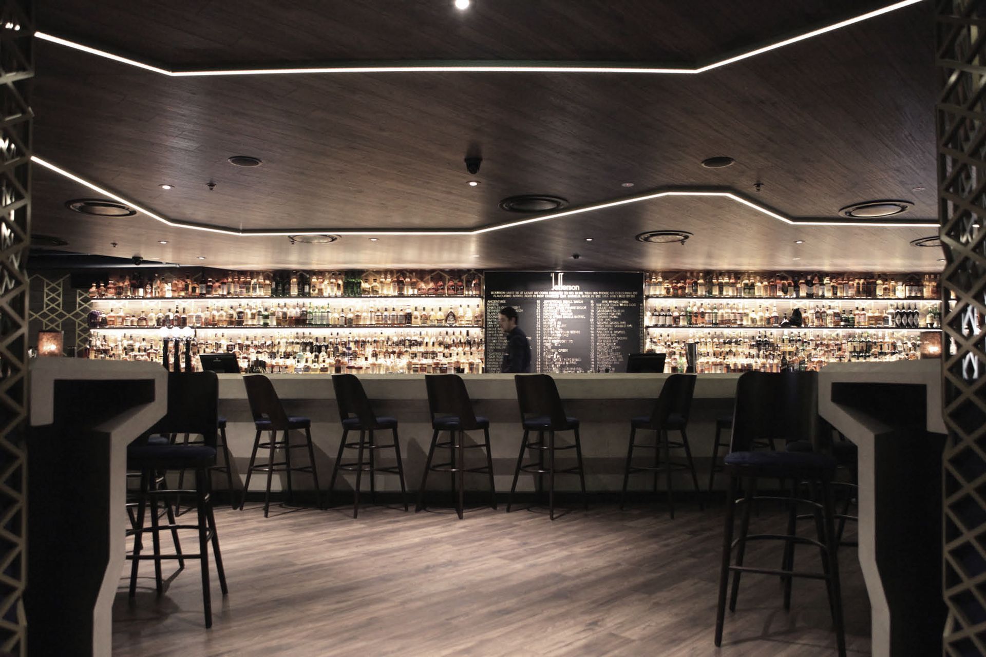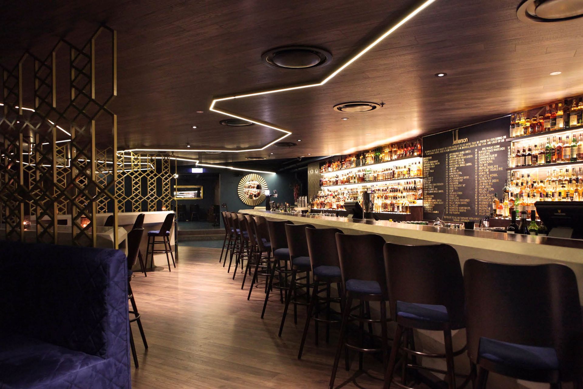 ArchiPro Project Summary - The Jefferson: A unique whiskey bar experience featuring a concrete bar, rich blue walls, timber ceilings, and intimate spaces, transforming a service basement into a vibrant destination for whiskey enthusiasts at 7 Fort Lane, Britomart, Auckland.