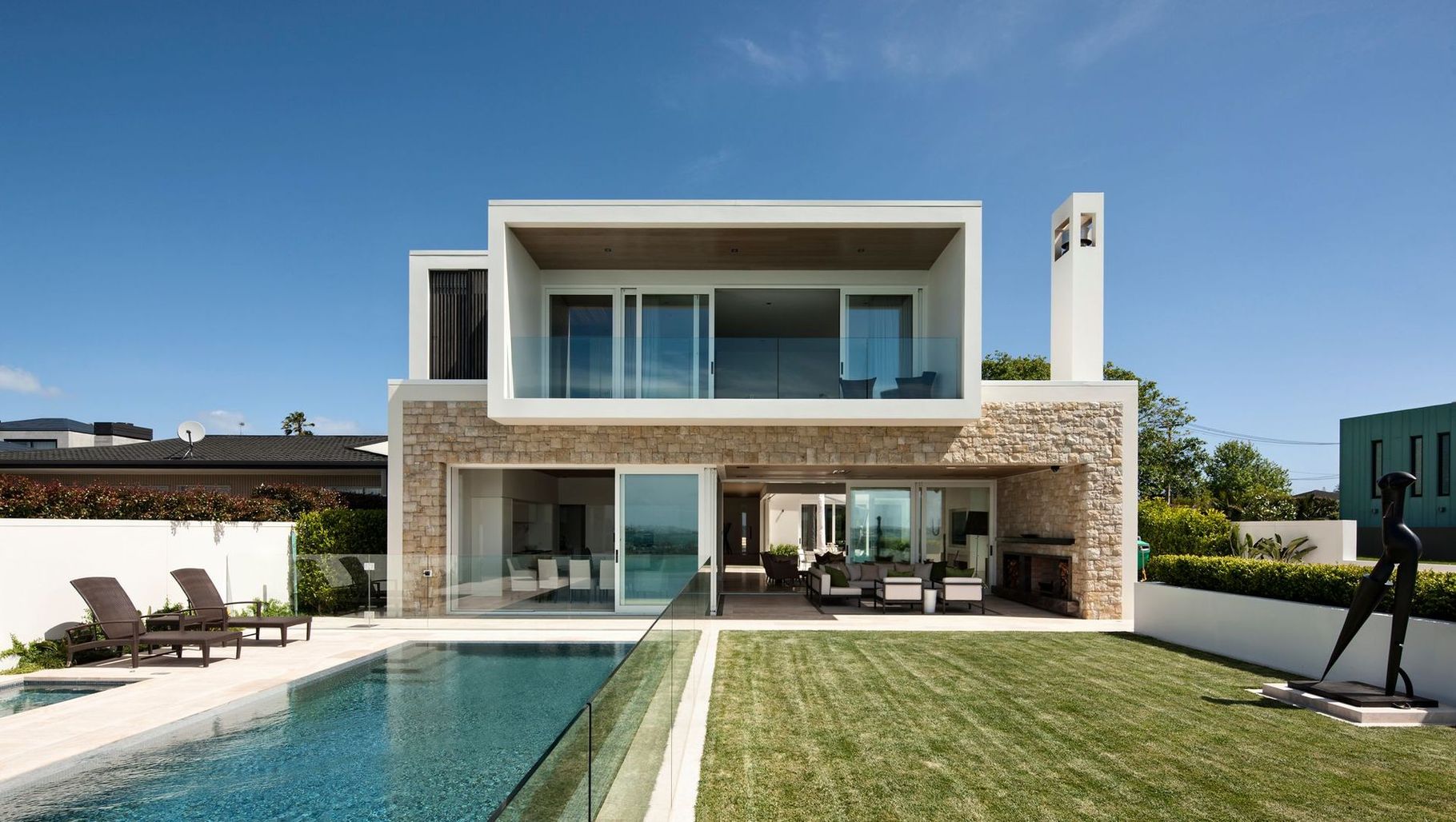 ArchiPro Project Summary - The Limestone House: A modern architectural marvel in Remuera, featuring a stunning pool that extends from the home, supported by innovative engineering solutions to enhance cliffside views.