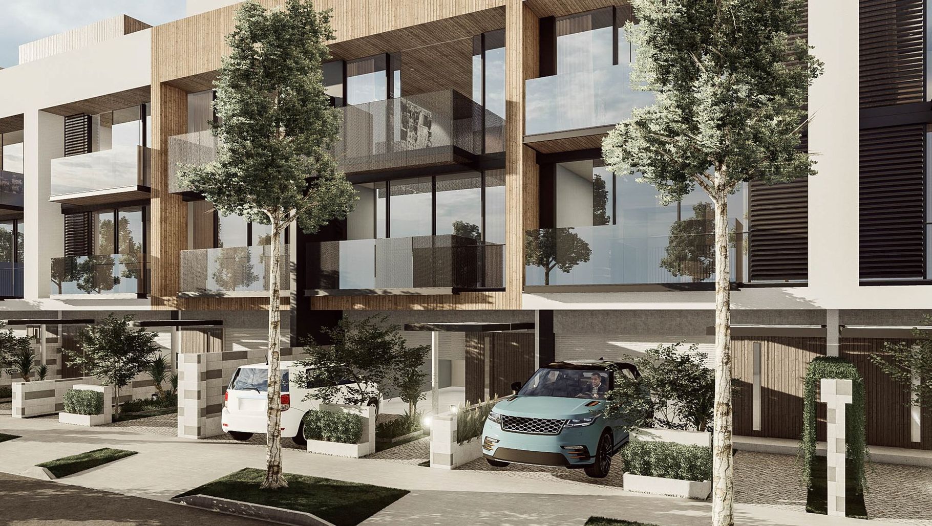 ArchiPro Project Summary - The Links: A series of three-storey townhouse developments featuring minimalistic exteriors, optimized living spaces, and vibrant community landscaping with white birch timber cladding and painted finishes.