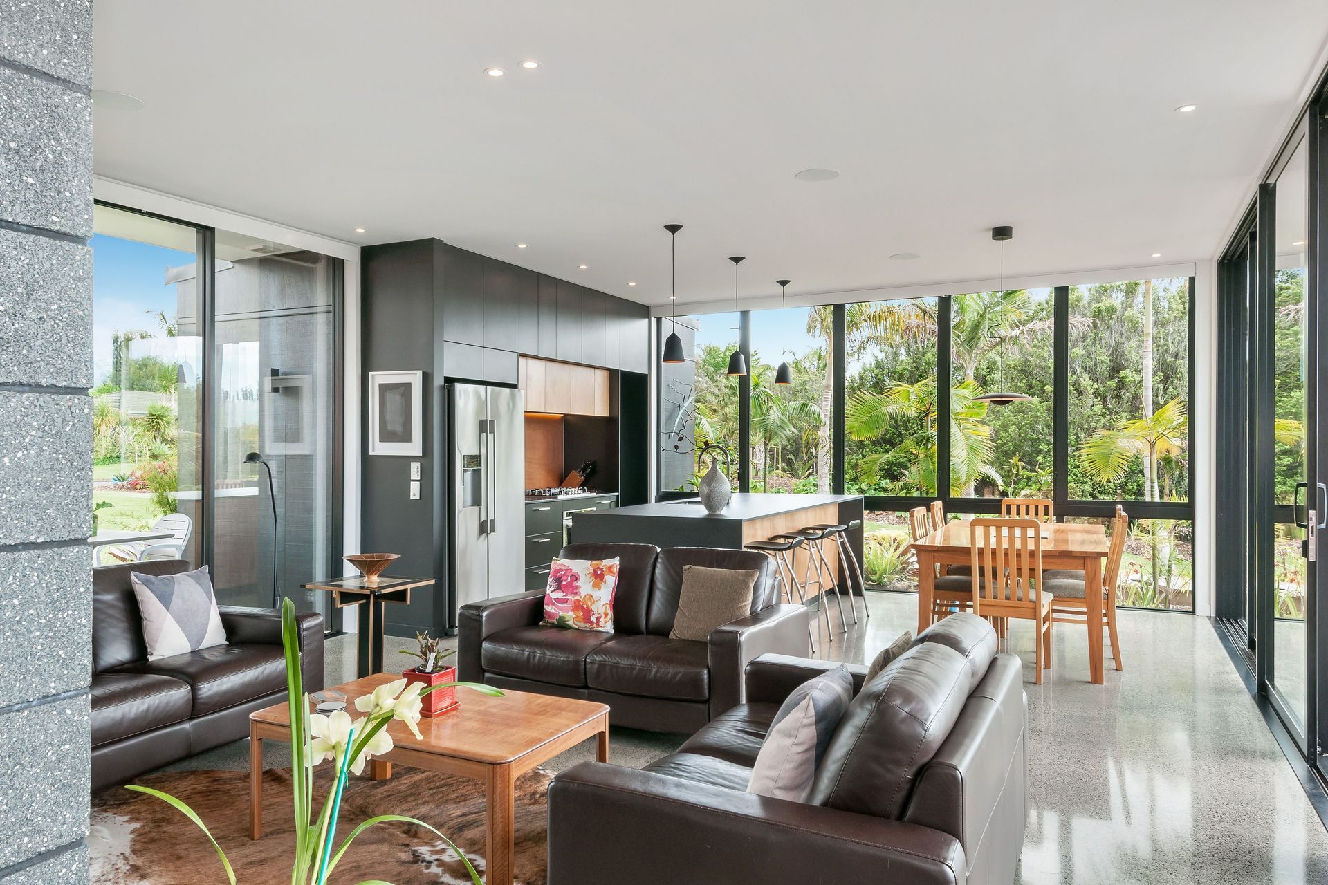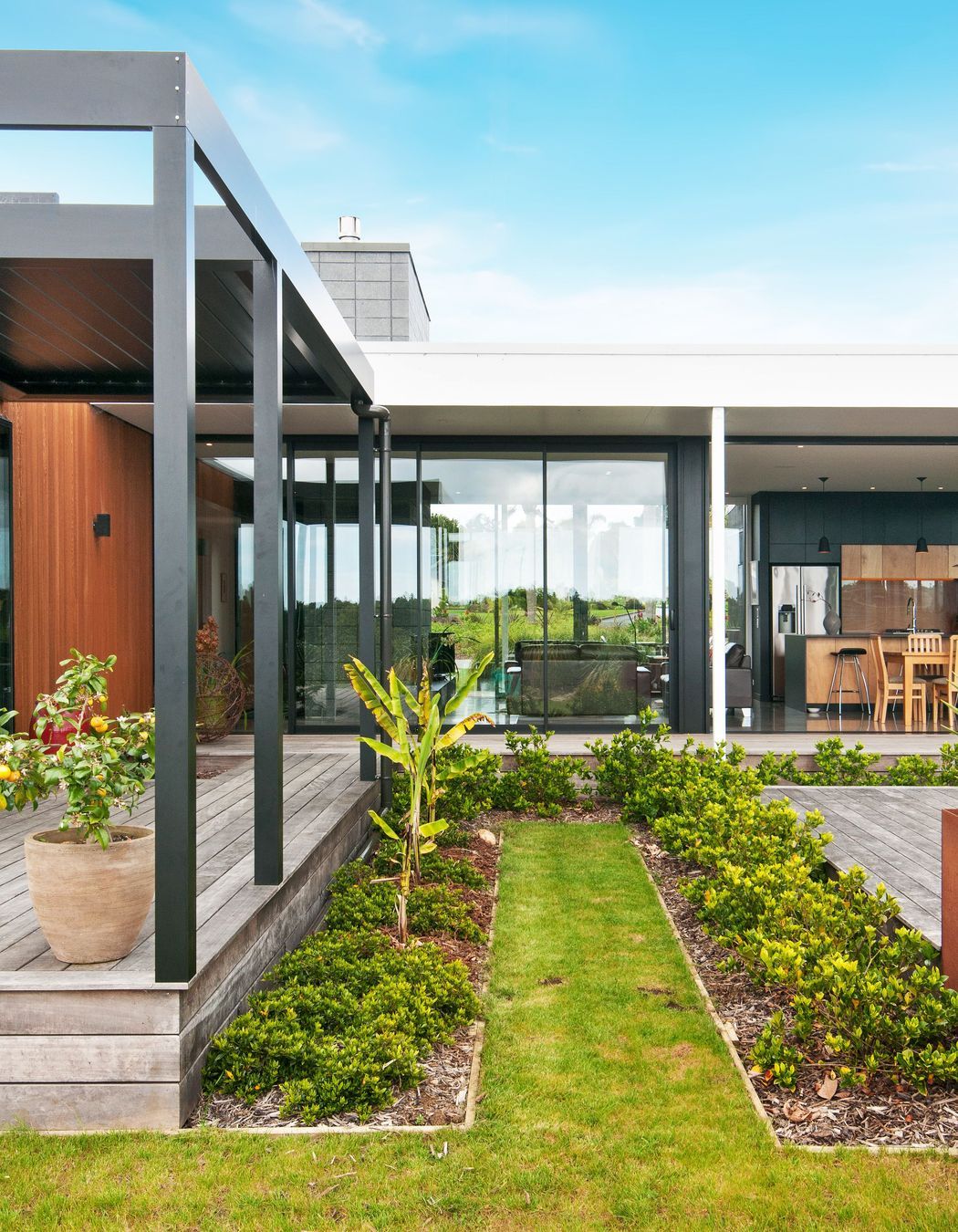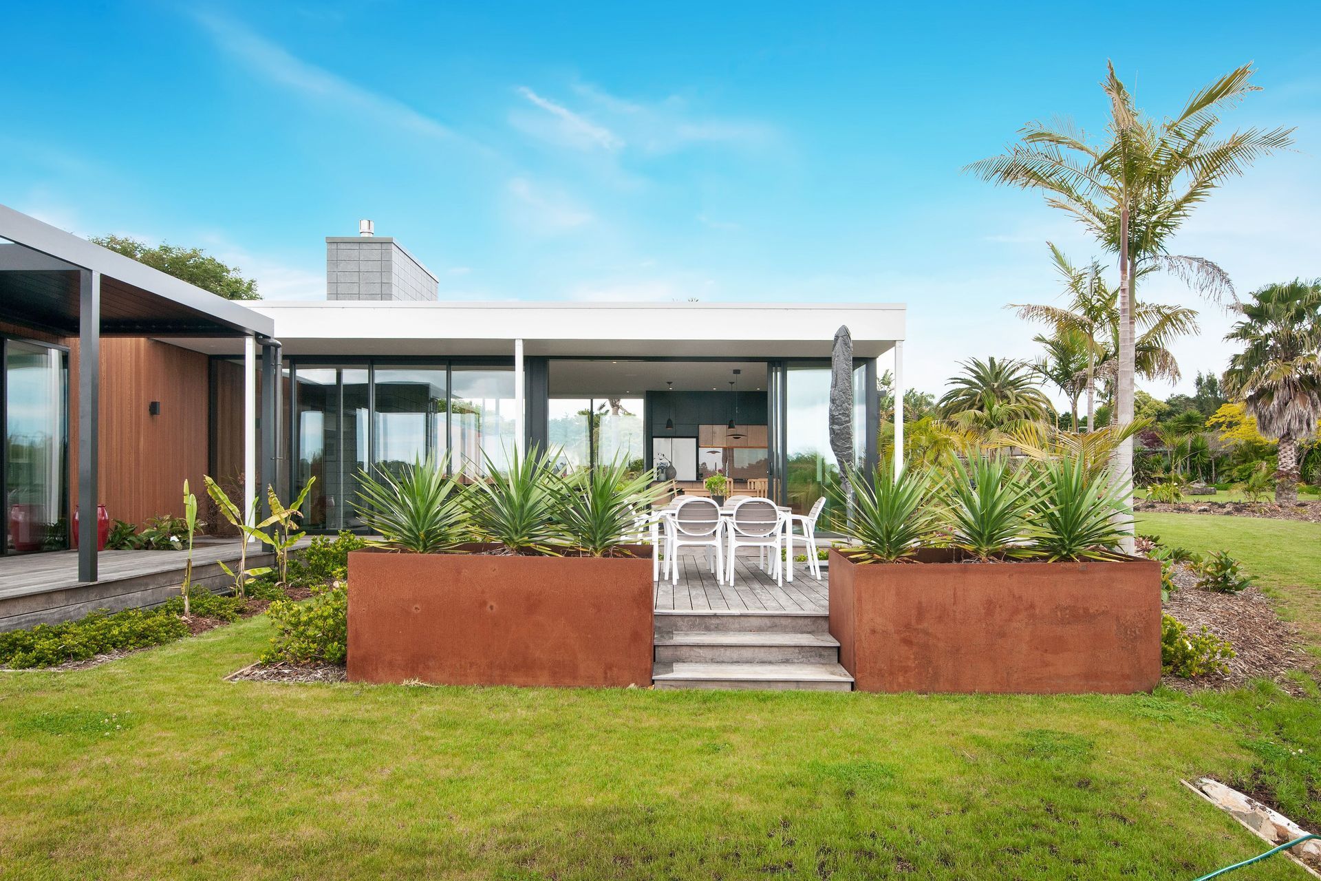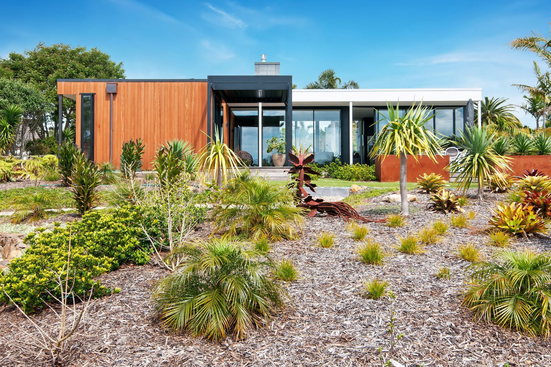 ArchiPro Project Summary - A stunning Kerikeri home inspired by Californian desert architecture, featuring strong horizontal lines, expansive glass walls, and a seamless connection to the outdoors, designed for a semi-retired couple seeking sun-filled living.