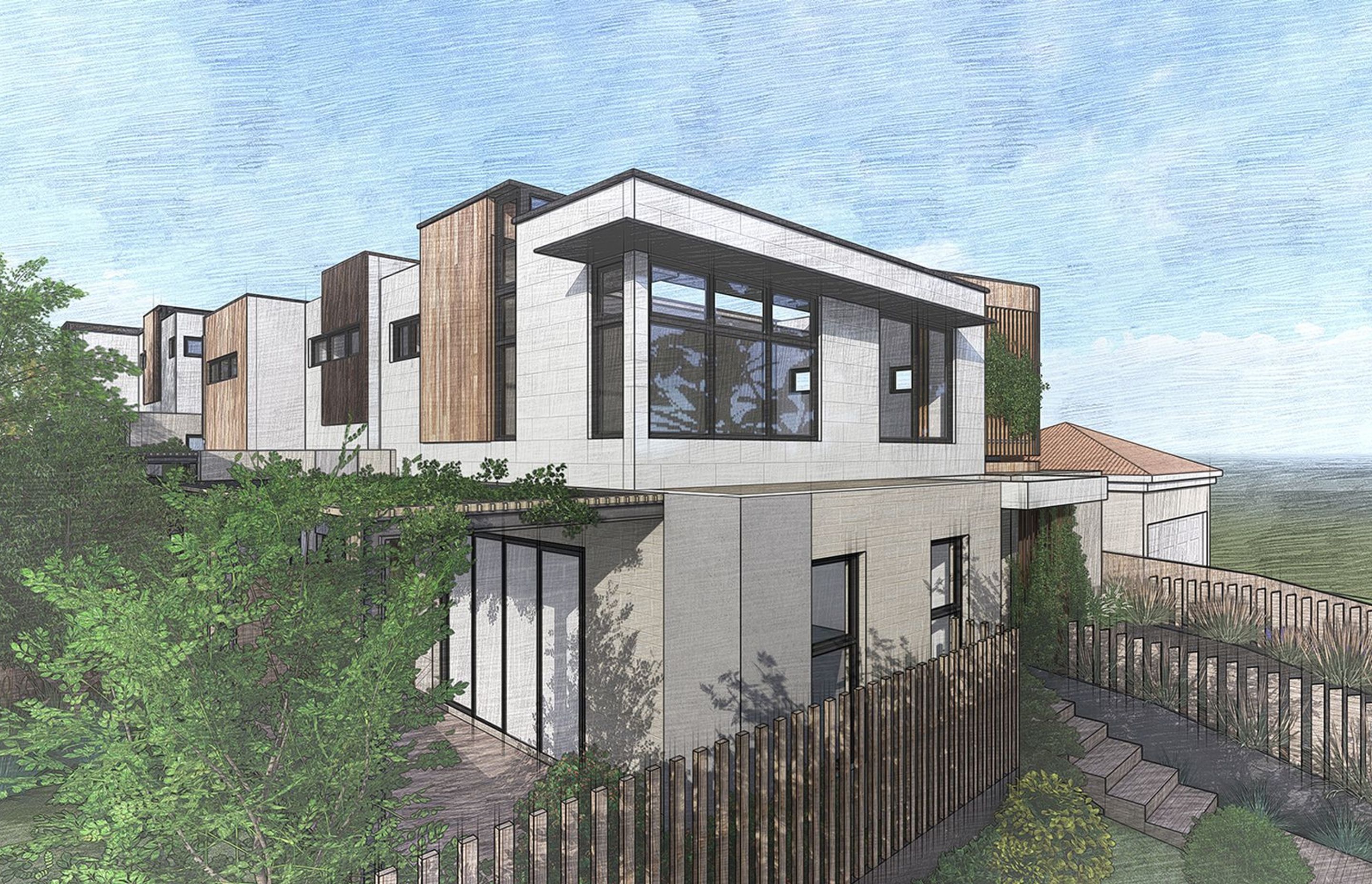 ArchiPro Project Summary - The Oligo: A double storey townhouse development harmonizing modern living with natural elements, featuring timber screens, soft curves for natural light, and sustainable landscaping for enhanced well-being.